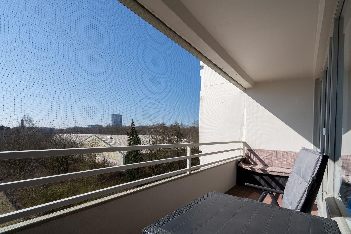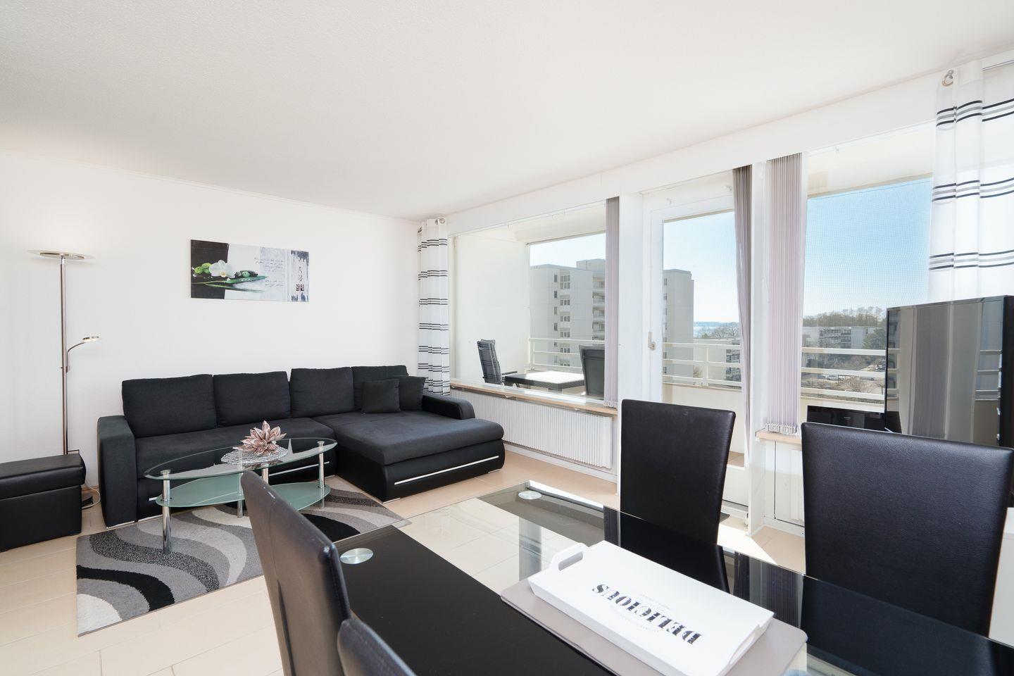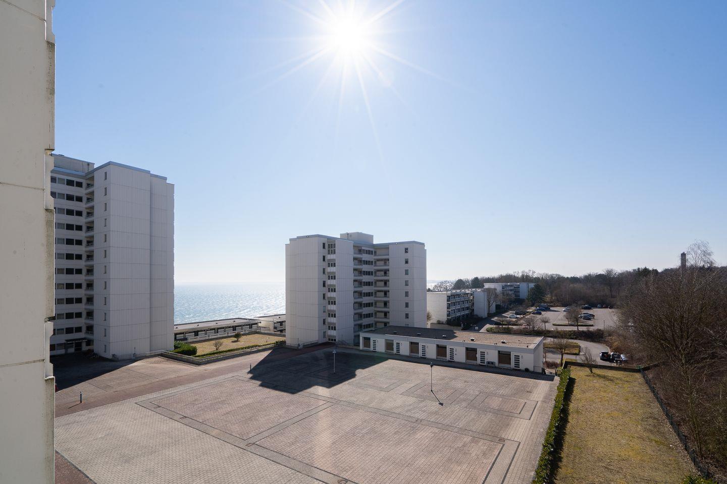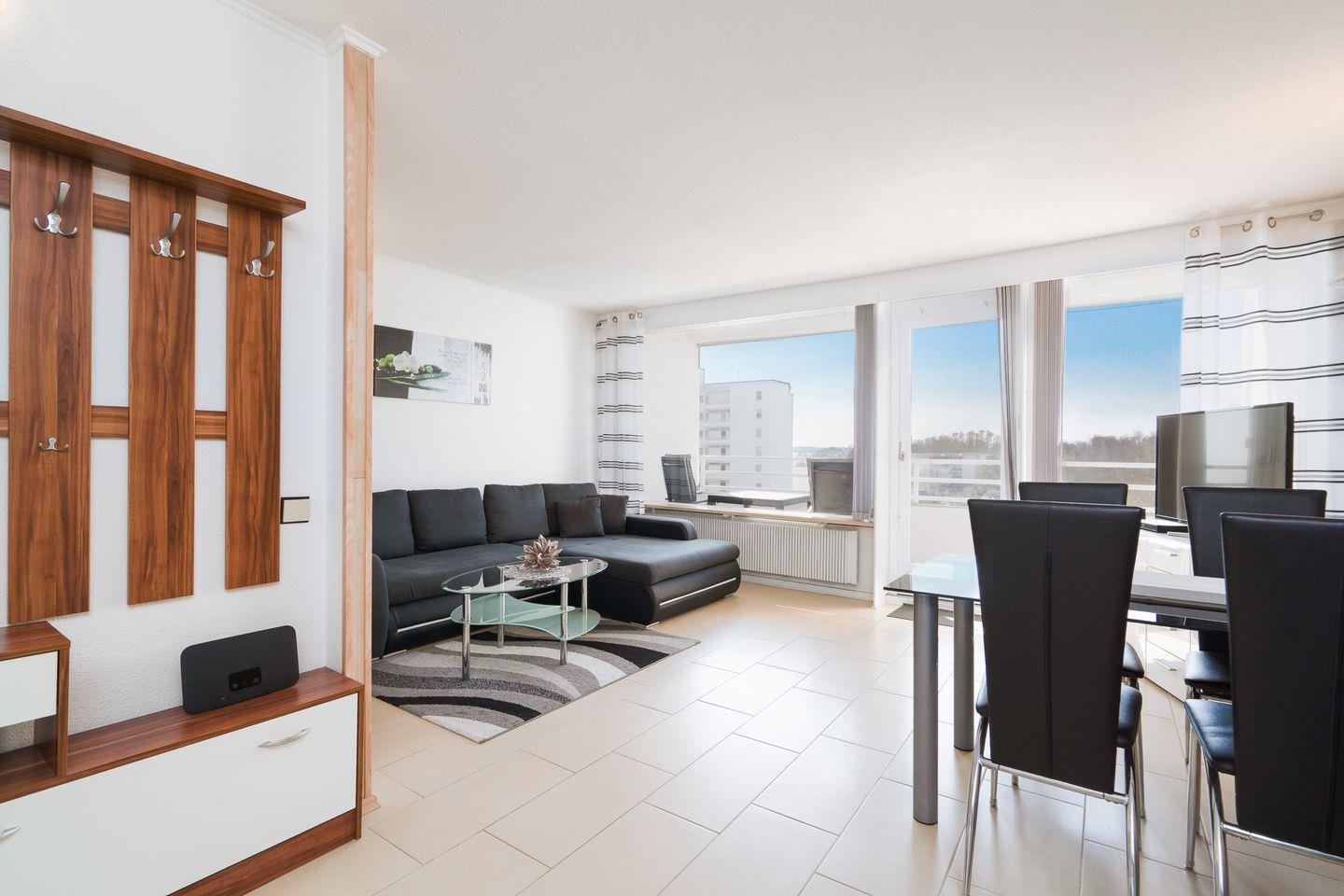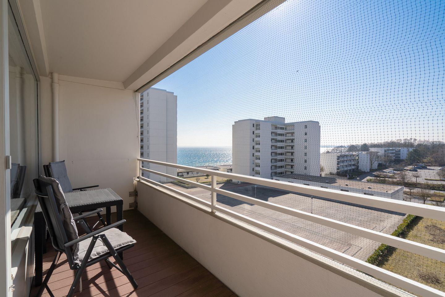 Helle 1-Raum-Ferienwohnung mit Balkon und Blick auf die Lübecker Bucht, nur wenige Schritte vom Strand entfernt.