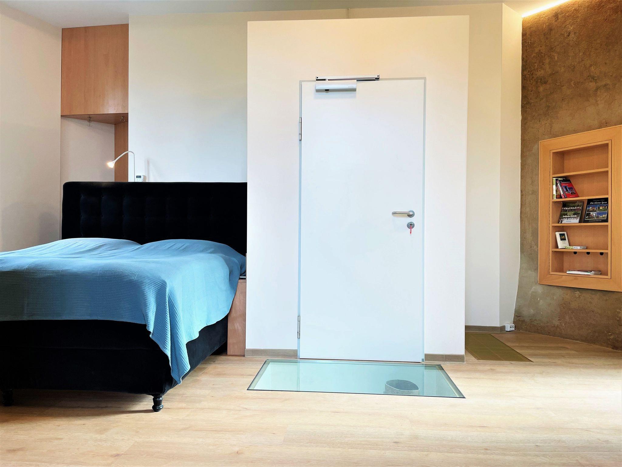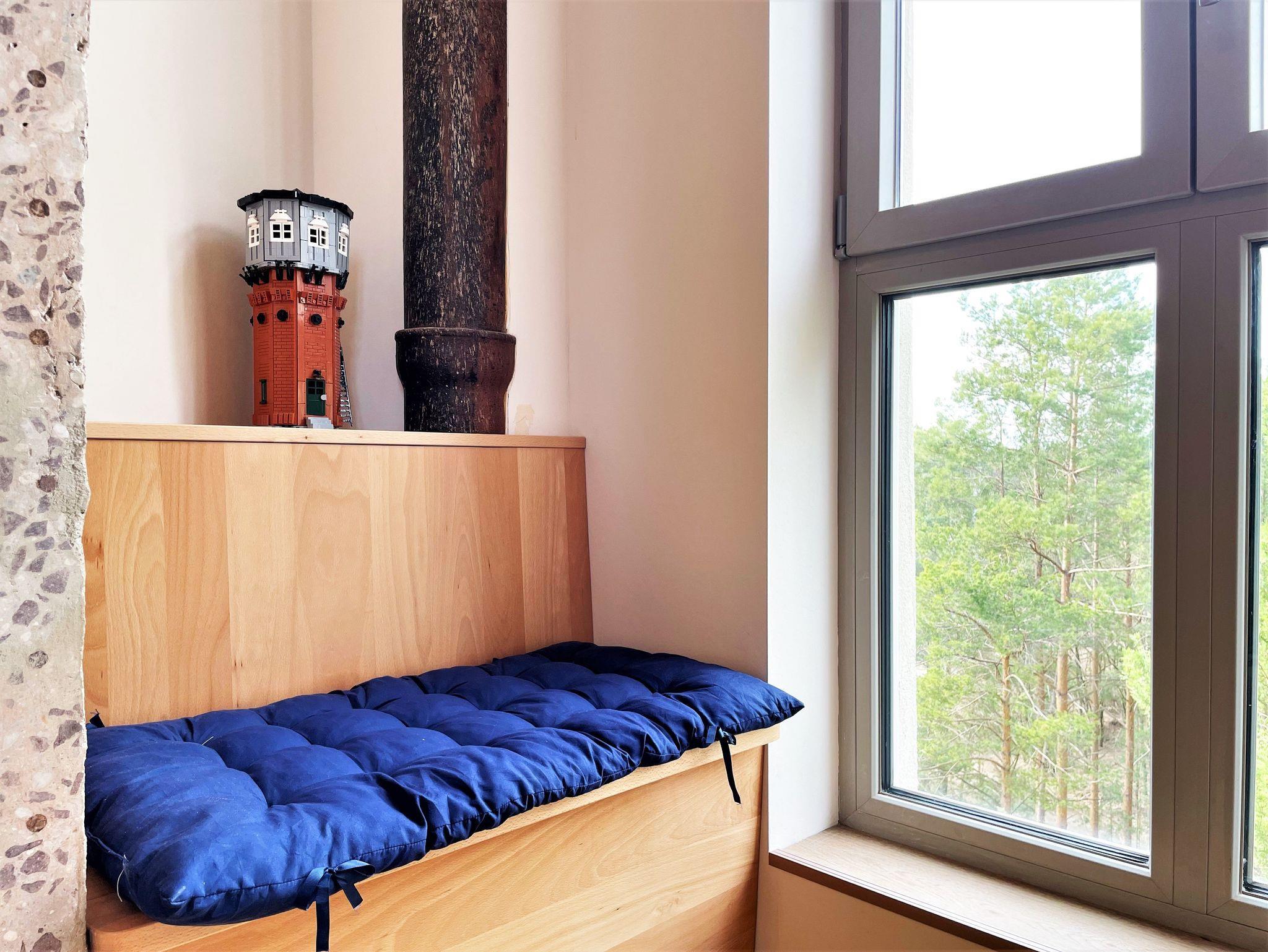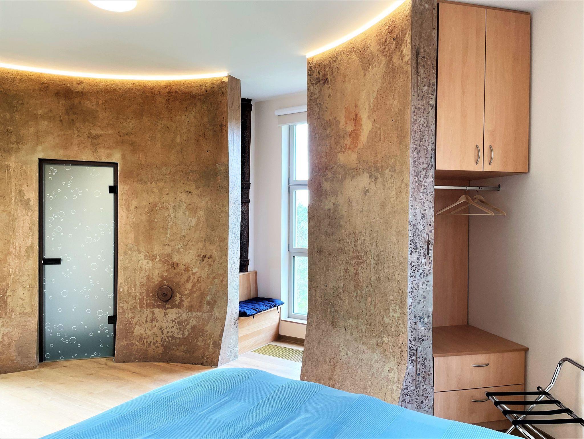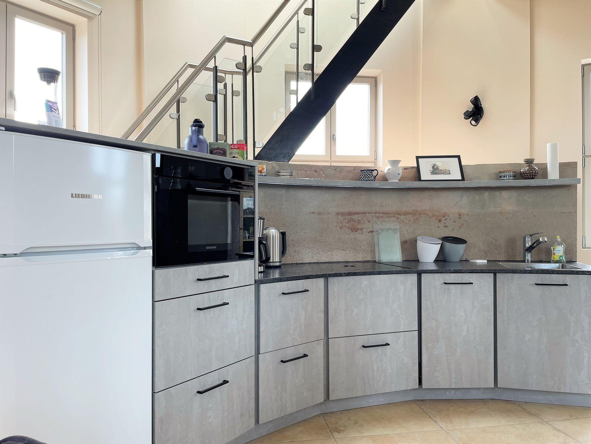 Ein Wasserturm von 1957 wurde ausgebaut zu einer Ferienwohnung für bis zu 10 Personen. Verteilt auf 3 separate, wohnungsähnliche Ebenen, die entweder über einen Fahrstuhl oder eine Wendeltreppe begehbar sind. Historische Elemente des Wasserturms sind noch erlebbar, in hohen Räumen haben Sie eine direkte Aussicht in die umstehenden Bäume.