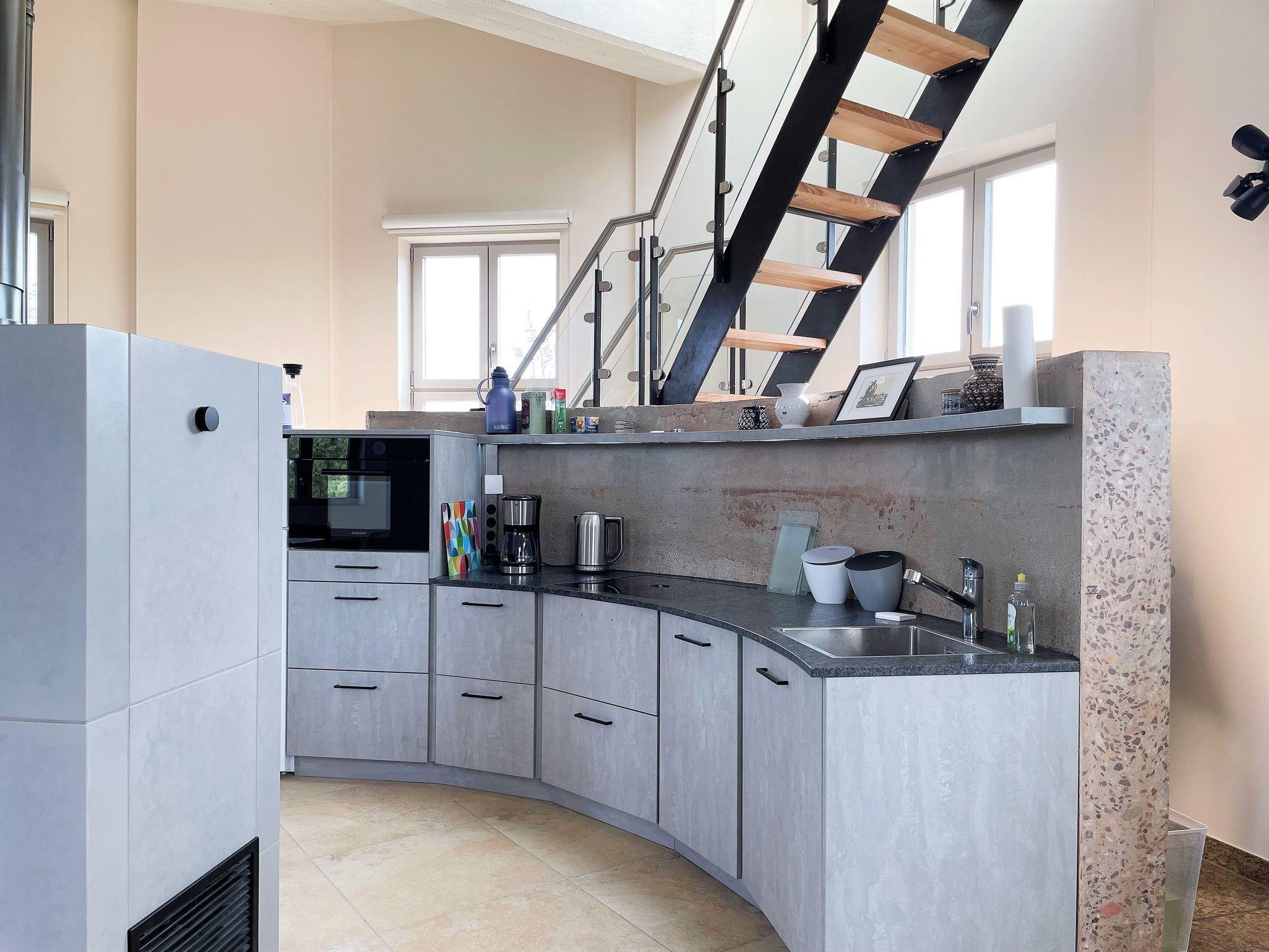 Der Aufzug fährt bis zur 4. Ebene, von hier aus müssen Gäste einige Stufen nach oben steigen und gelangen nun in den großen Aufenthaltsraum mit angepasstem Küchenmobiliar. Ein großer Esstisch lädt alle Gäste an den Tisch. Zur Einrichtung gehören weiterhin ein Sofa und ein großer Kamin, der an kalten Tagen wohlige Wärme spendet.