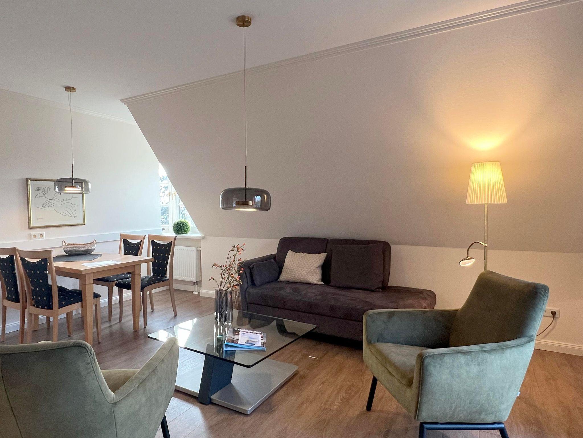 Eingangsbereich, Eingangsdiele mit Garderobe, großzügiger Wohn-Essbereich mit direktem Zugang auf einen Balkon mit Gartenmöbeln, zusätzlich im Dünengelände eine große, durch Friesenwälle und Gehölze abgeschirmte Terrasse mit Gartenmöbeln und einem Strandkorb. Zwei Schlafzimmer mit Doppelbetten, zwei Duschbäder/WC. Separate Küche. Im Untergeschoss befindet sich eine Gemeinschaftssauna (Ruheraum, verschiedene Duschen, Fußbäder), Fitnessraum, Tischtennis. Im Außenbereich: ein Spielplatz für die Kleinsten, Stellplatz, Fahrradständer.