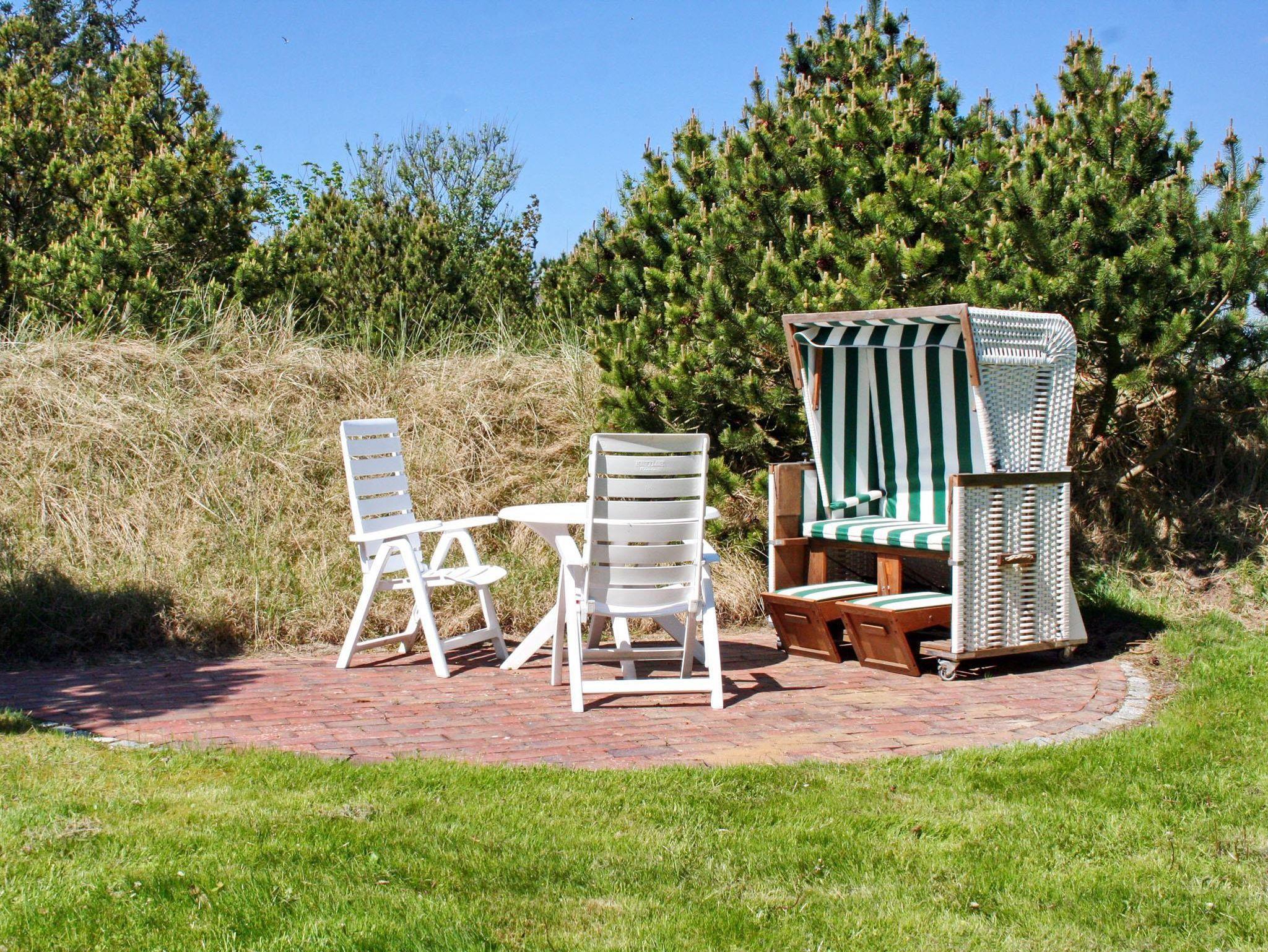 • Terrasse mit Gartenmöbeln und Strandkorb im Gartengelände umsäumt von Dünen.