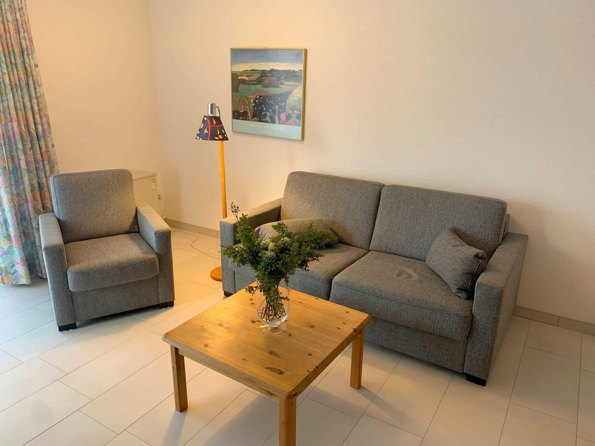 Schlafmöglichkeiten: Entspannen Sie sich auf der gemütlichen Schlafcouch im Wohnzimmer oder im komfortablen Doppelbett im Schlafzimmer.