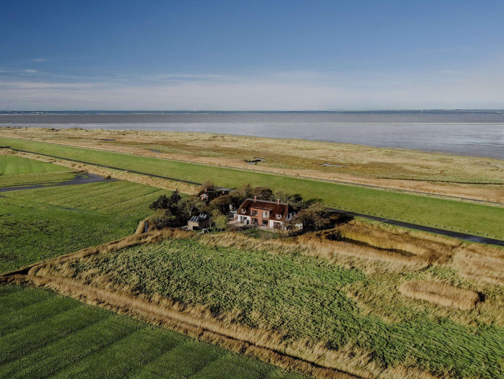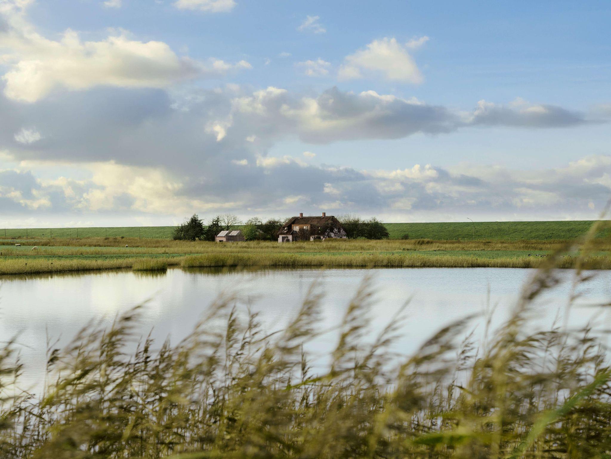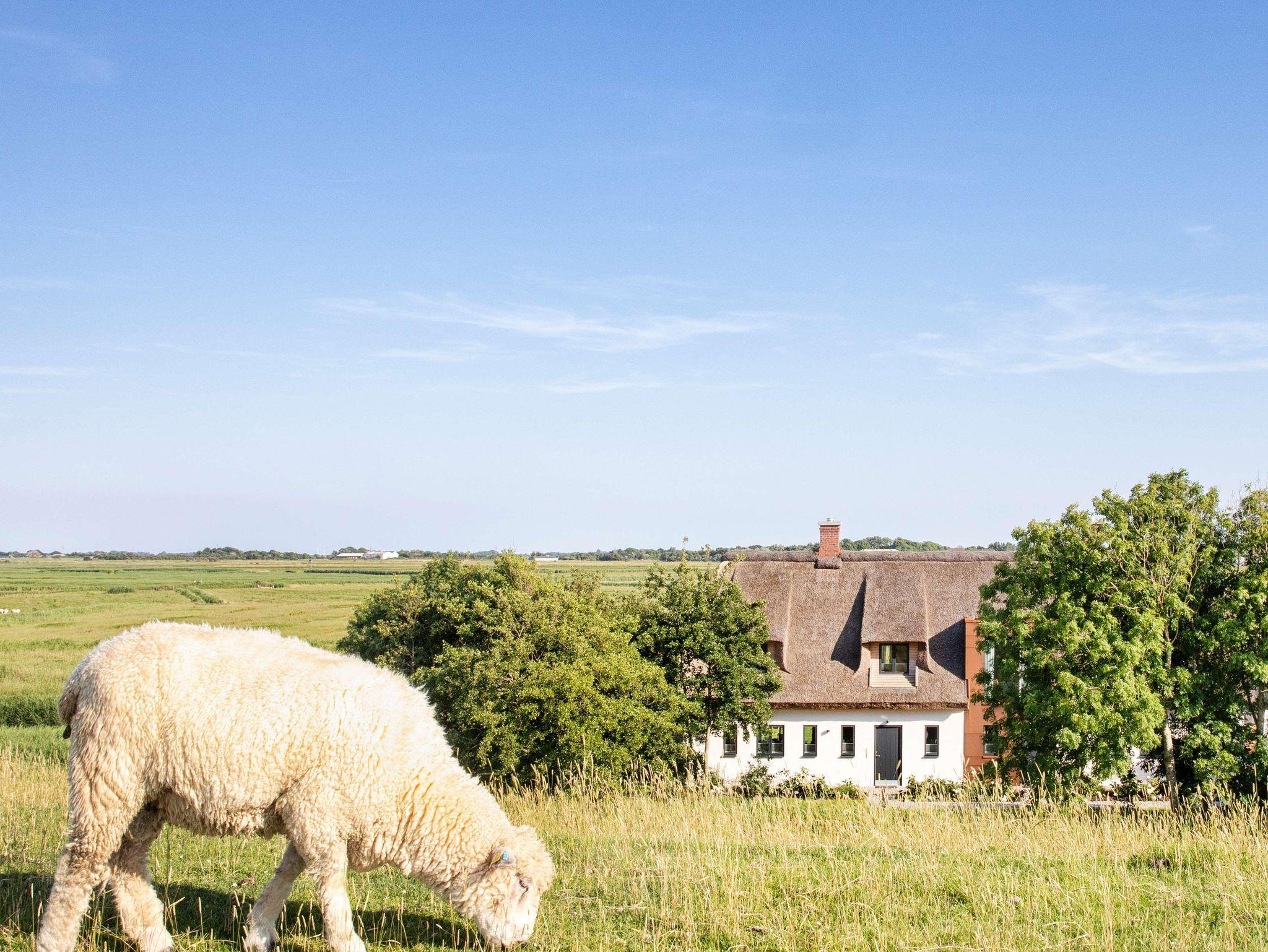 Der großzügige Wohnraum öffnet sich nach Süden und Westen mit bodentiefen Fenster- und Türelementen zu einer weiträumigen Holzterrasse und schafft so einen fließenden Übergang zwischen Innen und Außen, zur Weite der Wiesenlandschaft Eiderstedts. Das norderdiekhuus mit der großen, sehr gut ausgestattete Küche, mit dem breiten Sofa am Fenster mit Weitblick sowie den drei sehr gemütlichen Schlafzimmer im Obergeschoss, eins davon mit Bad en suite, bietet Platz für bis zu sechs Gäste. Die Ferienwohnung ist komplett mit Fussbodenheizung ausgestattet.
