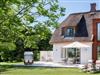 Wohnbereich mit Kamin, großer Couch und Esstisch mit sechs Stühlen. Vollständig ausgestattete Küche mit (u.a. Induktionsherd, Backofen und Kühlschrank).