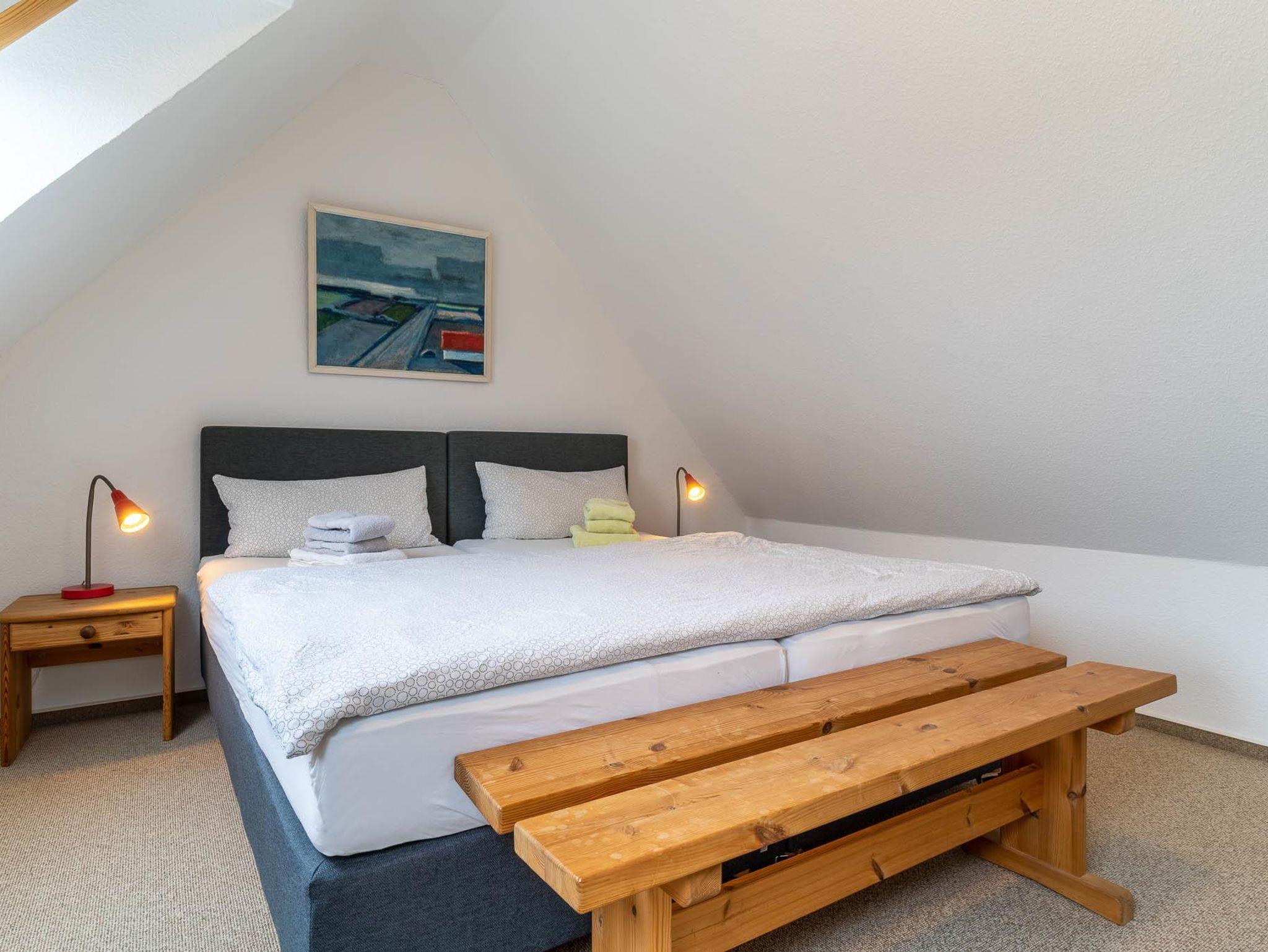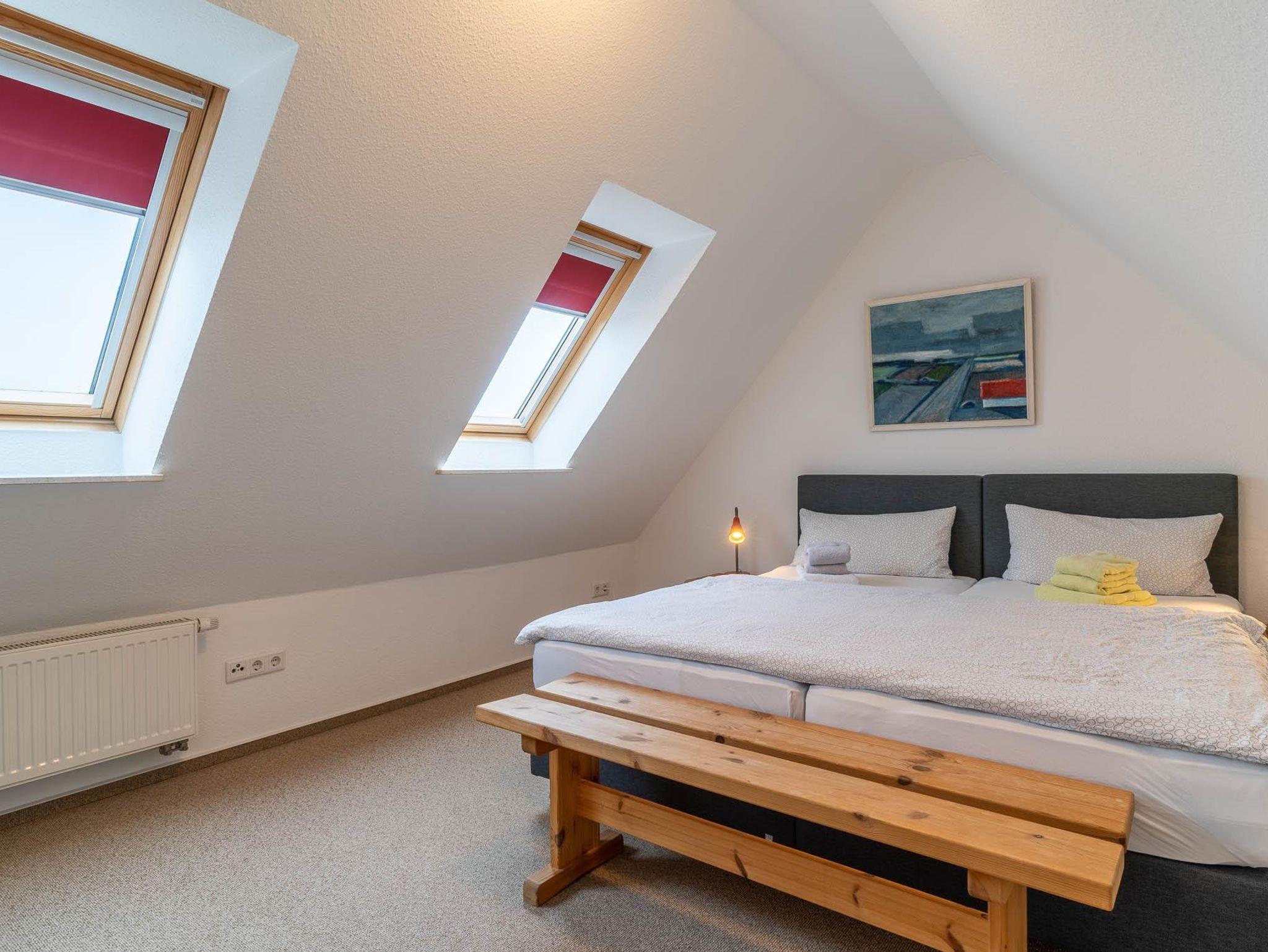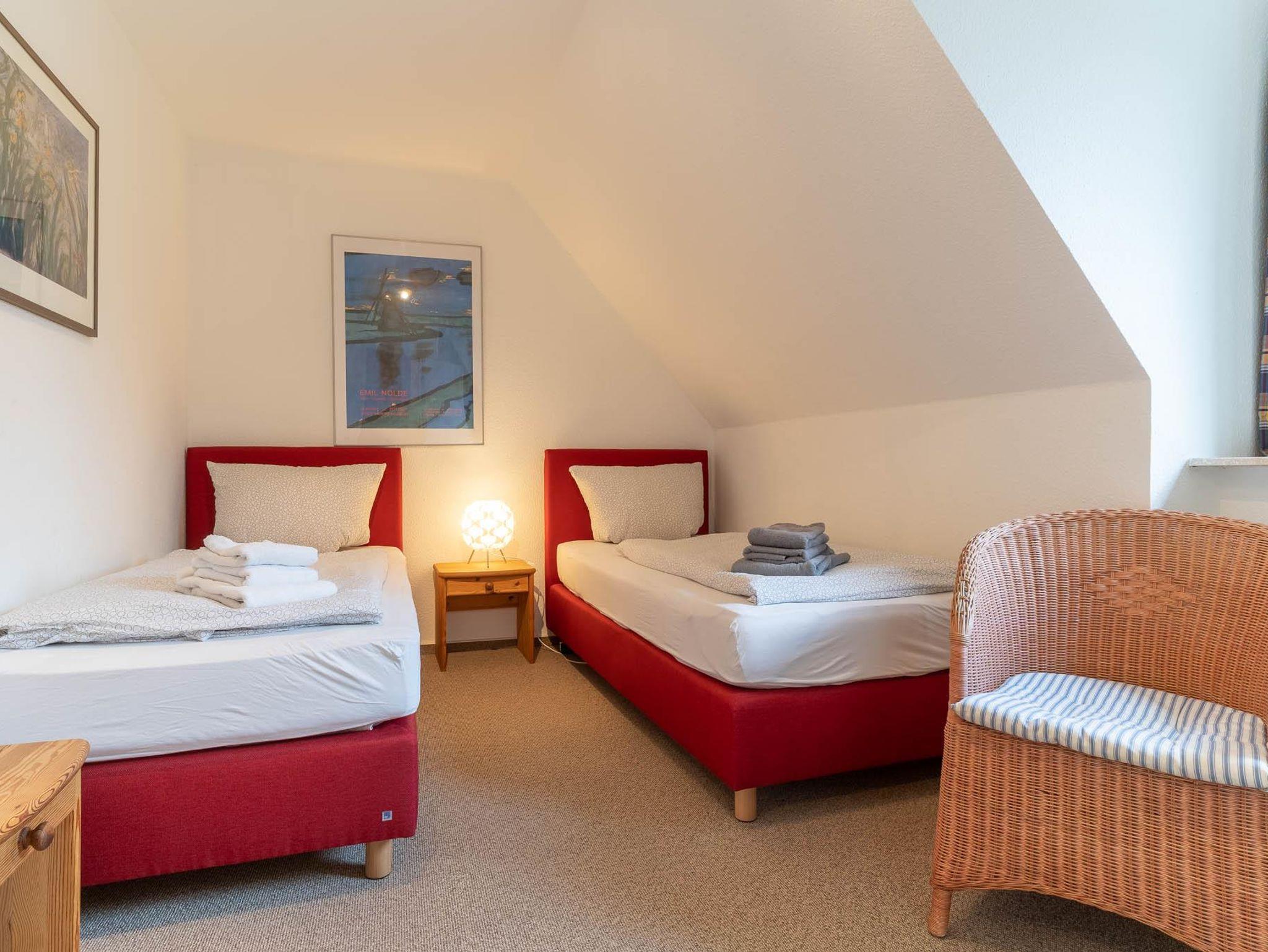 Vom Flur erreicht man über eine Treppe das Eltern- Schlafzimmer mit Doppelbetten (180 x 200cm). sowie Sitzecke mit Korbsessel und jetzt neu mit einem zweiten Fernseher. Im zweiten Schlafraum, der vom Flur zu erreichen ist, stehen zwei Einzelbetten mit den Maßen 100 x 200cm. Eine weitere Treppe höher befindet sich der 3. Schlafraum mit Doppelbetten (180 x 200cm). Hier haben Sie einen wunderschönen Blick über den Deich auf das Vorland und die Dünen. Das angrenzende Bad ist mit Waschbecken, Dusche, WC und beheizbarem Handtuchhalter ausgestattet. Das 2. Bad liegt im Erdgeschoß. Alle Betten verfügen über Lattenroste, Bandscheibenmatratzen und waschbaren Decken und Kopfkissen.