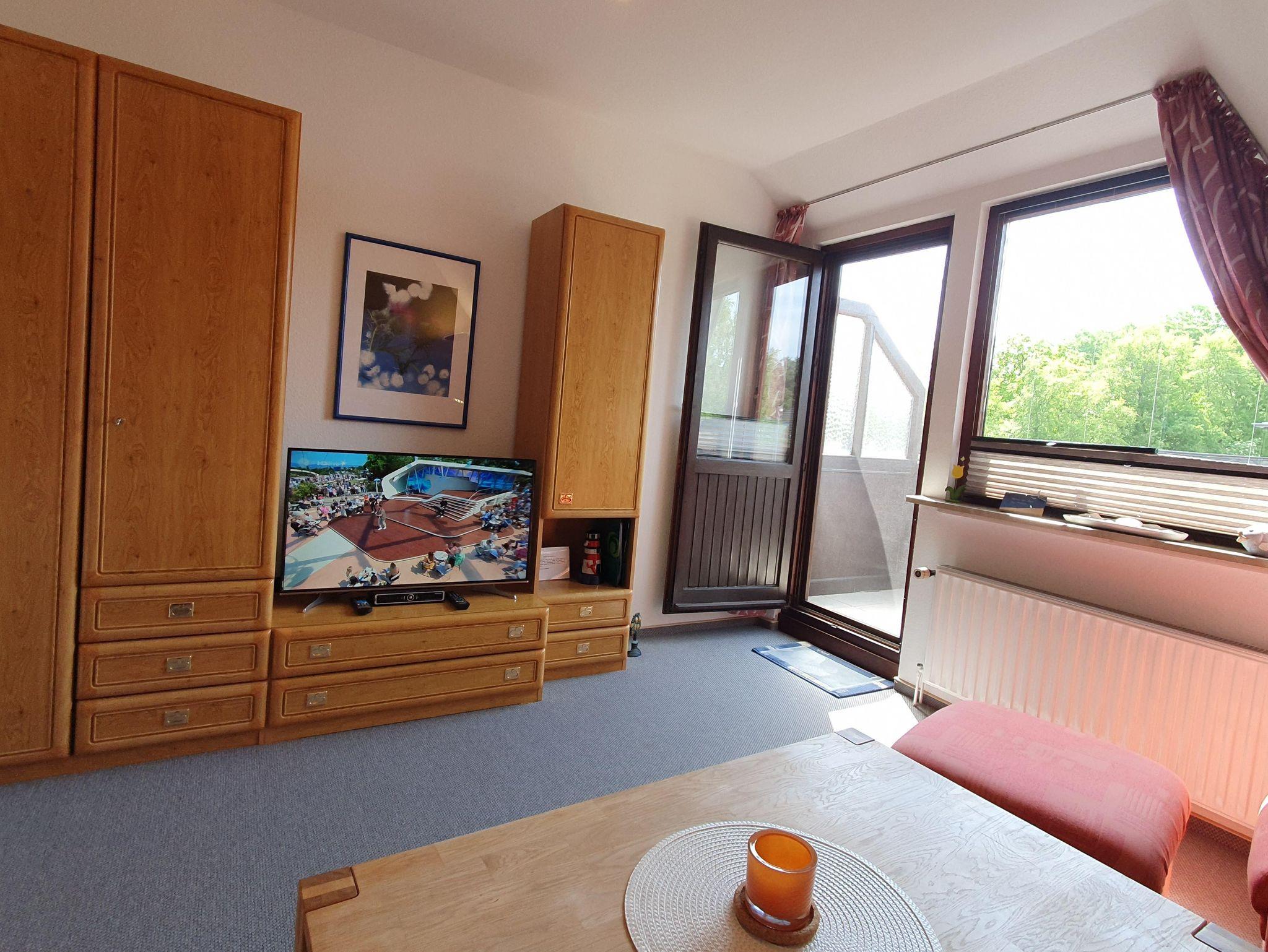 1 Wohnzimmer mit Couch, Flat-TV und Stereoradio mit CD-Player. W-LAN kostenlos. Kleiner Südbalkon zum sich wohlzufühlen.