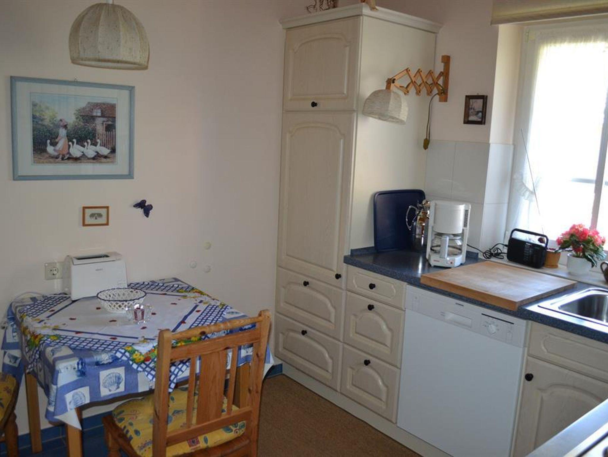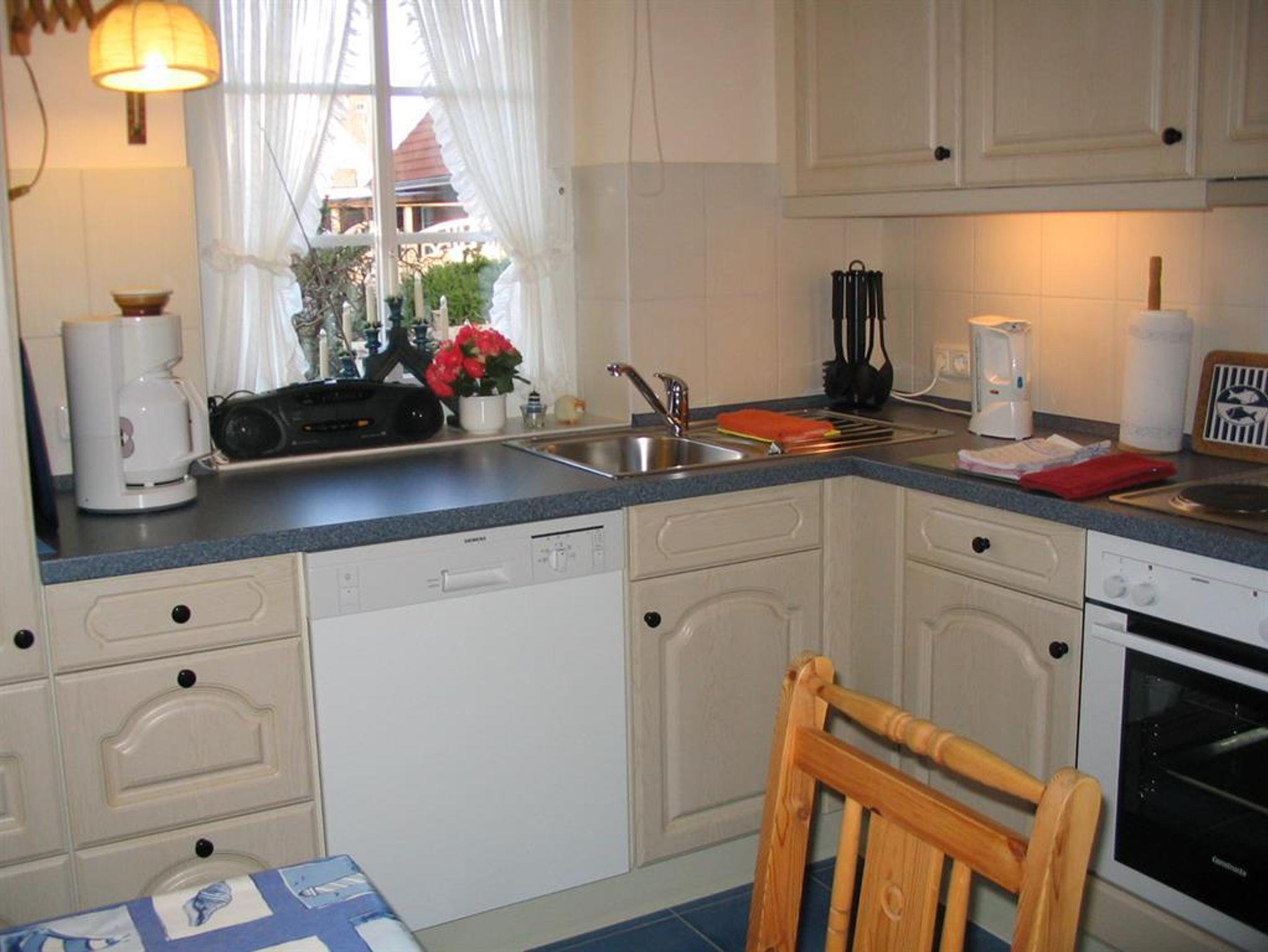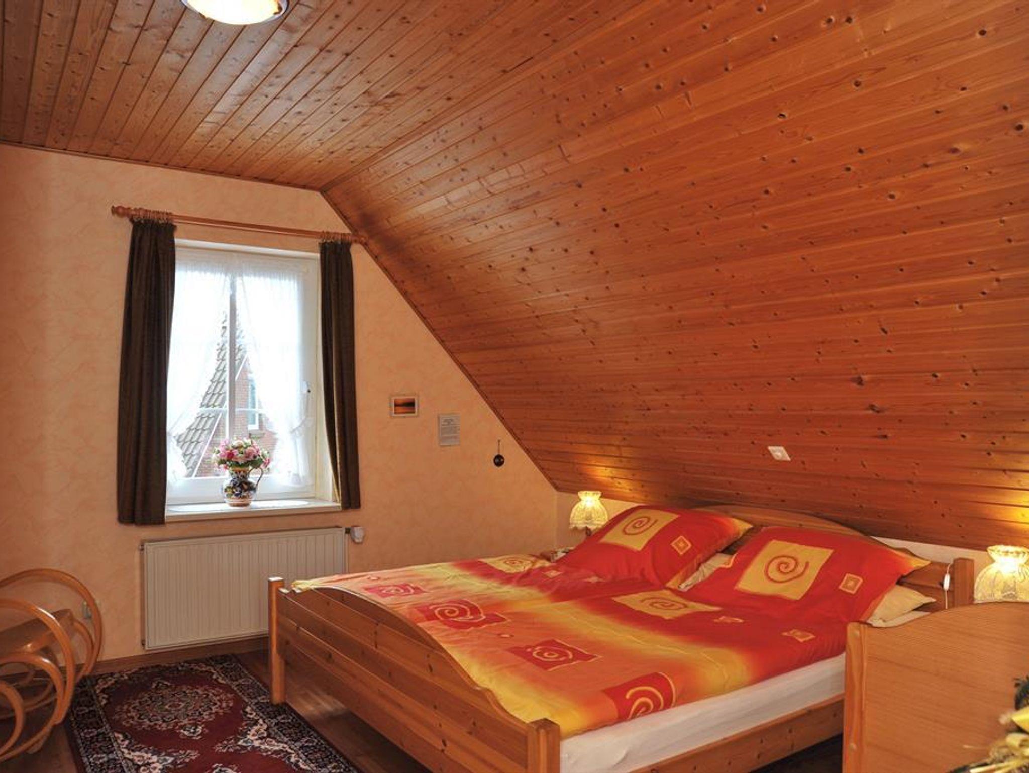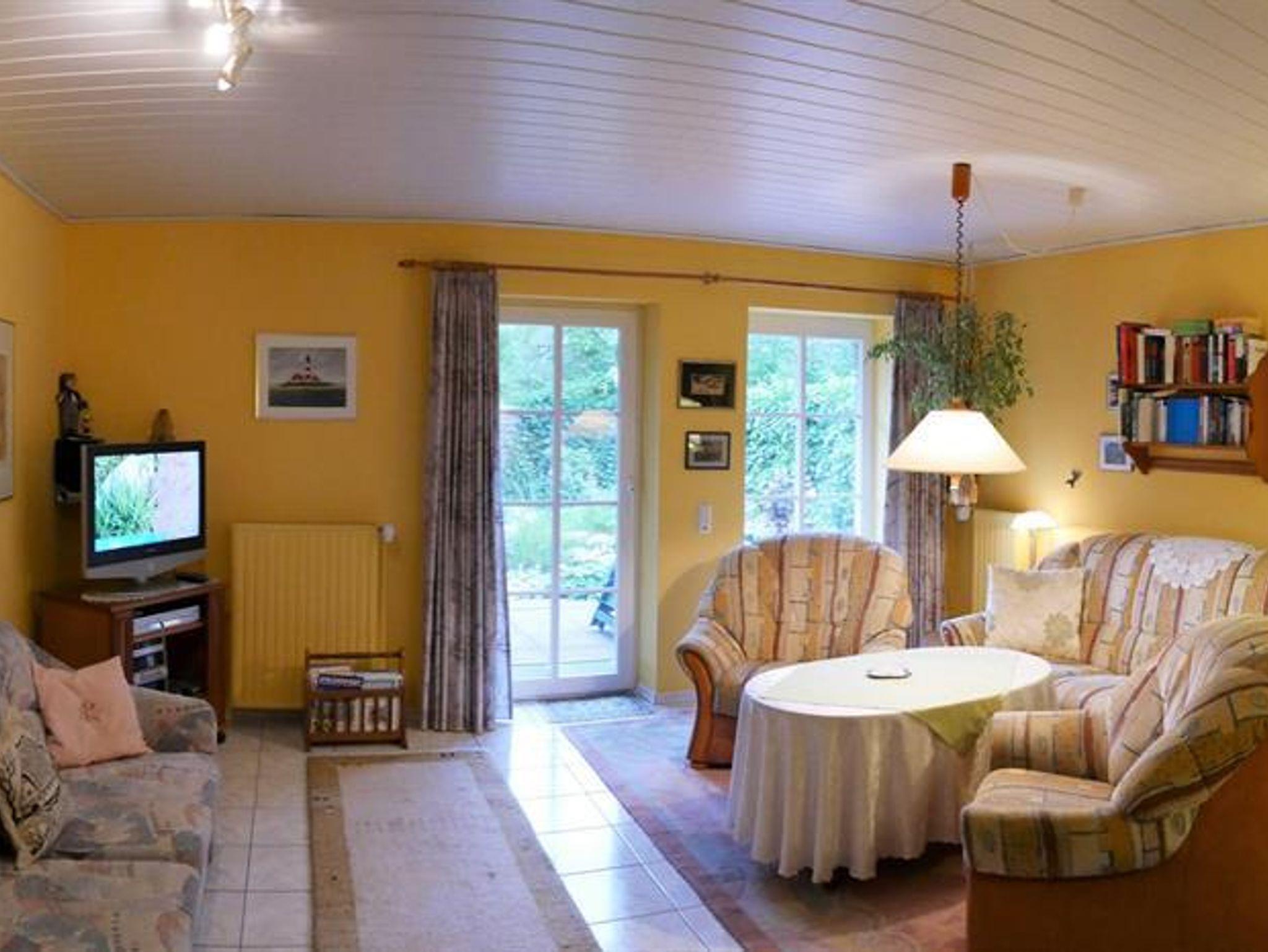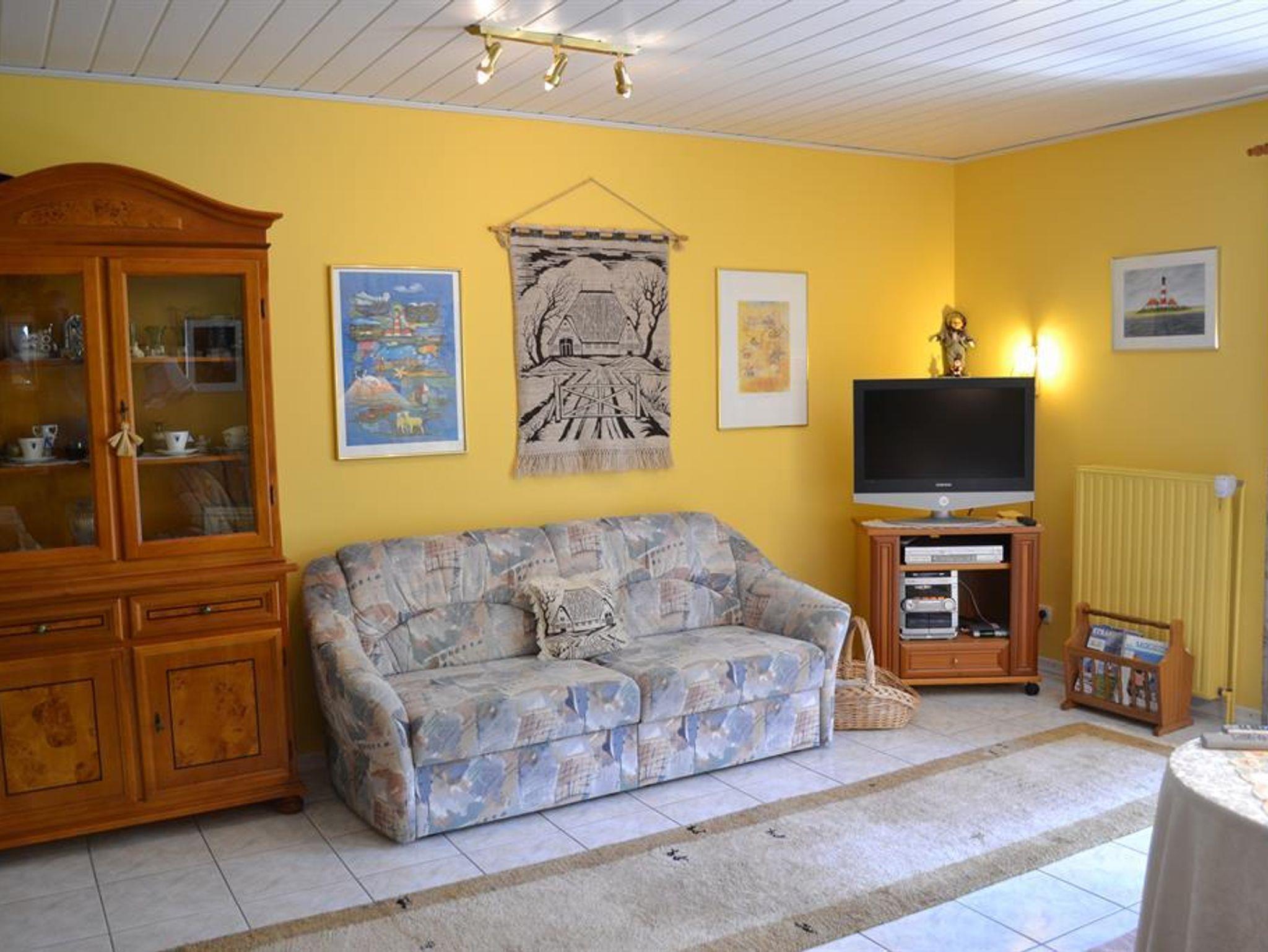 Zur Ausstattung gehören u.a. Waschmaschine, SAT-LCD-TV, Stereoanlage und Wecker. Ein Wandsafe ist eingebaut. Auch an Lichtquellen wurde in keinem Raum gespart. Sie erhalten Bettwäsche und pro Woche und Person 2 Handtücher, 1 Duschtuch, 2 Gästehandtücher, 2 Küchentücher und 1 Küchenhandtuch ohne Berechnung. Das Wohnzimmer und die Terrasse mit Strandkorb, Gartenmöbeln und Gartengrill liegen auf der Südseite. Im Wohnzimmer befinden sich neben zwei dreisitzigen Sofas, zwei Sesseln, einem Couchtisch, einem Sideboard, einem Vitrinenschrank und einer Wanduhr auch noch ein Vitrinenhängeschrank. Das Wohnzimmer ist gefliest. Auf den Fliesen liegen Teppiche. Eine zusätzliche Essecke befindet sich ebenfalls im Wohnzimmer. Das Schlafzimmer liegt im Obergeschoss an der Westseite der FRESENBORG. Eingerichtet ist es mit einem Doppelbett (Lattenrost und Bandscheibenmatratzen), zwei Nachtschränken, einem Kleiderschrank, einer Kommode, einem Schaukelstuhl, einem Bücherbord, Nachttischlampen und einer Deckenlampe und einer zusätzlich eingerichteten Leseecke. Fliegengitter vor jedem Fenster und Rauchmelder sind vorhanden. Im Obergeschoss befindet sich auch das geflieste Duschbad. Ausgestattet ist es mit Dusche, Waschbecken, Toilette, Spiegelschrank, Waschmaschine, Stuhl, Körperwaage und Vergrösserungsspiegel, Wäschekorb, vielen Haken und einer Ablage. Bademäntel sind vorhanden. Auf dem oberen Flur ist außerdem ein Ganzkörperspiegel angebracht. Im Erdgeschoss finden Sie außer dem Wohnzimmer die Küche. Sie ist ebenfalls gefliest und mit Einbauelementen versehen. Außer den oben erwähnten Elektrogeräten sind eine Essecke, Uhren und zusätzlich ein kleiner Hängeschrank vorhanden. Mit Geschirrspüler, Mikrowelle, Handmixer, Pürierstab, Kaffeemaschine, Radio, Toaster, Eierkocher und Wasserkocher haben Sie alle Annehmlichkeiten einer modernen Küche zur Verfügung. Reichlich Geschirr, Besteck, Töpfe und Reinigungsmittel stehen bereit, wenn Sie sich einmal vom Bummel durch die abwechslungsreiche, internationale Gastronomie unseres Ortes erholen wollen. Vom Flur, der mit einer Garderobe und einer Ablage ausgestattet ist, gehen die Extra-Toilette mit Waschbecken und ein kleiner Abstellraum ab. In diesem sind Gefrierschrank, Staubsauger, Reinigungsgeräte, Putzmittel, Bügeleisen und -brett, Gartenauflagen, usw. untergebracht. Genießen Sie Ihren Urlaub von der ersten Minute an!