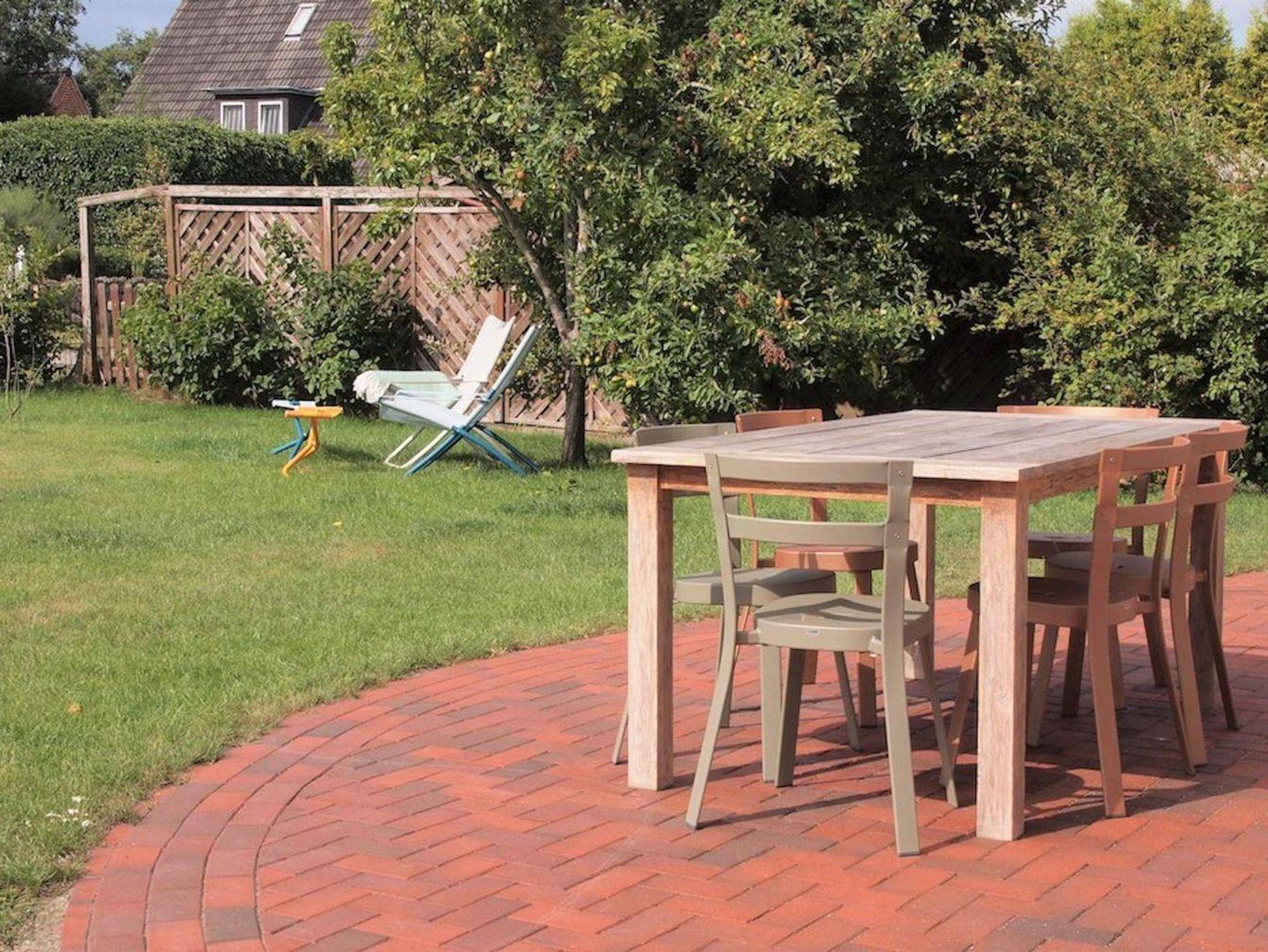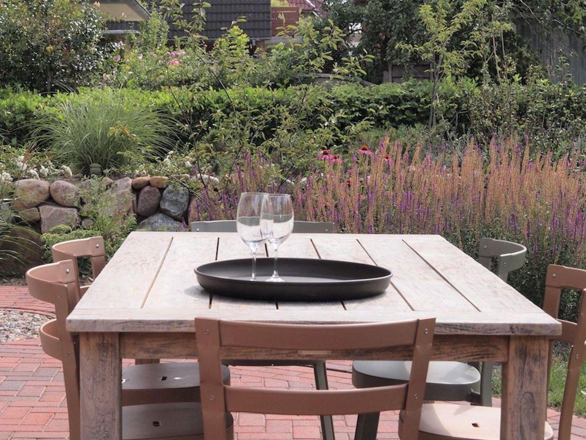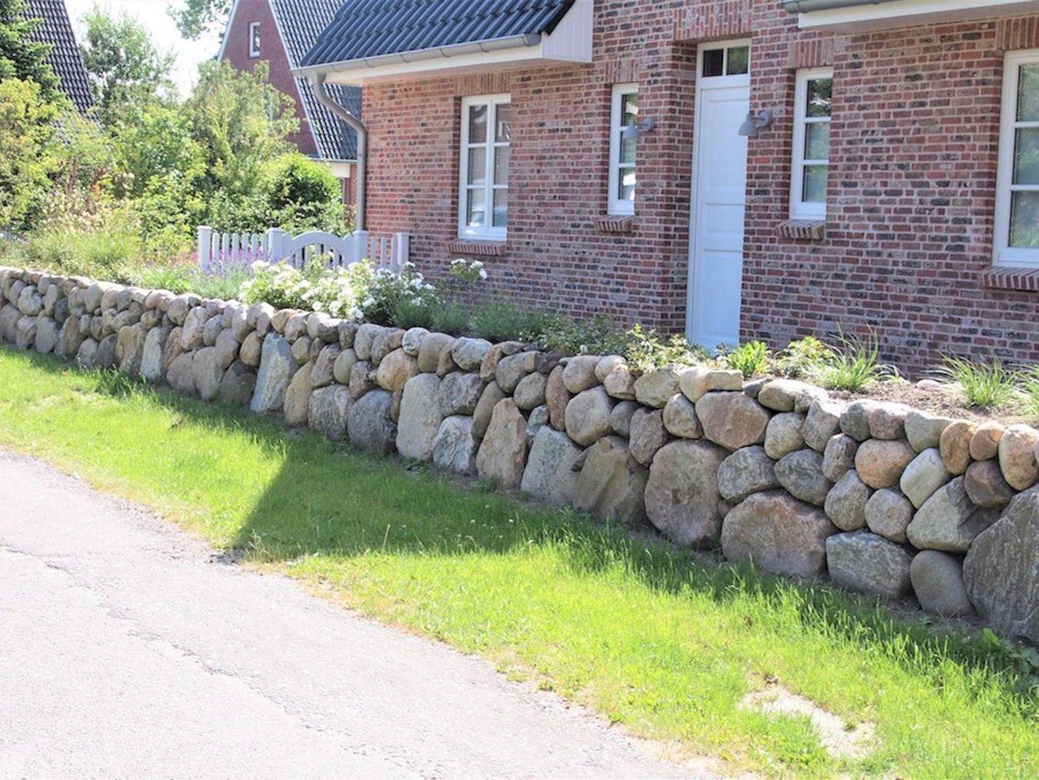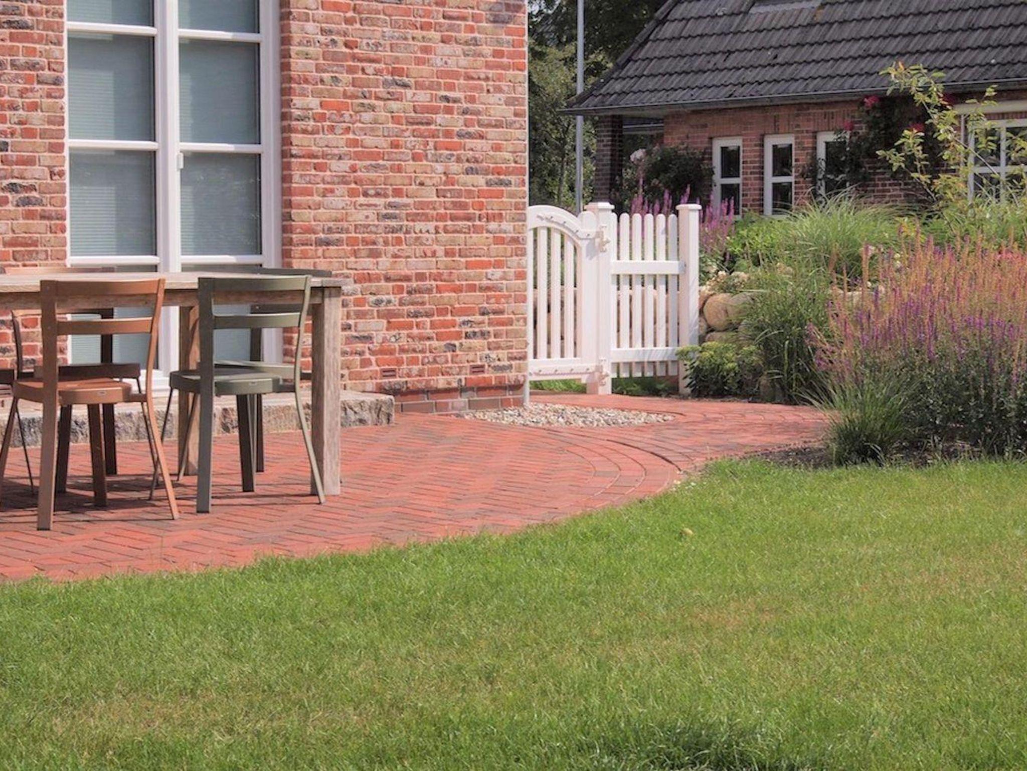 Das Grundstück mit Carport, Stellplatz, großer Rasenfläche und einer geschützten, sonnigen Terrassen ist mit heimischen Pflanzen und einem Friesenwall angelegt.