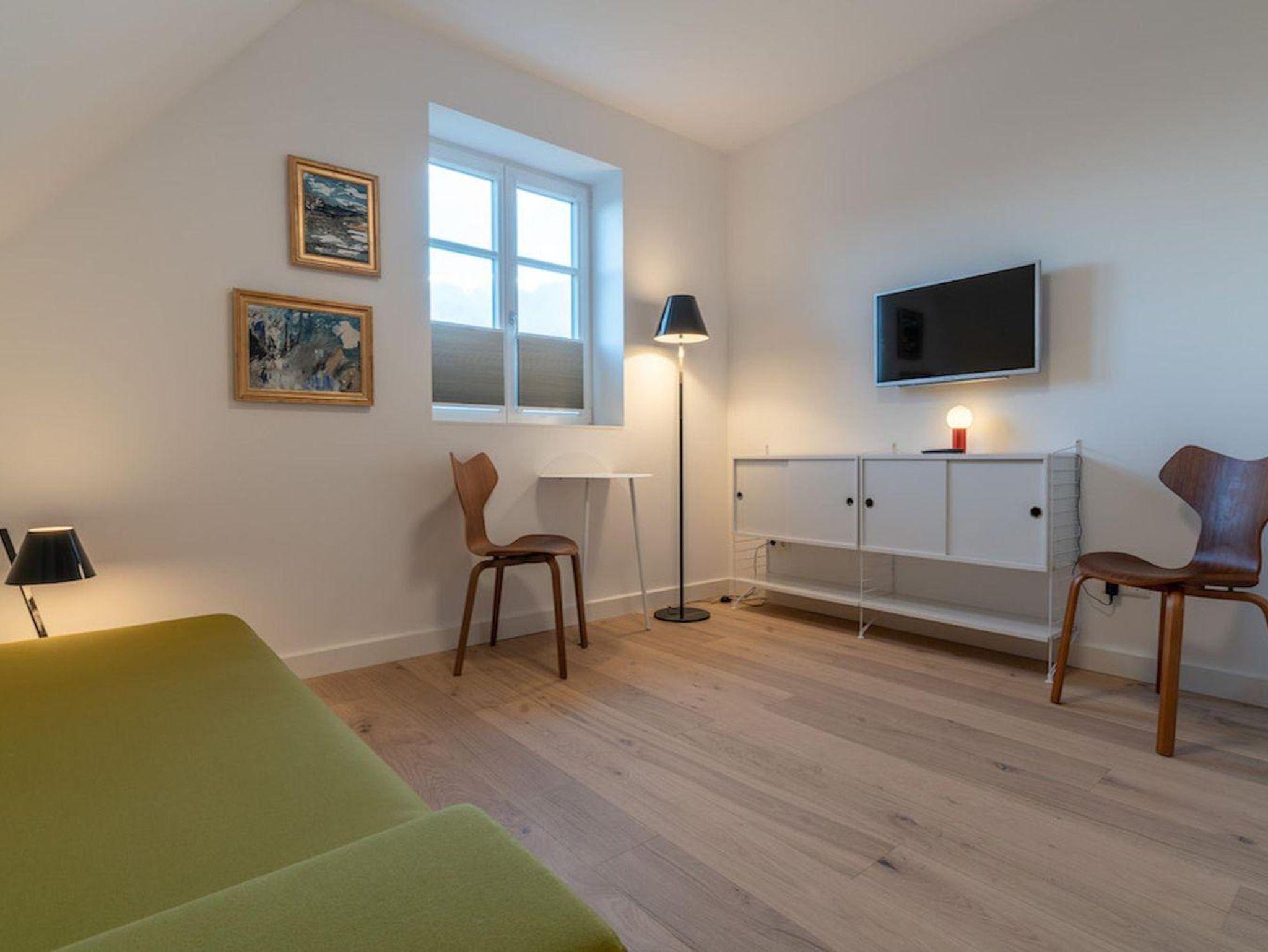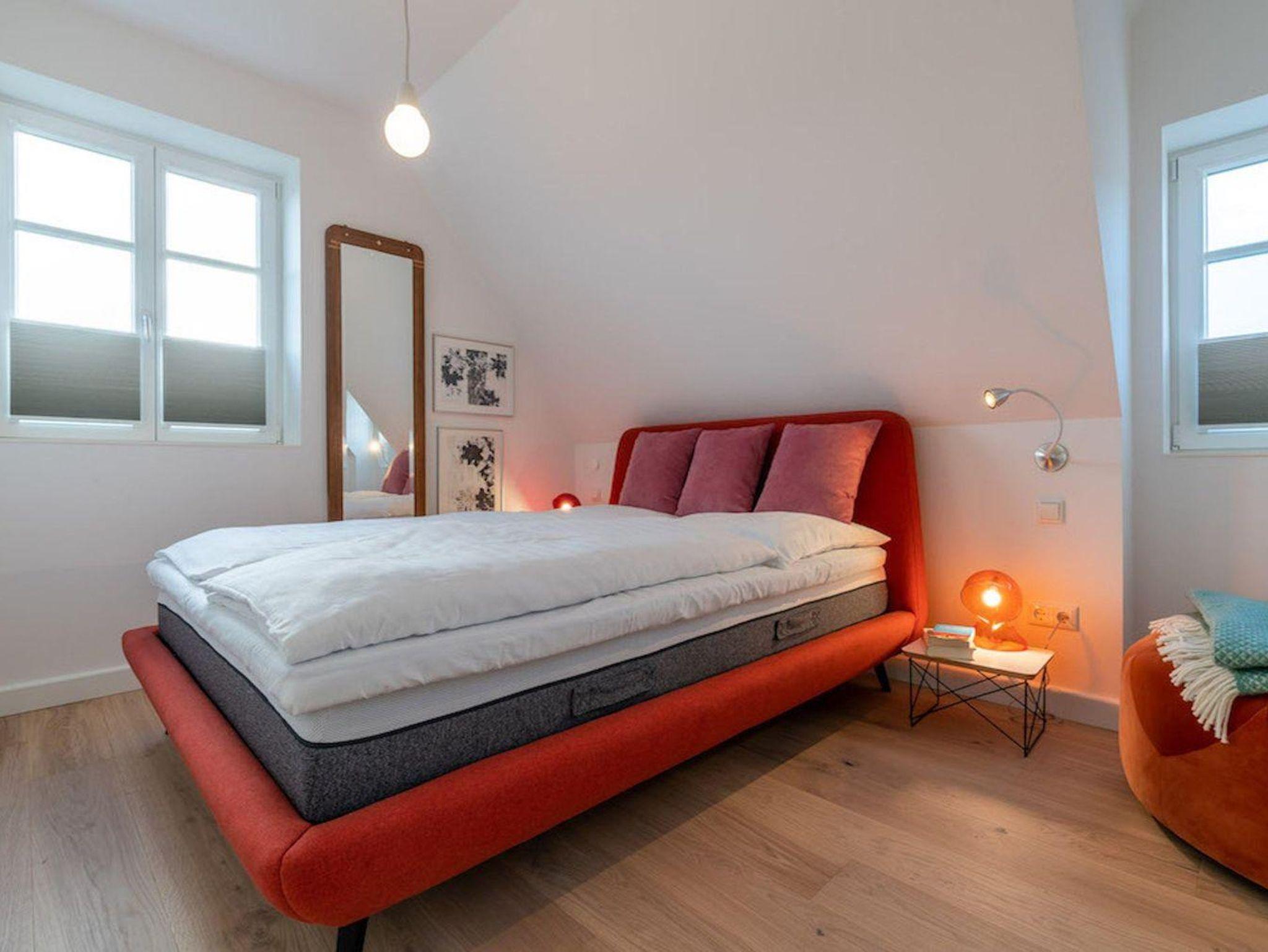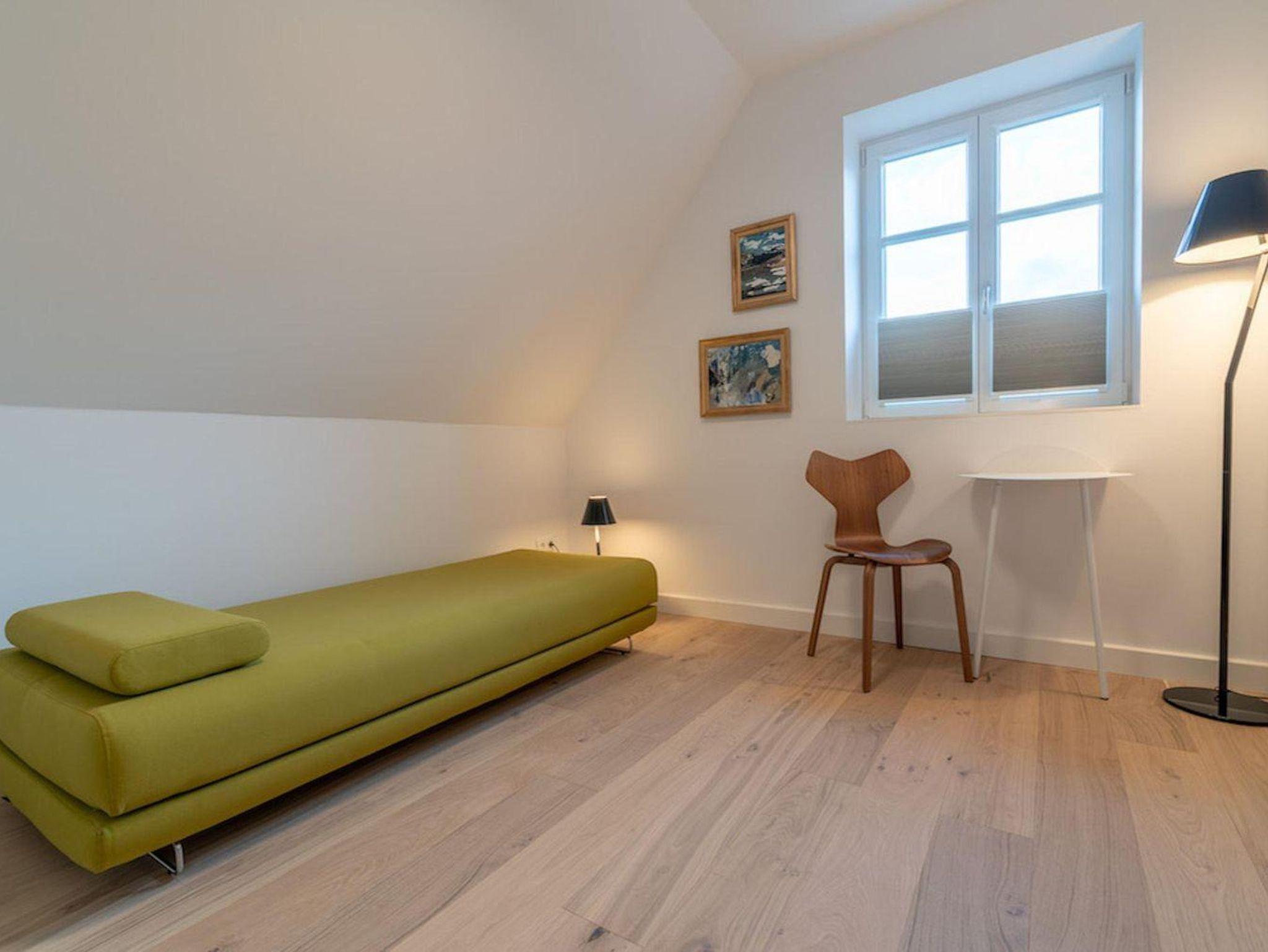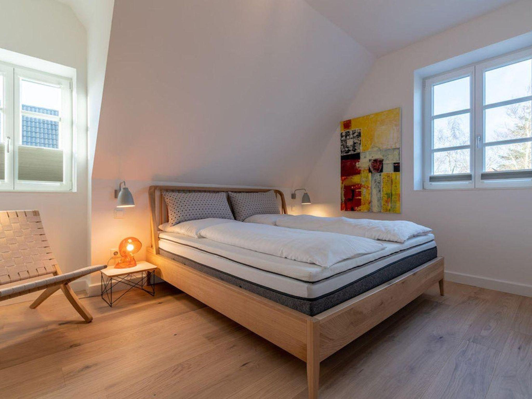 Über eine Holztreppe gelangt man in das mit Eichendielen ausgelegte Obergeschoss. Die beiden Schlafzimmer mit je einem Doppelbett und TV bieten jeden Komfort. Begehbare Kleiderschränke gewähren Ihnen hinreichend Ablageflächen. Darüber hinaus befindet sich im Obergeschoss ein weiteres Schlafzimmer, hier sind 2 hochwertige Schlafsofas für 2 Personen. Der Lounge Room kann ebenso als Büro oder Lesezimmer genutzt werden. Ein geräumiges Bad mit Dusche und freistehender Badewanne runden jeden Luxus ab.