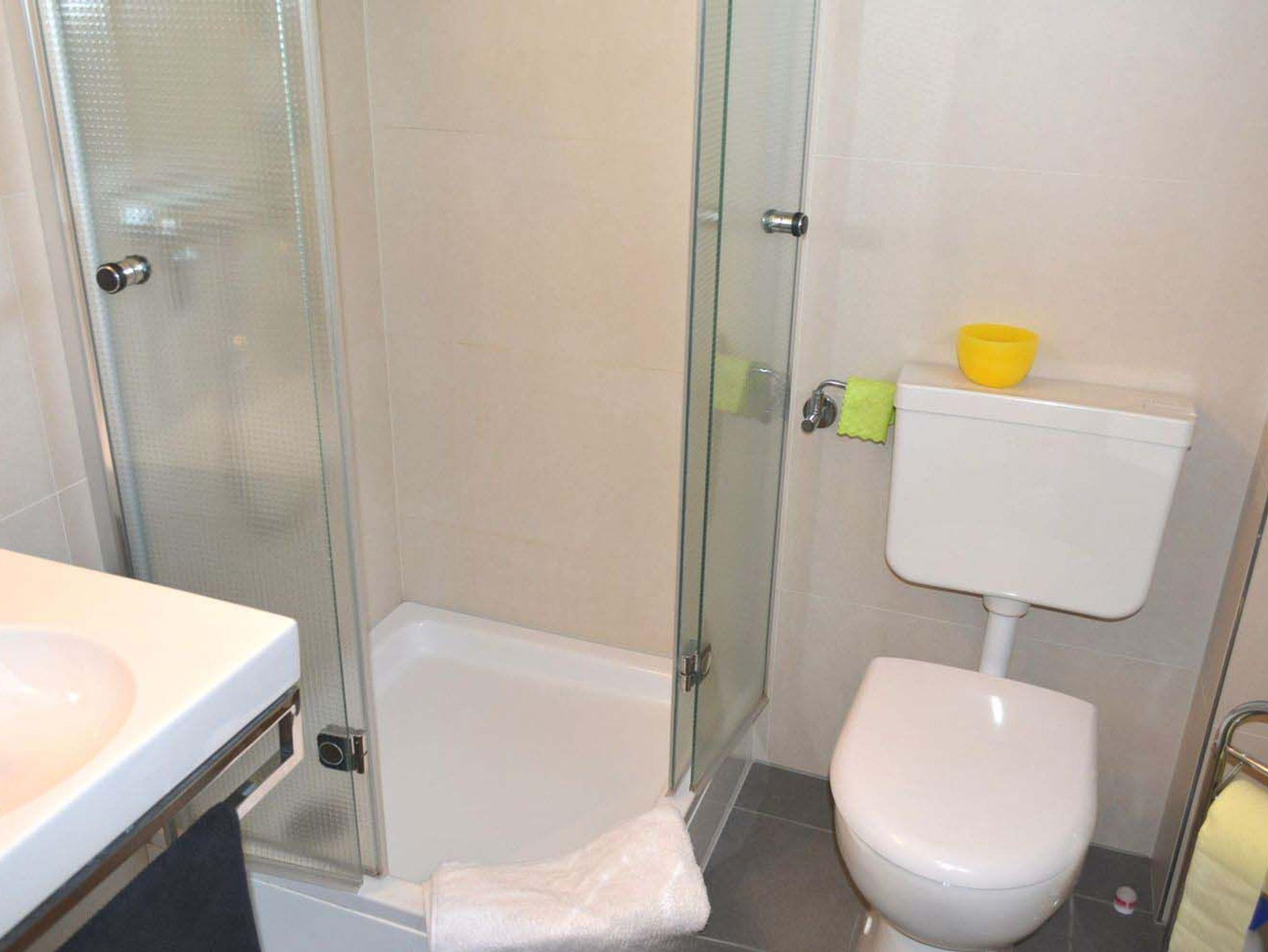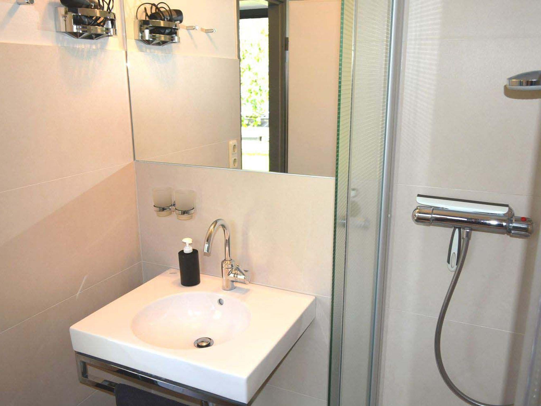 Bad 1: Dusche, Duschkabine, Fön, Hocker, Spiegel, Waschbecken, WC