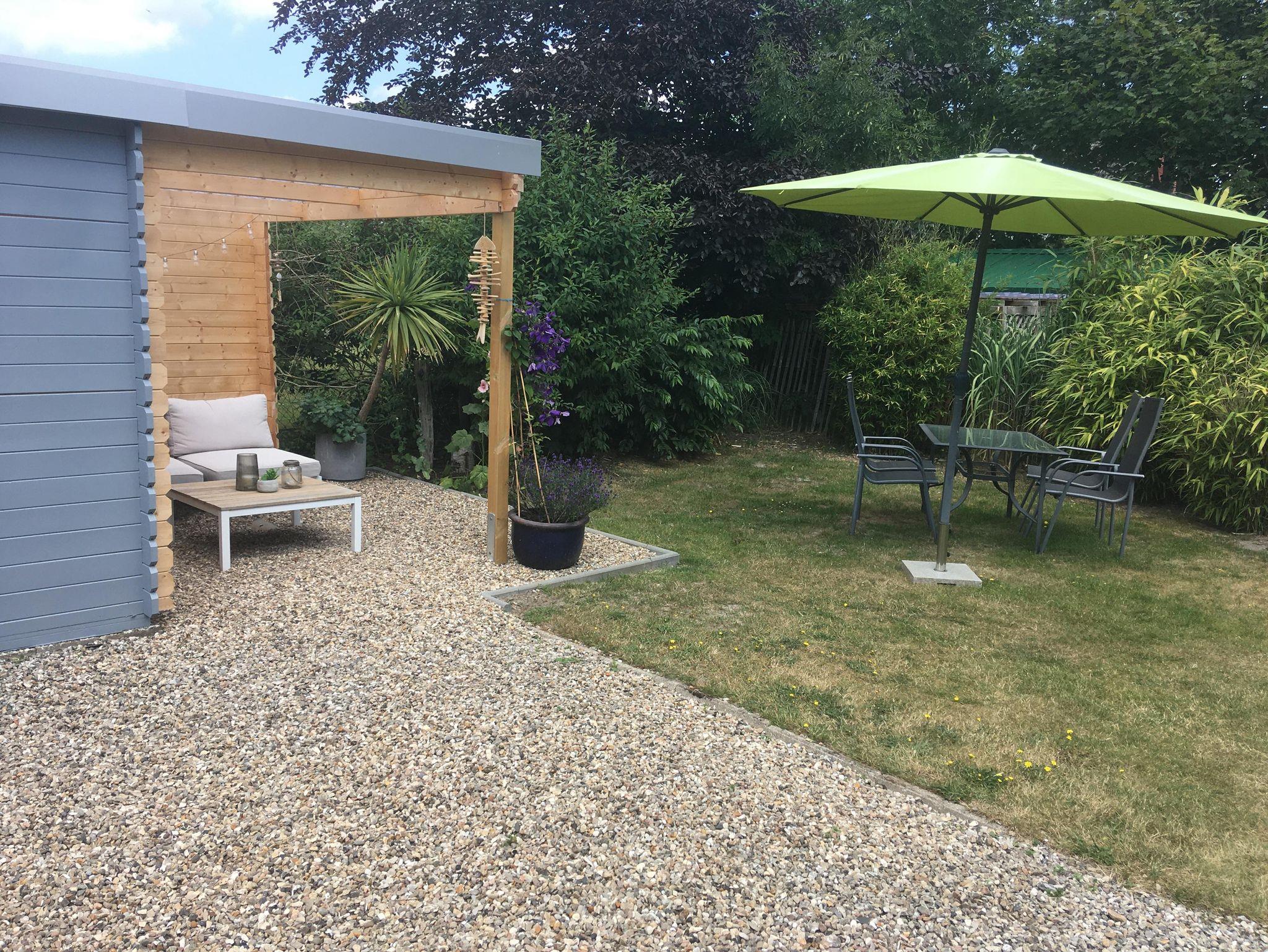 Der Garten mit Gartenmöbeln und Liegen lädt zum Erholen ein.