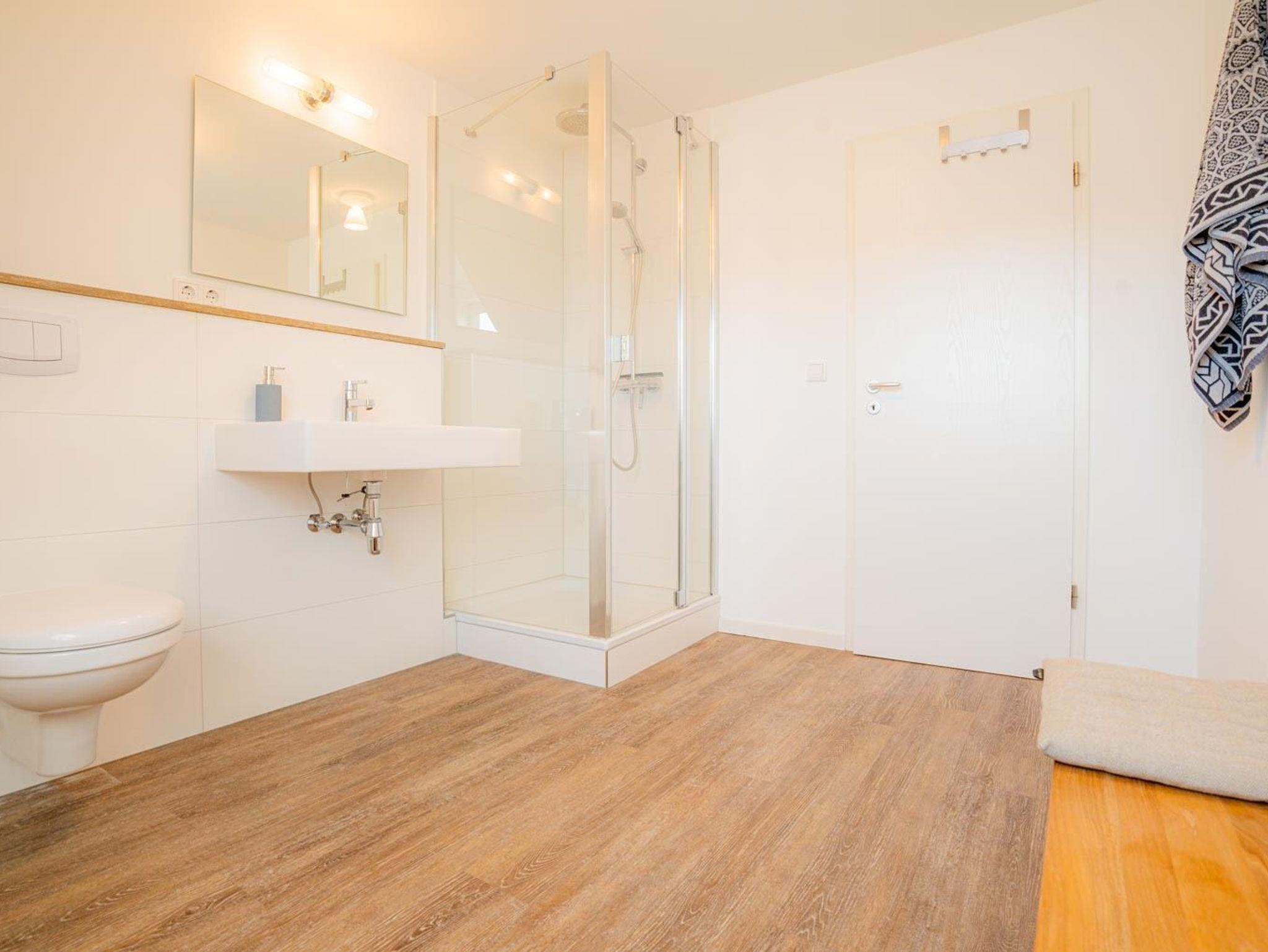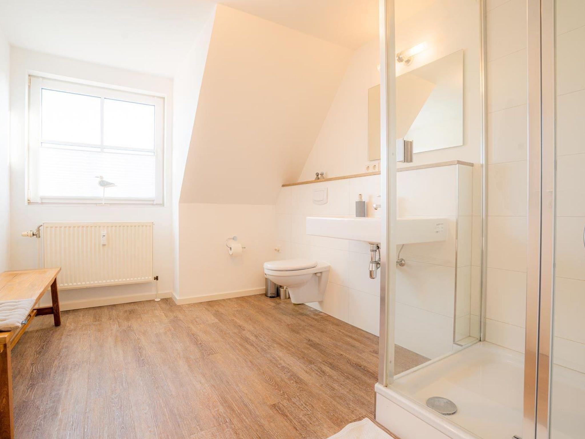 Badezimmer (Duschbad) mit Regen-Dusche, WC, Tageslicht und Föhn.