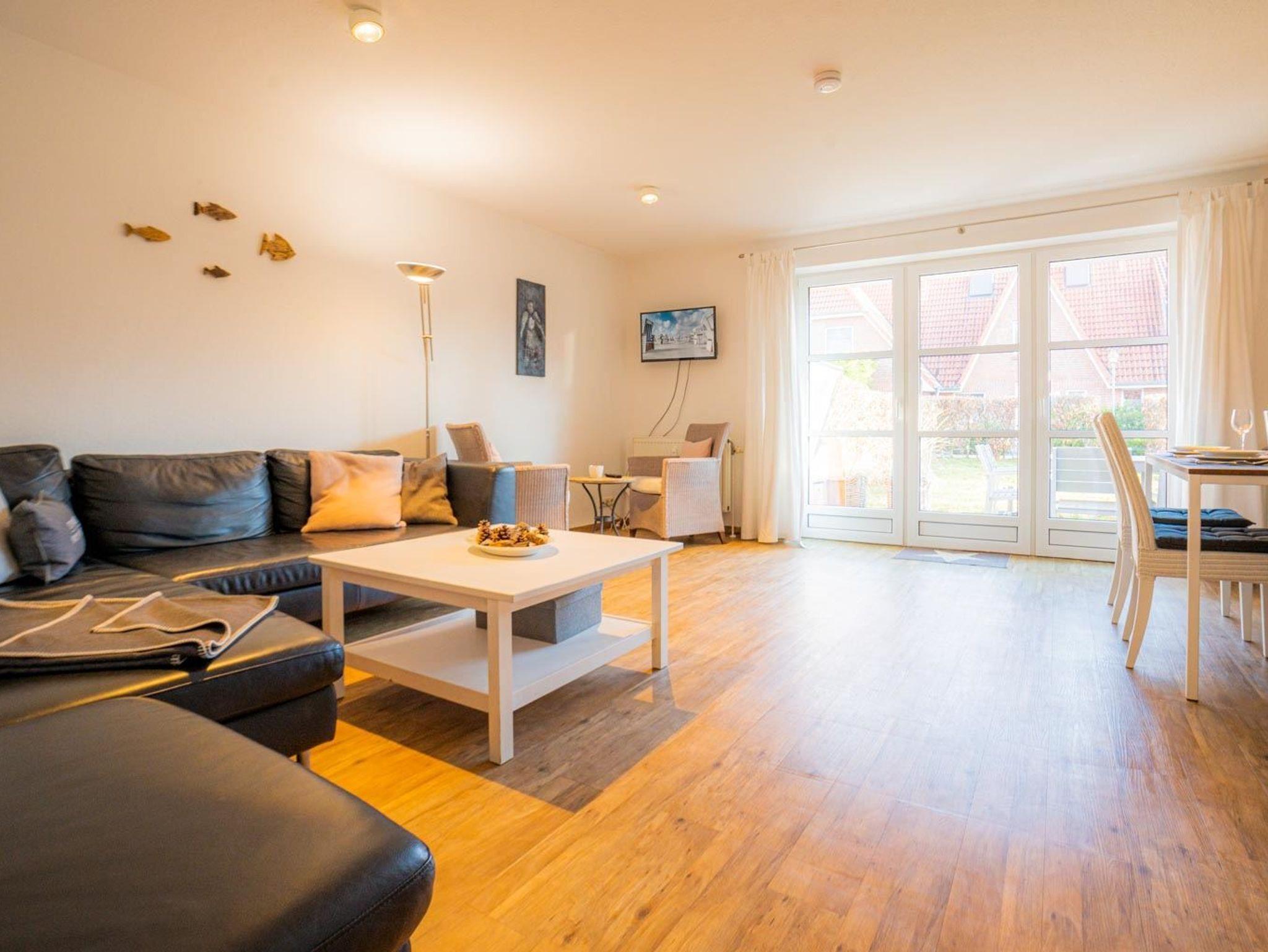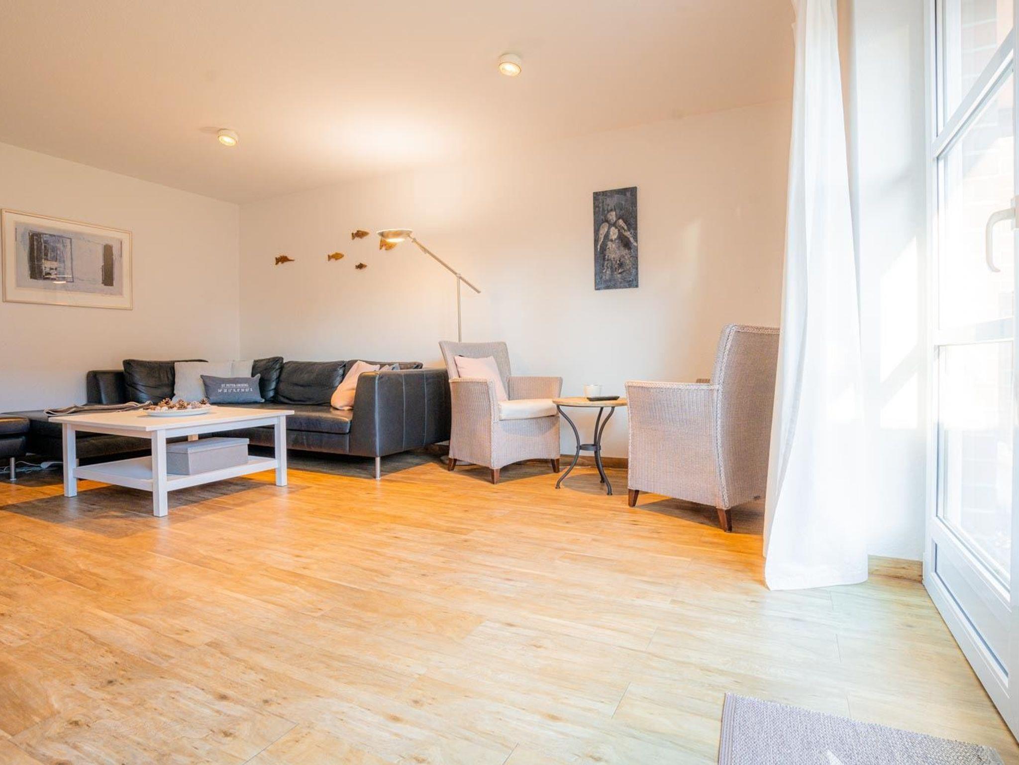 Wohnzimmer mit Eck-Ledersofa, zwei Sesseln, SMART-TV (Kabel), Radio und Esstisch mit 4 Stühlen. Direkter Zugang zur möblierten Gartenterrasse nach Südosten mit Strandkorb.