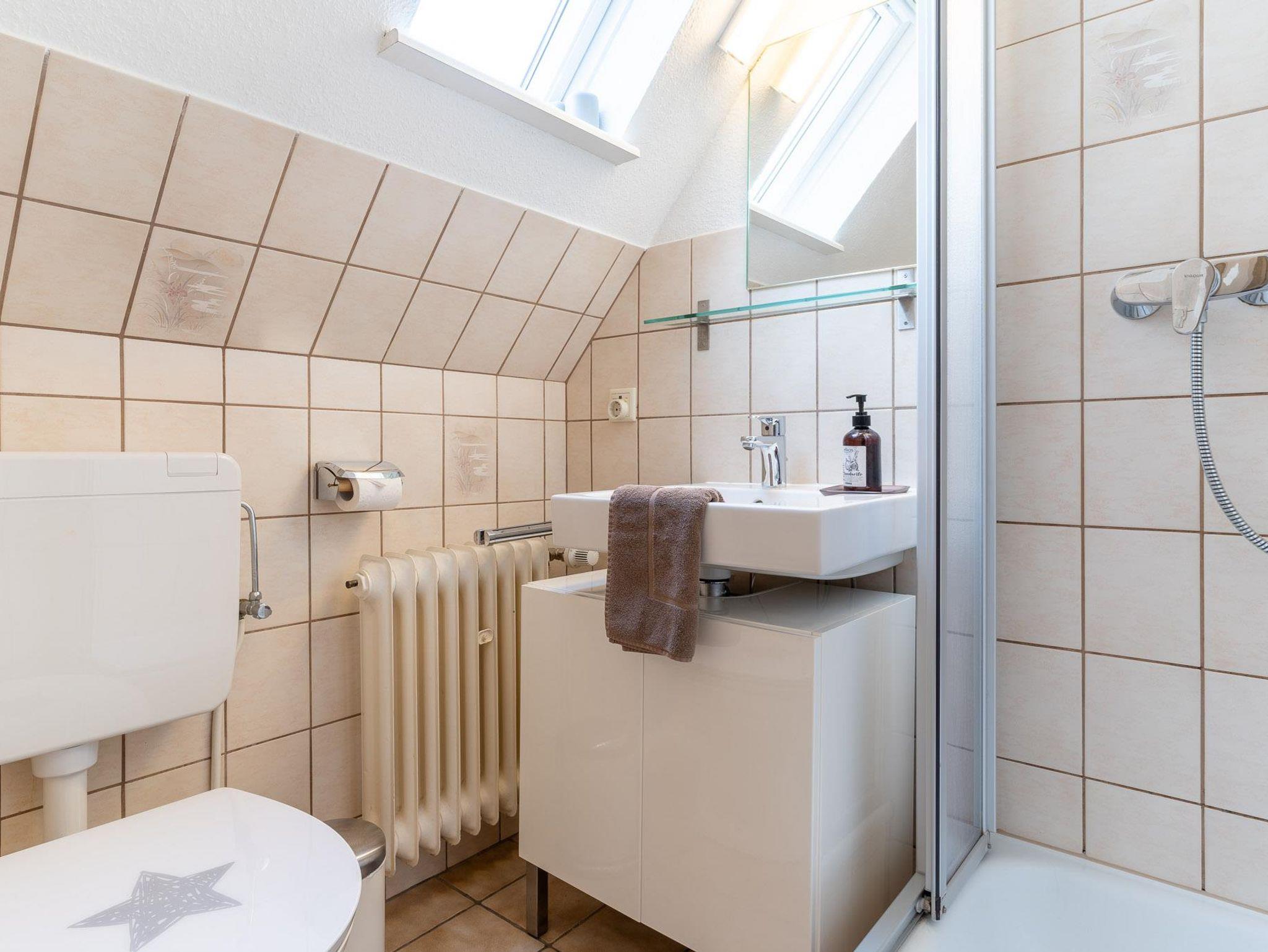 Das Tageslicht-Duschbad mit WC verfügt über reichlich Ablagefläche.