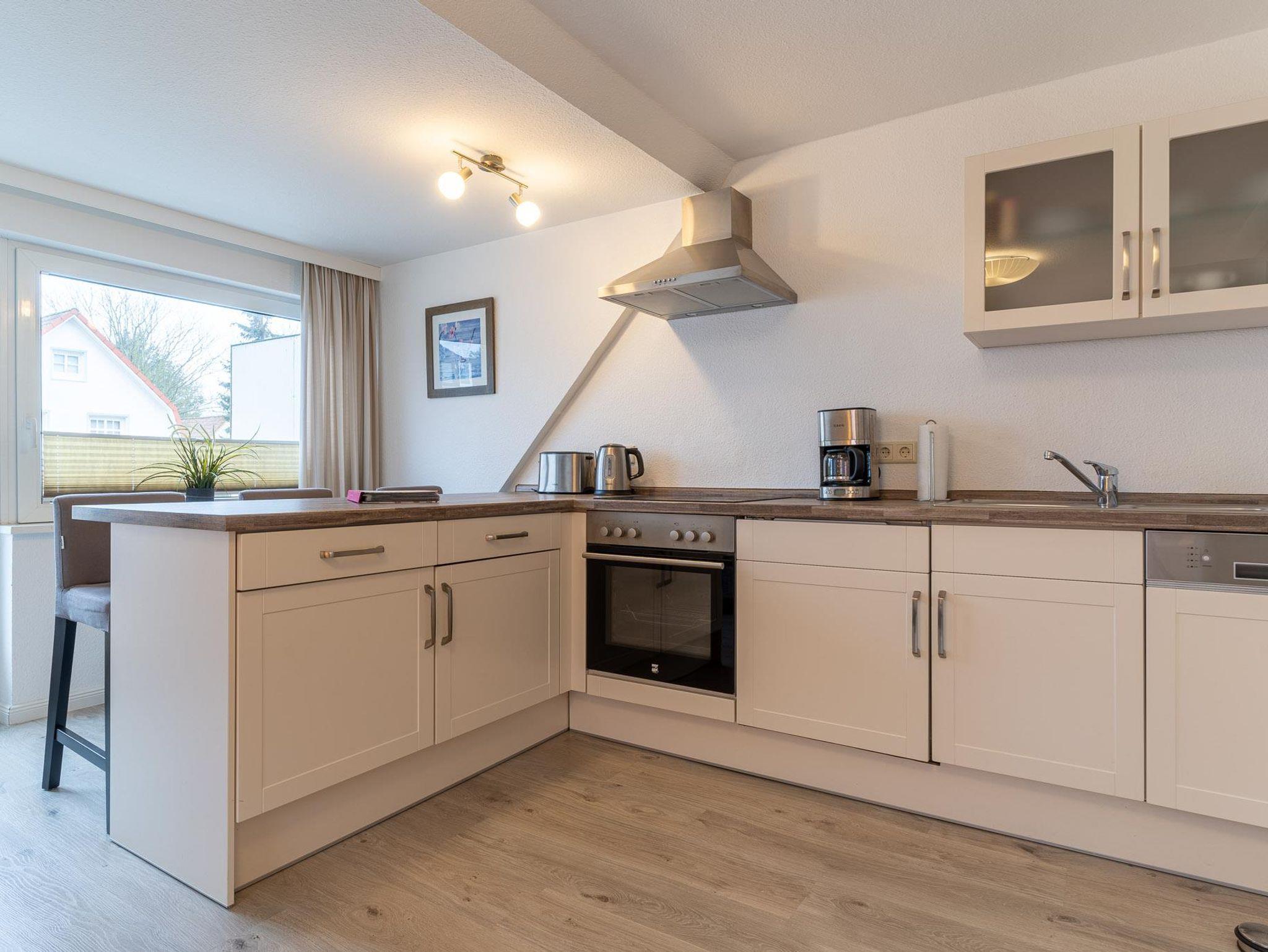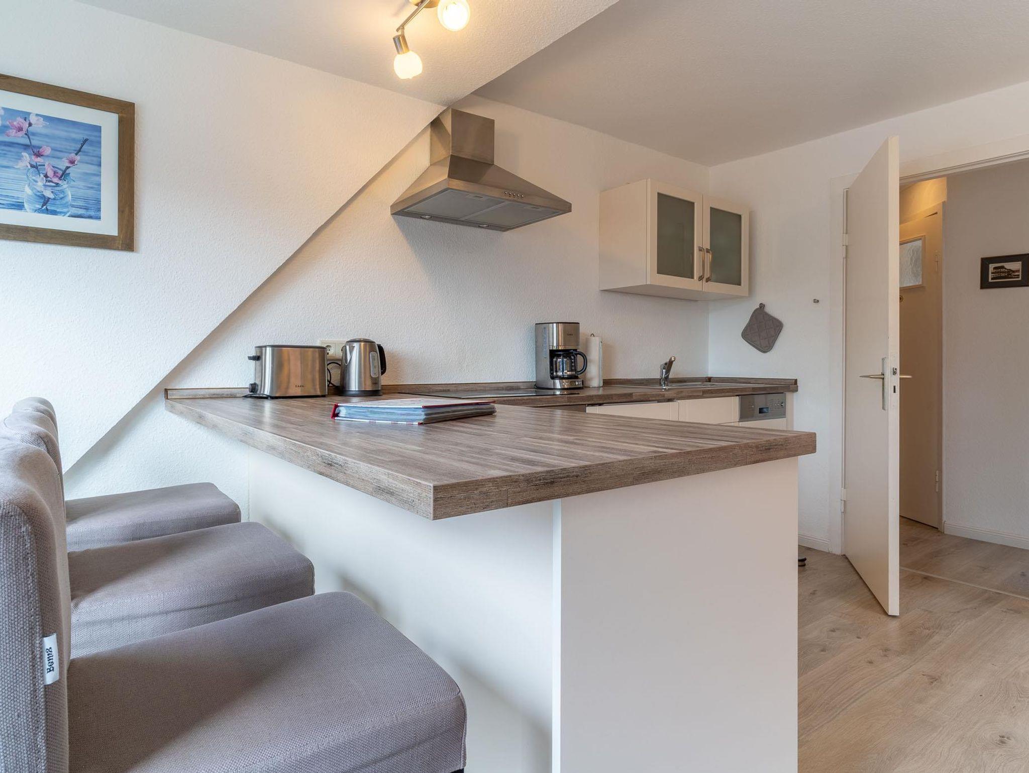 Die im Wohnbereich integrierte neue Einbauküche hat einen 4-Platten-Herd, Backofen, Geschirrspülmaschine, Wasserkocher, Kaffeemaschine, Toaster, Eierkocher, Kühlschrank mit Gefrierfach, und alle nötigen Utensilien zum Herrichten leckerer Speisen, die Sie am Küchentresen genießen können.