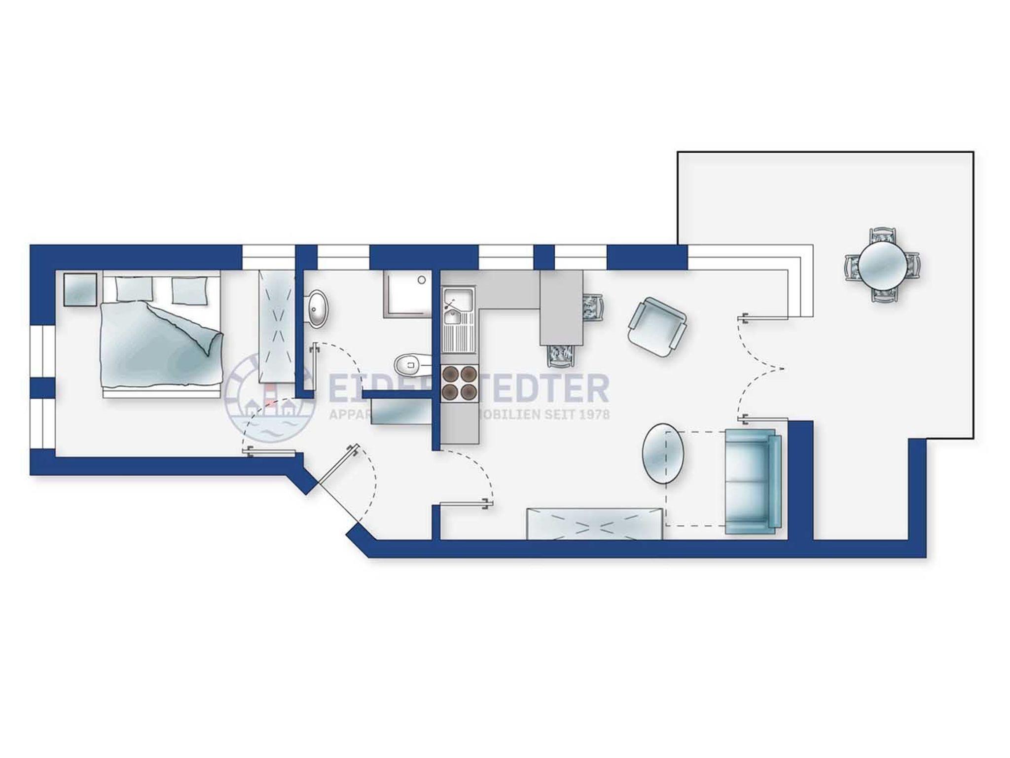 Wohnzimmer mit ausziehbarem (Schlaf-) Sofa (160x200cm), Sessel, SMART-TV (Sat) und Esstisch für 2 Personen. Direkter Zugang zur möblierten Südterrasse. Offene Küche mit Backofen, Geschirrspüler und Kühlschrank mit Gefrierfach.