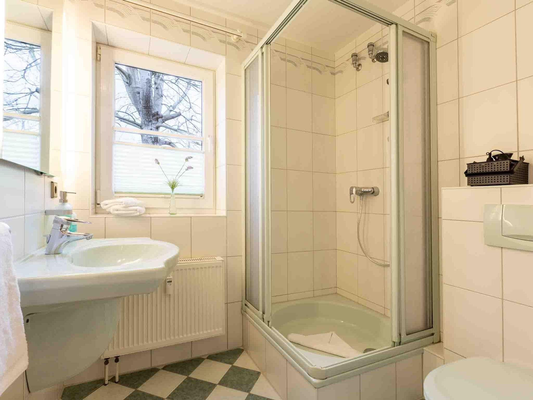 Badezimmer (Duschbad) mit Dusche, WC, Tageslicht und Föhn.