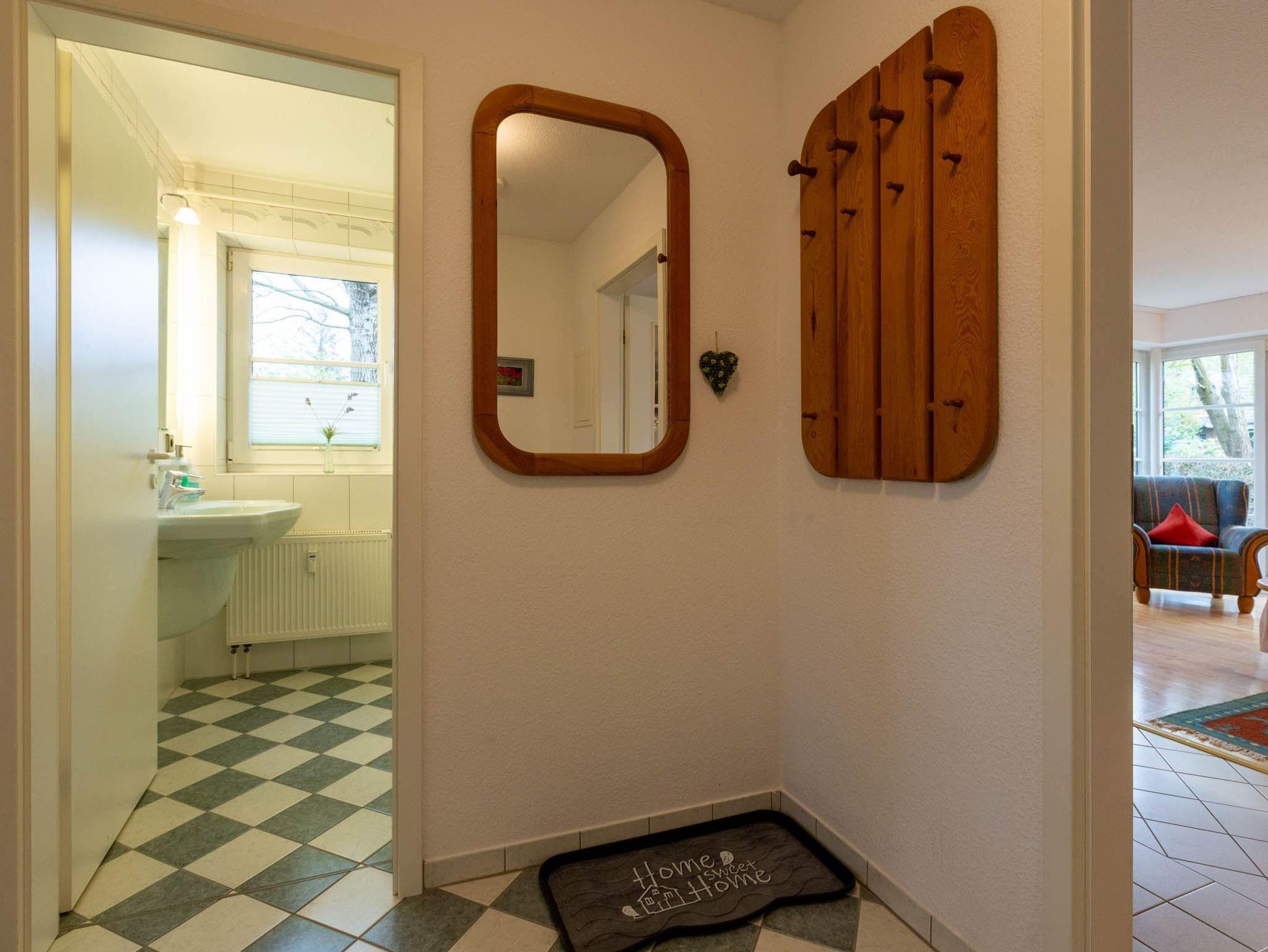 Flur mit Garderobe und Spiegel im Eingangsbereich.