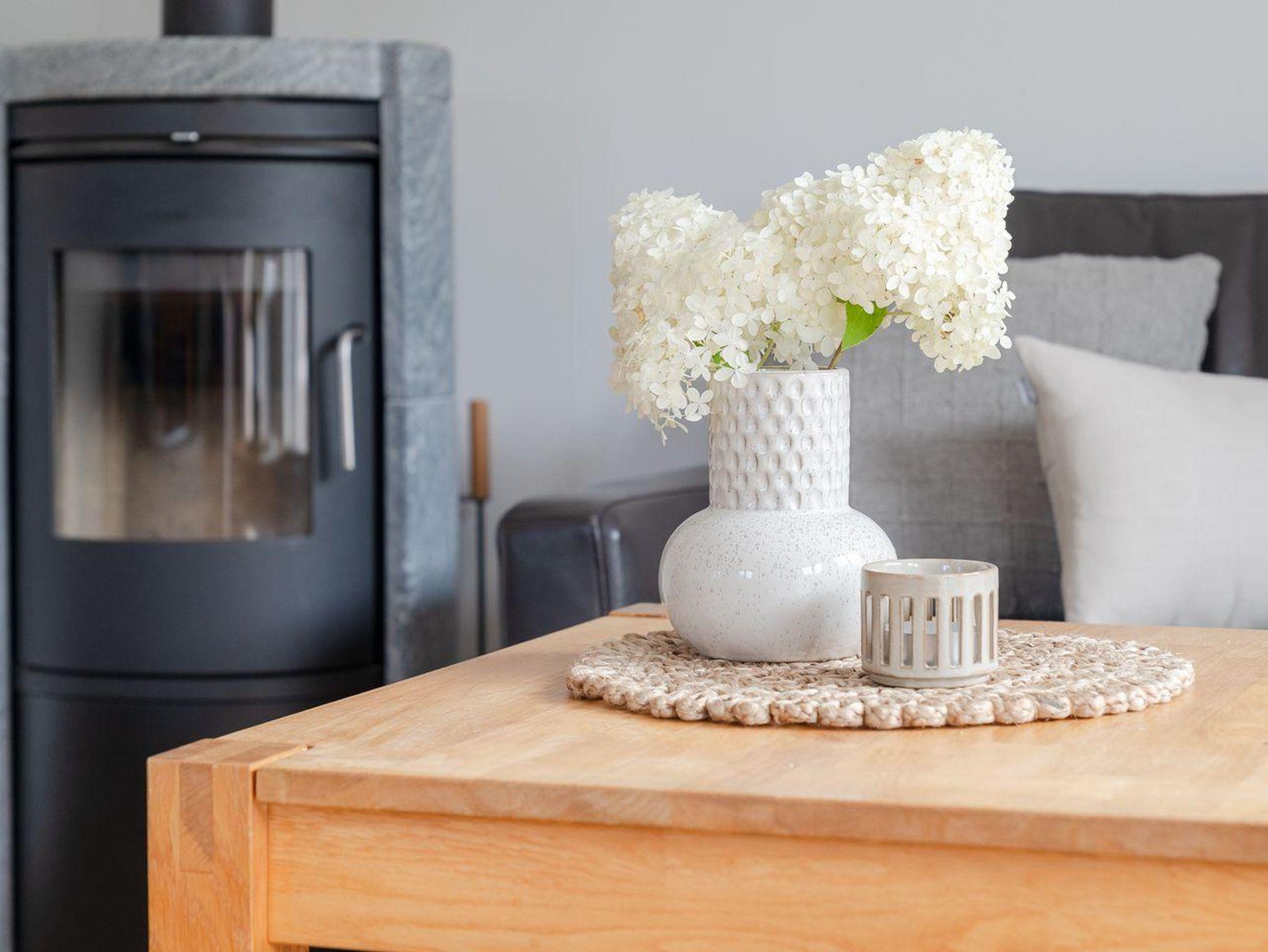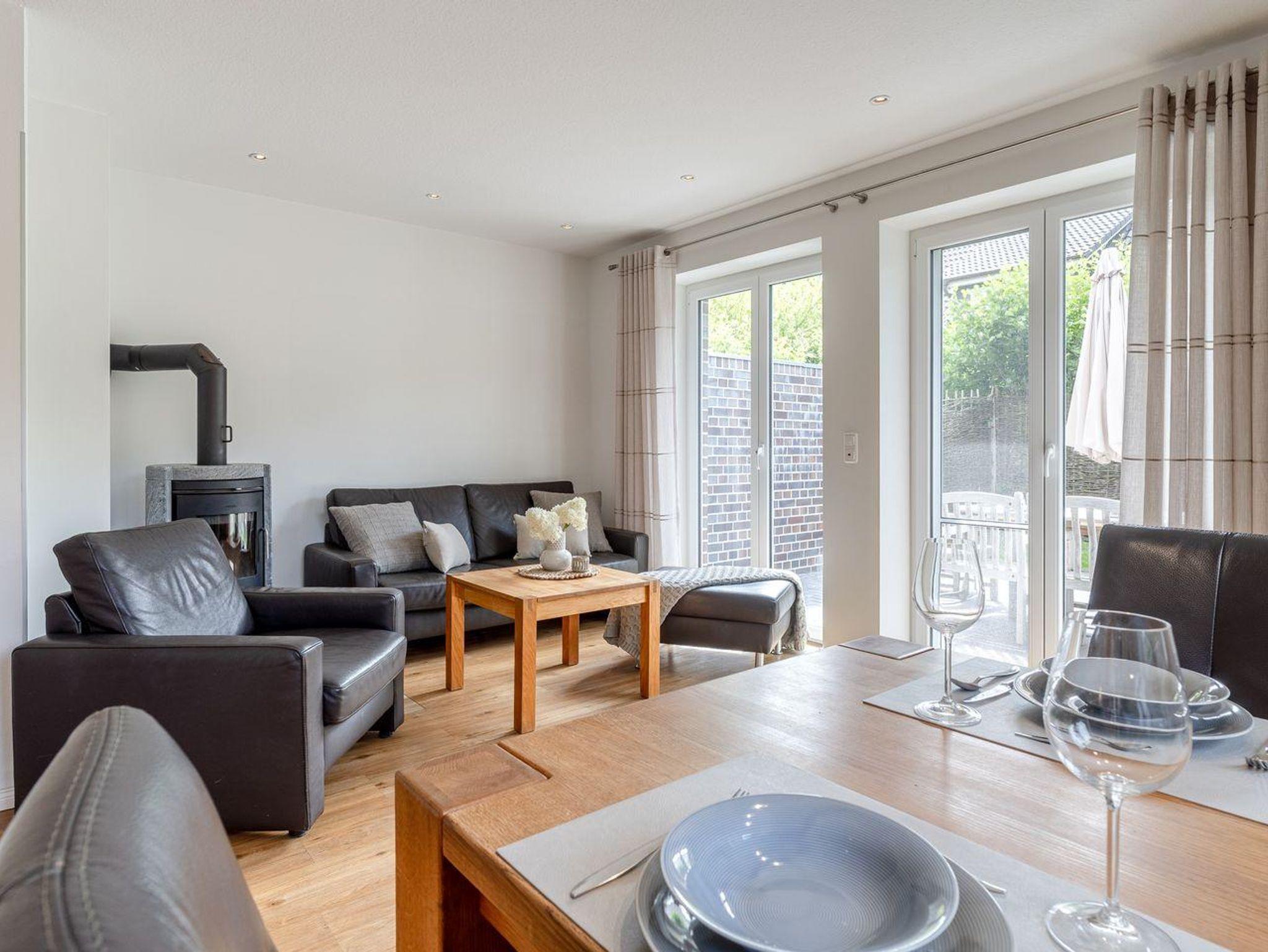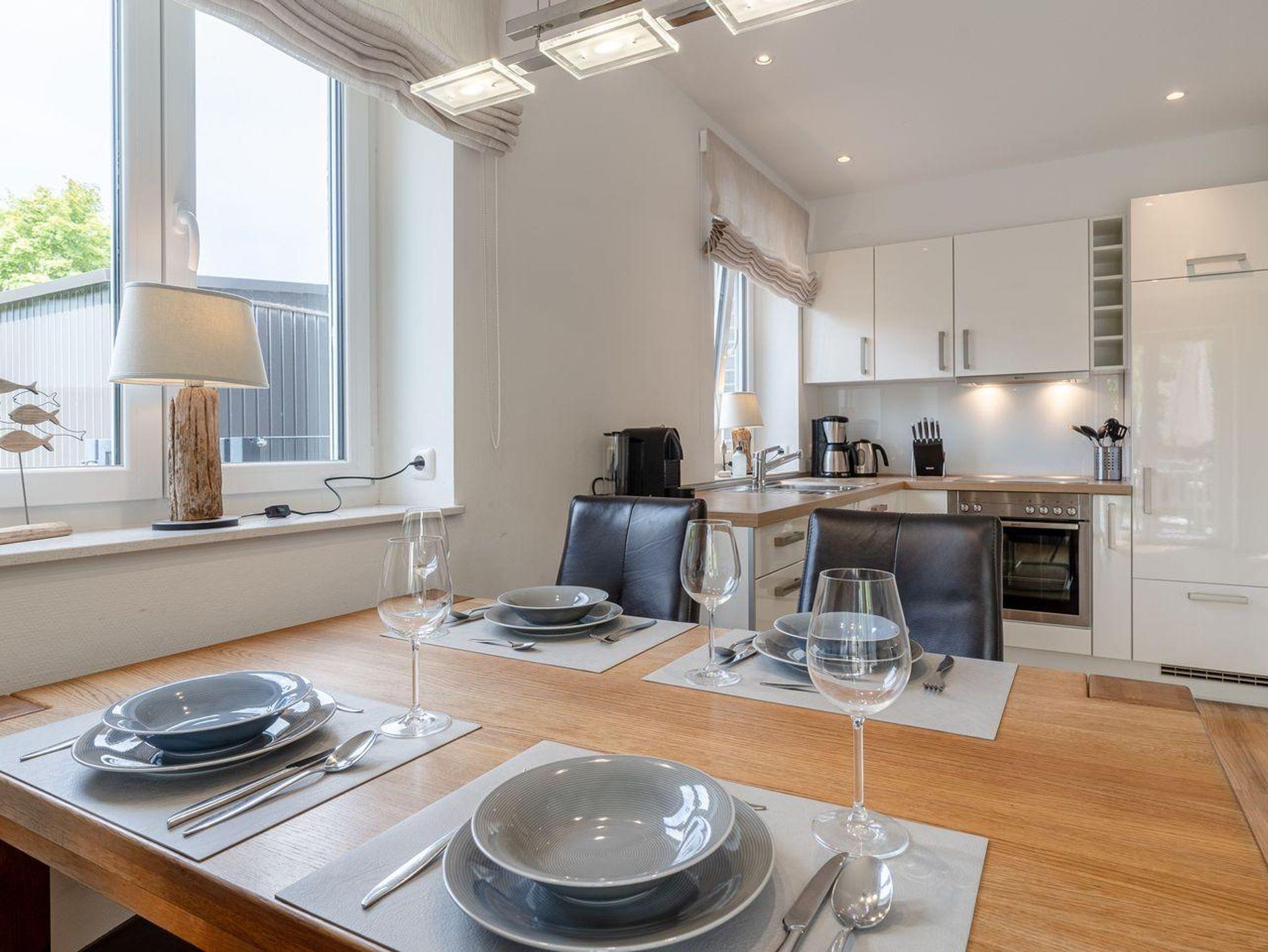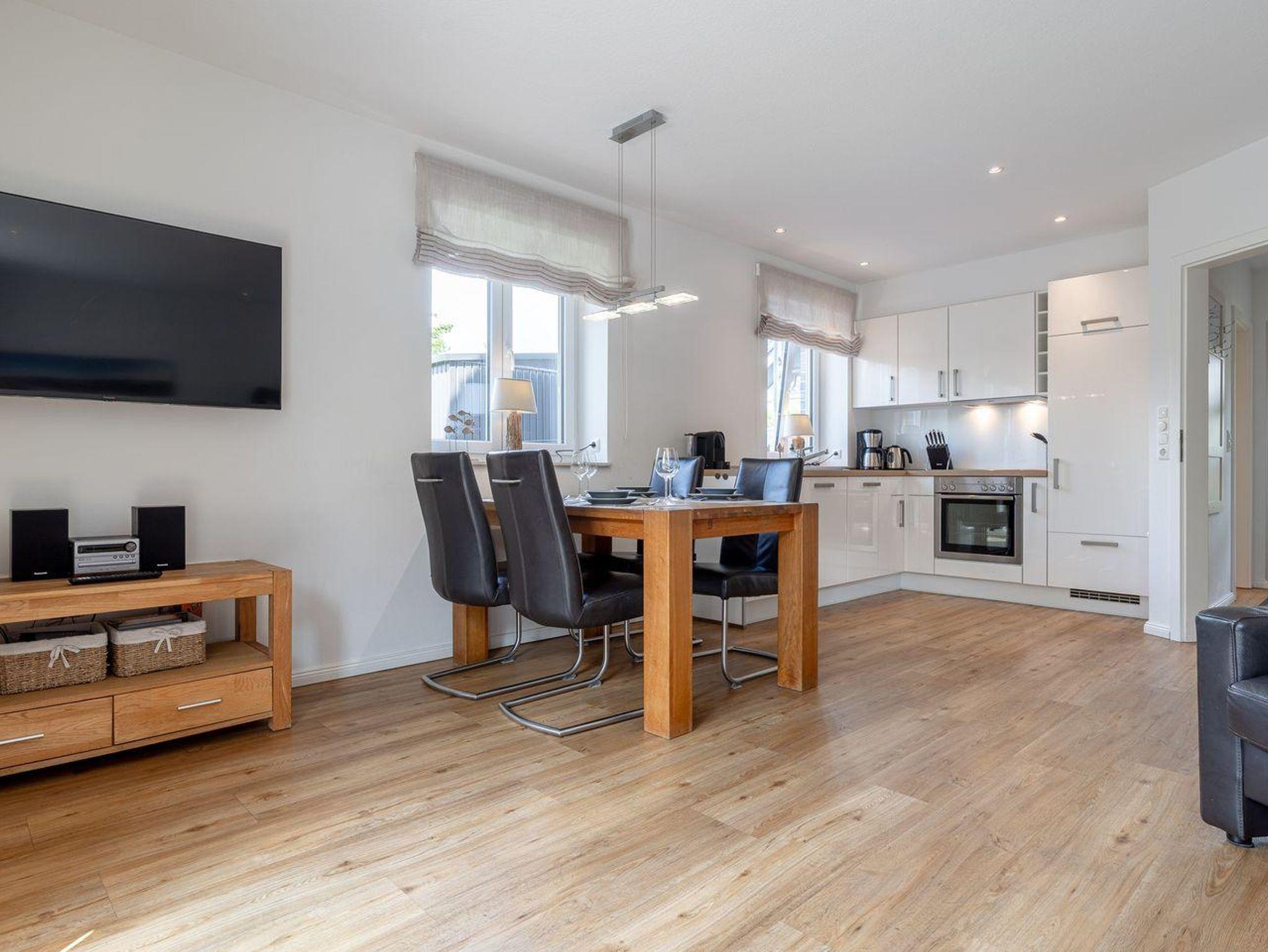 Im Erdgeschoss erwartet Sie ein Wohn- und Essbereich mit einem einladenden Specksteinofen und einer modernen offenen Küche. Zusätzlich verfügt das Erdgeschoss über ein Gästebad mit einer ebenerdigen Dusche. Von hier aus können Sie direkt auf die sonnige Süd-Terrasse treten, die mit edlen Gartenmöbeln aus Teak-Holz ausgestattet ist – der perfekte Ort, um die Sonne zu genießen.