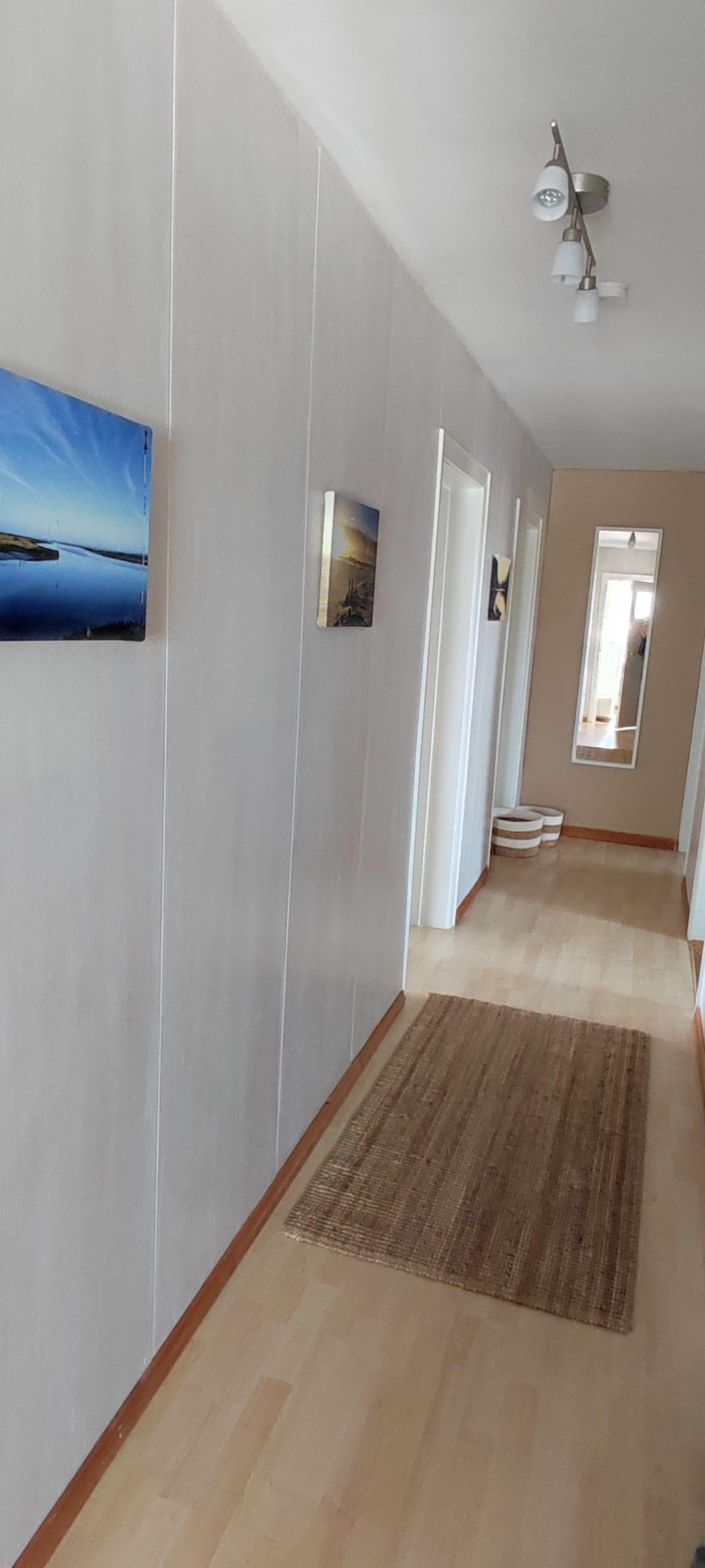 Hereinspaziert durch den eigenen Eingang führt ein Treppenaufgang über eine Dünenlandschaft in die Wohnung. Über den langen Flur erreicht man zwei Schlafzimmer, ein Wohnzimmer, das Bad mit separater Dusche, die gemütliche Wohnküche und das Zusatzzimmer auf der anderen Seite des Treppenaufgangs.