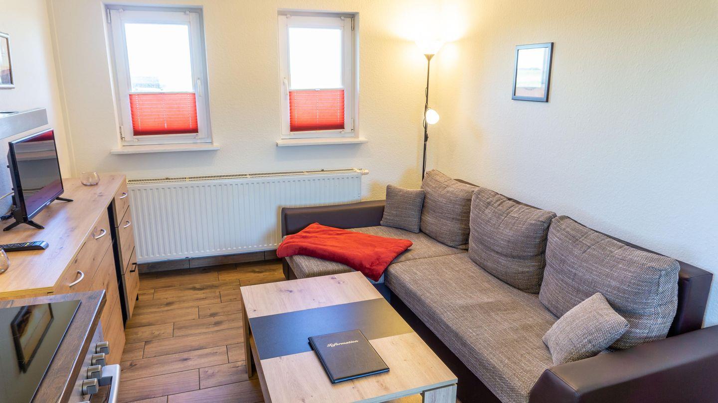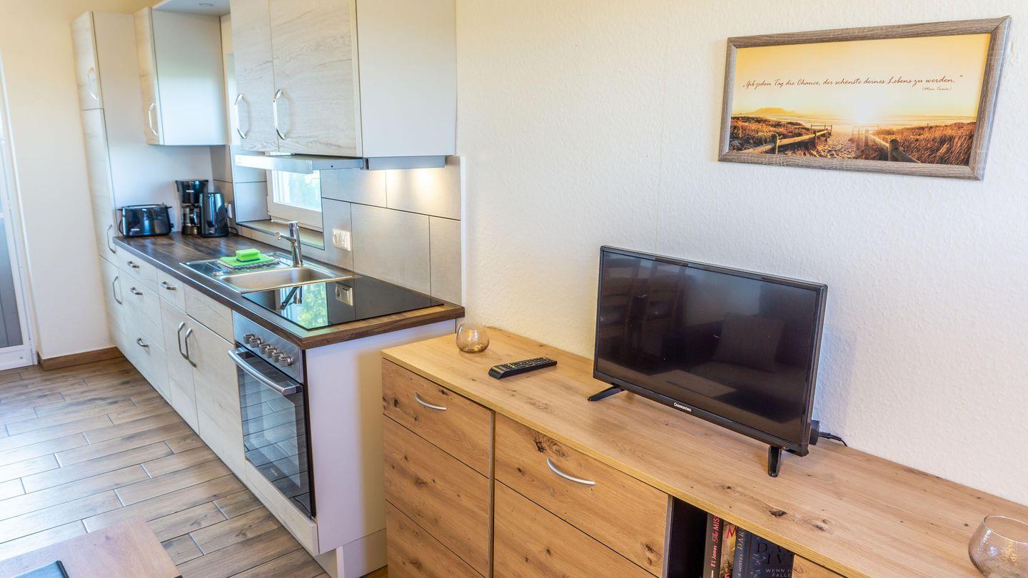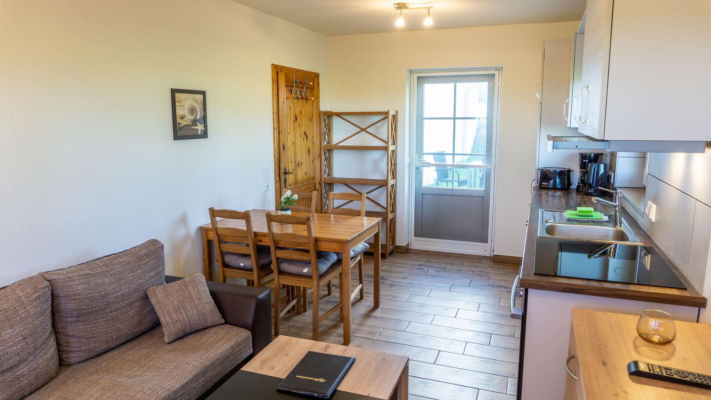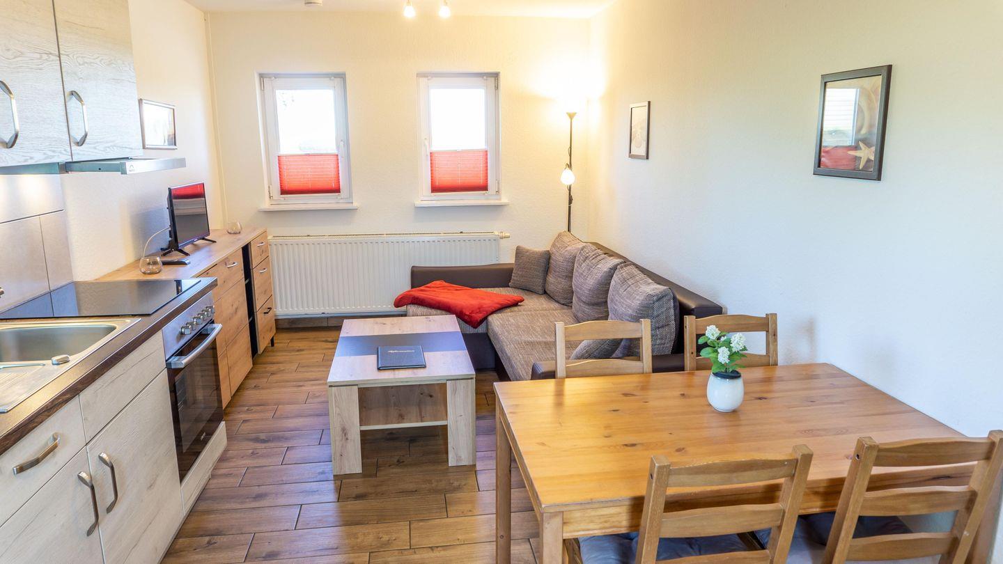 Wohnraum mit Sofa, SAT-TV, Essbereich, Küchenzeile