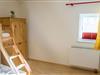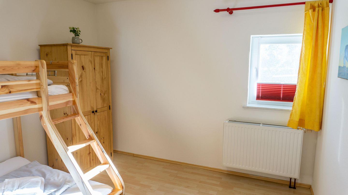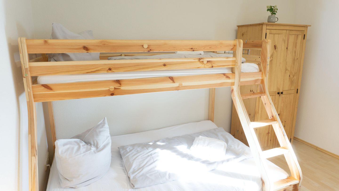 Schlafzimmer mit Etagenbett für 3 Personen. Das untere Bett ist ca. 140 cm breit.