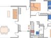 Eingangsbereich mit Zugang zur offenen Küche, Wohnraum mit Essbereich und Zugang zur Terrasse (Westausrichtung), ein Schlafzimmer mit Doppelbett (180 x 200 cm - Einzelmatratzen) und Duschwannenbad en Suite, ein Schlafzimmer mit Doppelbett (160 x 200 cm - Einzelmatratzen), ein separates Duschbad, ein Hauswirtschaftsraum