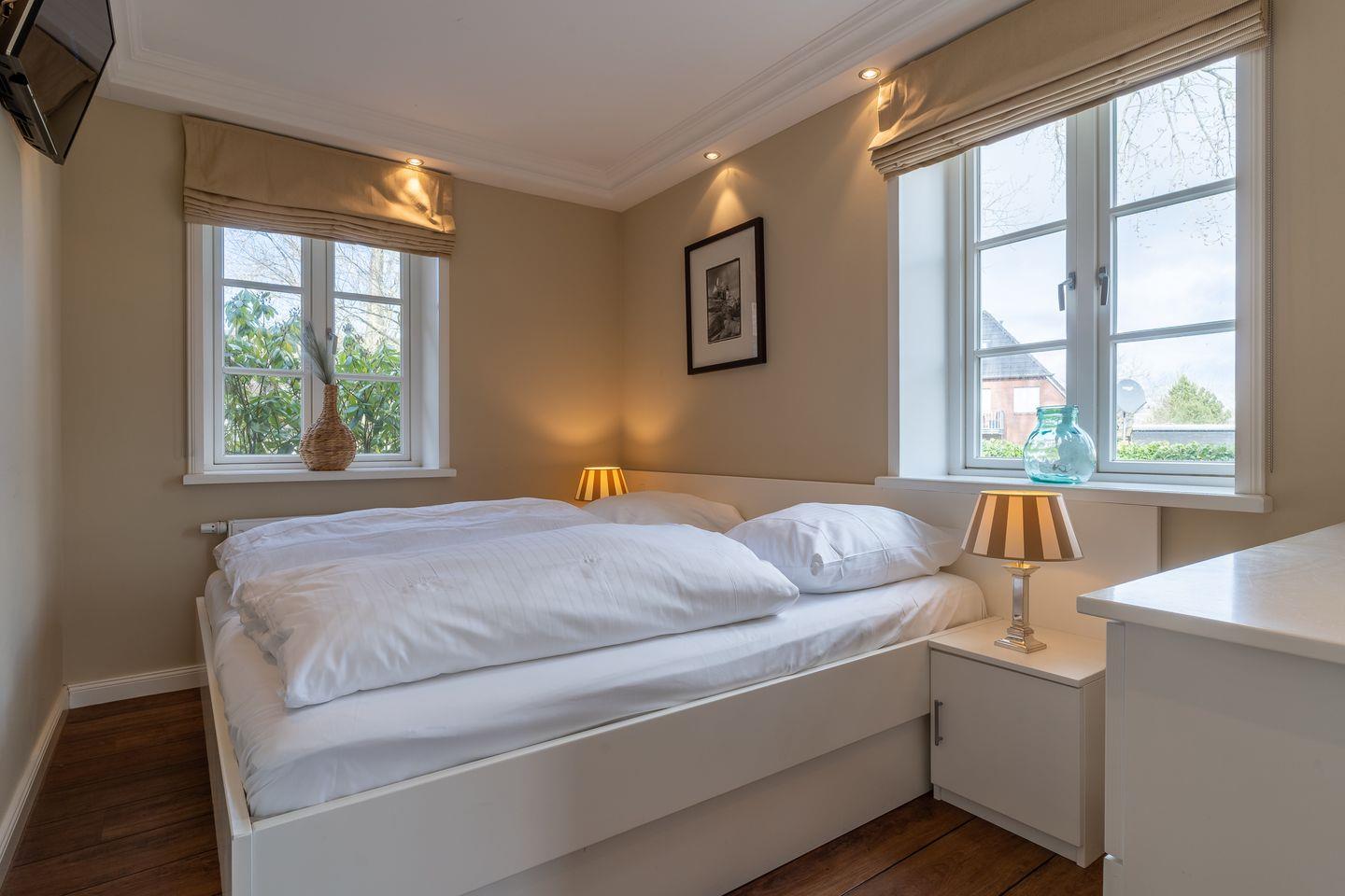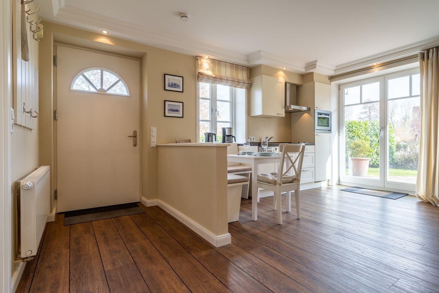 Das wunderschöne Apartment unter Reet wurde mit exklusiven Möbeln ausgestattet und bietet großzügigen Platz für 2 Personen. Das Grundstück mit Stellplatz und einer eigenen Terrassen inklusive Gartenmöbeln und Strandkorb wurde mit hübschen Pflanzen und einem Friesenwall angelegt. Das Apartment befindet sich im Erdgeschoss und verfügt über ca. 45 m² Wohnfläche und teilt sich wie folgt auf: Ein großzügiger Wohnraum mit einer offenen Küche und einem gemütlichen Essbereich. Die Küche ist mit hochwertigen Geräten voll ausgestattet. Ein separates Duschbad bietet jeden Komfort. Im stilvollen Schlafzimmer mit Doppelbett 1,8 x 2,0 m können Sie herrlich entspannen. Mit viel Liebe zum Detail wurde großen Wert auf die Inneneinrichtung gelegt. Das Apartment verfügt über große Fenster und ist somit herrlich lichtdurchflutet.