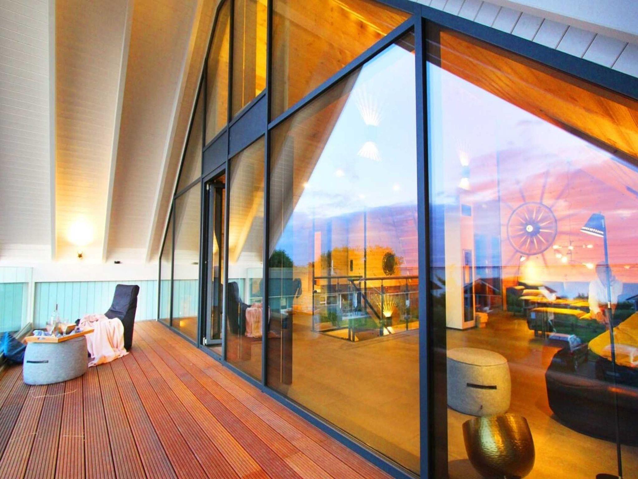 In der unteren Etage ist ein großer Essbereich inkl. großer Südterrasse und in der oberen Etage ein großer Wohnbereich mit großem Balkon nach Dänemark.