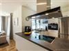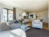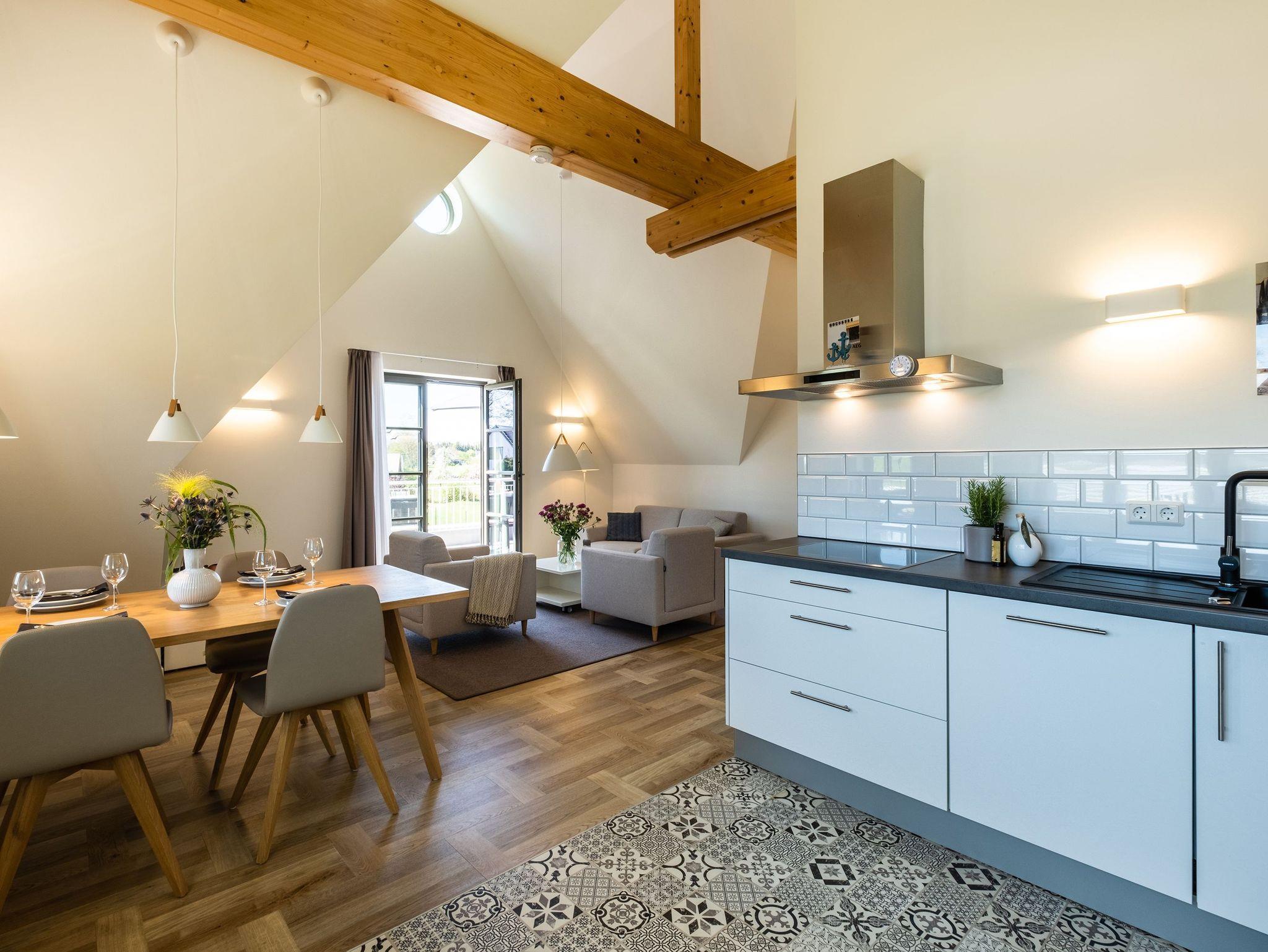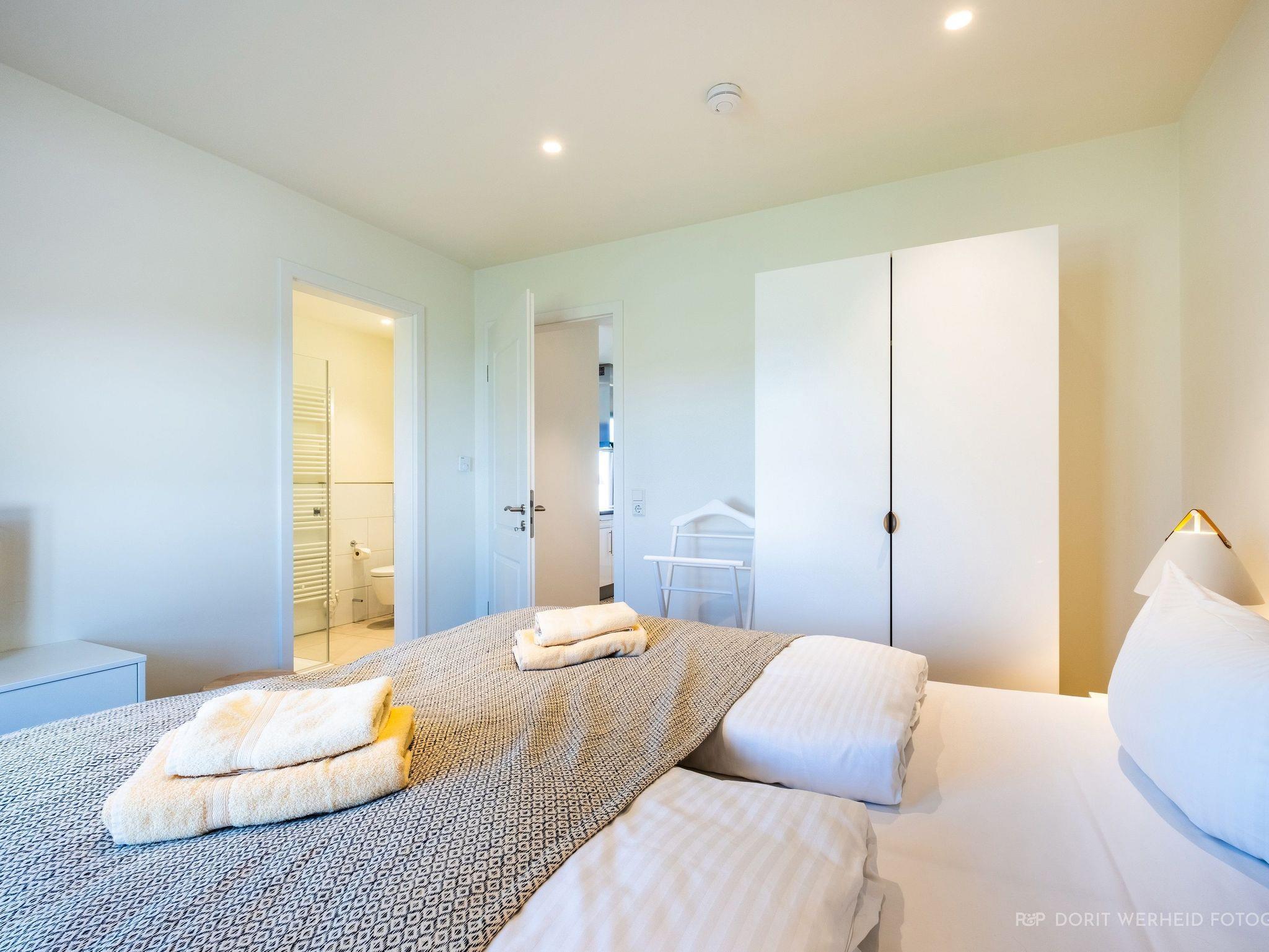 Die Wohnung ist sehr hochwertig ausgestattet. Sie verfügt über eine komplett eingerichtete Einbauküche mit Spülmaschine, Mikrowelle, Induktionsherd, großem Kühlschrank mit separatem Gefrierabteil und Kaffeevollautomat. Ebenfalls verfügt die Wohnung über eine Waschmaschine. Der Wohnraum bietet durch die großzügige Verglasung einen weiten Blick über die Felder und das Haff. Es gibt zwei Terrassen (30m²) und einen großen Garten, die nach Süden ausgerichtet sind. Zwei große Bäder sind mit einer bodentiefen Dusche mit Glastrennung ausgestattet.