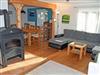 Es ist ca. 120 qm groß, hat Platz für maximal 10 Erwachsene und zwei Kinder bis 3 J. im Kinderreisebett. Im Erdgeschoss liegt der Wohnraum mit bequemer Sitzcouch mit Tisch und einem modernen Flachbild-TV-Gerät. Ein Kamin sorgt auch in der kühleren Jahreszeit für Behaglichkeit. Hier steht auch ein großer Esstisch mit Stühlen.
