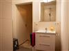 Das Badezimmer ist mit einer offenen Dusche, WC, Waschbecken und einem Handtuchtrockner ausgestattet.