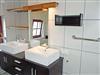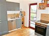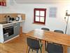 Die moderne separate Küche ist mit einem Ceranfeld-Herd, Backofen, Wasserkocher, Kaffeemaschine, Toaster und Kühlschrank mit Gefrierfach komplett ausgestattet. Hier steht auch ein Esstisch mit Sitzgelegenheiten.
