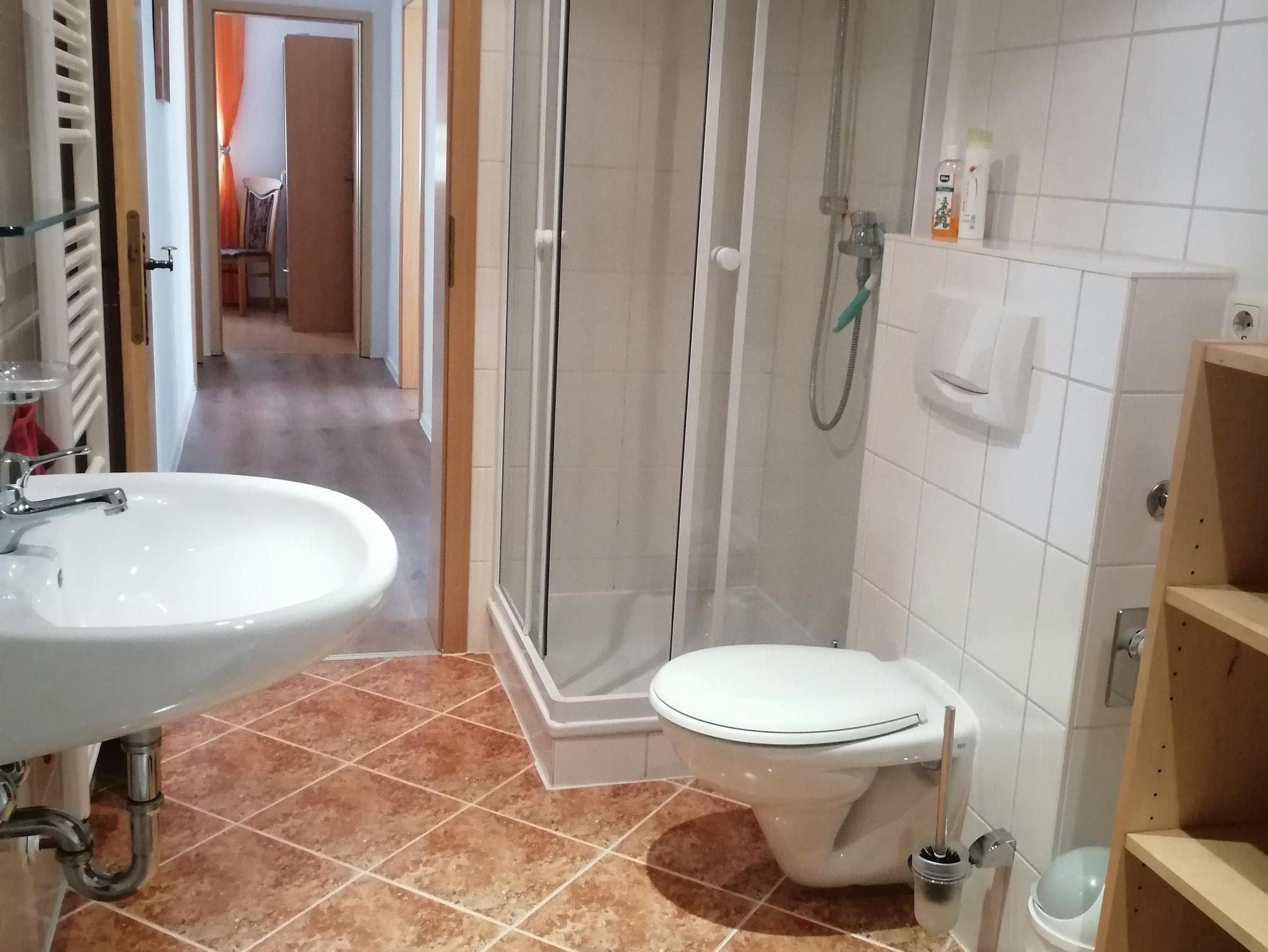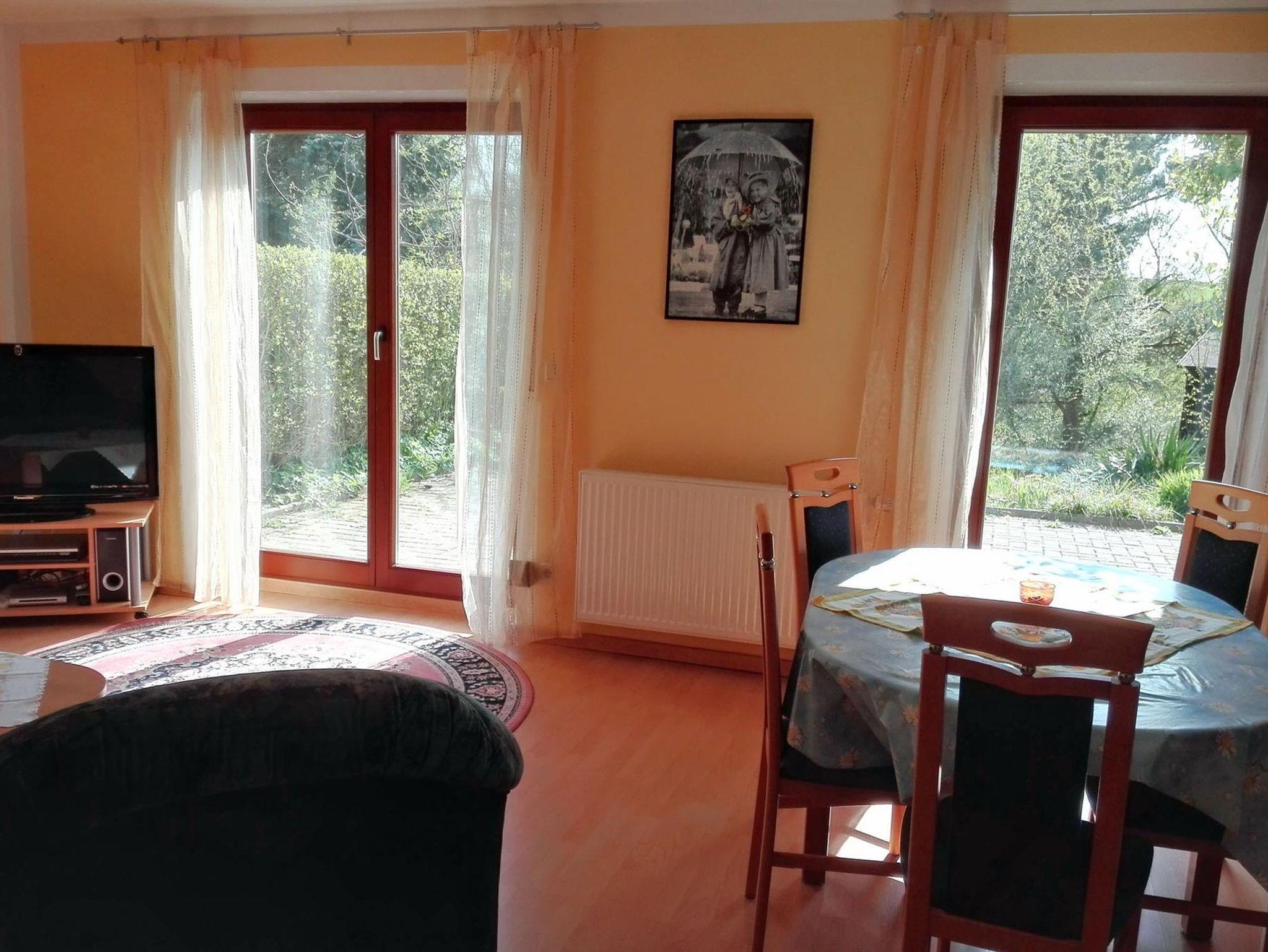 Die Wohnung ist angenehm und hat einen idealen Schnitt. Alle Zimmer gehen einzeln vom Flur ab. Zwei ausreichend große Schlafzimmer mit je einem Doppelbett, die Einrichtung schlicht,modern und freundlich. Das Wohnzimmer ist groß und überaus hell, große Eckcouch, mit dunklem Samt bezogen. Die sehr große Südterasse ist von hier aus sowie von der Wohnungtür direkt zu betreten. Blick in den Garten und hangabwärts auf das nächste Hausdach. Separate Küche; ältere Geräte und Küchenelemente; Kochutensilien ausreichend vorhanden; schönes Bad mit Badewanne und zusätzlicher Dusche. Optimales Quartier für eine Familie, Grundstück allerdings nicht abgeschlossen. Die berufstätige Vermieterin mit zwei fast erwachsenen Kindern ist freundlich und unkompliziert. Ruhige Lage am oberen Ortsrand von Naundorf, weite Wiesen und Wald wenige Schritte entfernt, Wanderung direkt vom Haus aus zum nahen Bärenstein und Rauenstein, kindergeeignetes Klettergebiet "Labyrinth" nur wenige km entfernt. Auto sinnvoll, Fußweg zur S- Bahn 2km bergab, ca. 150 Höhenmeter.