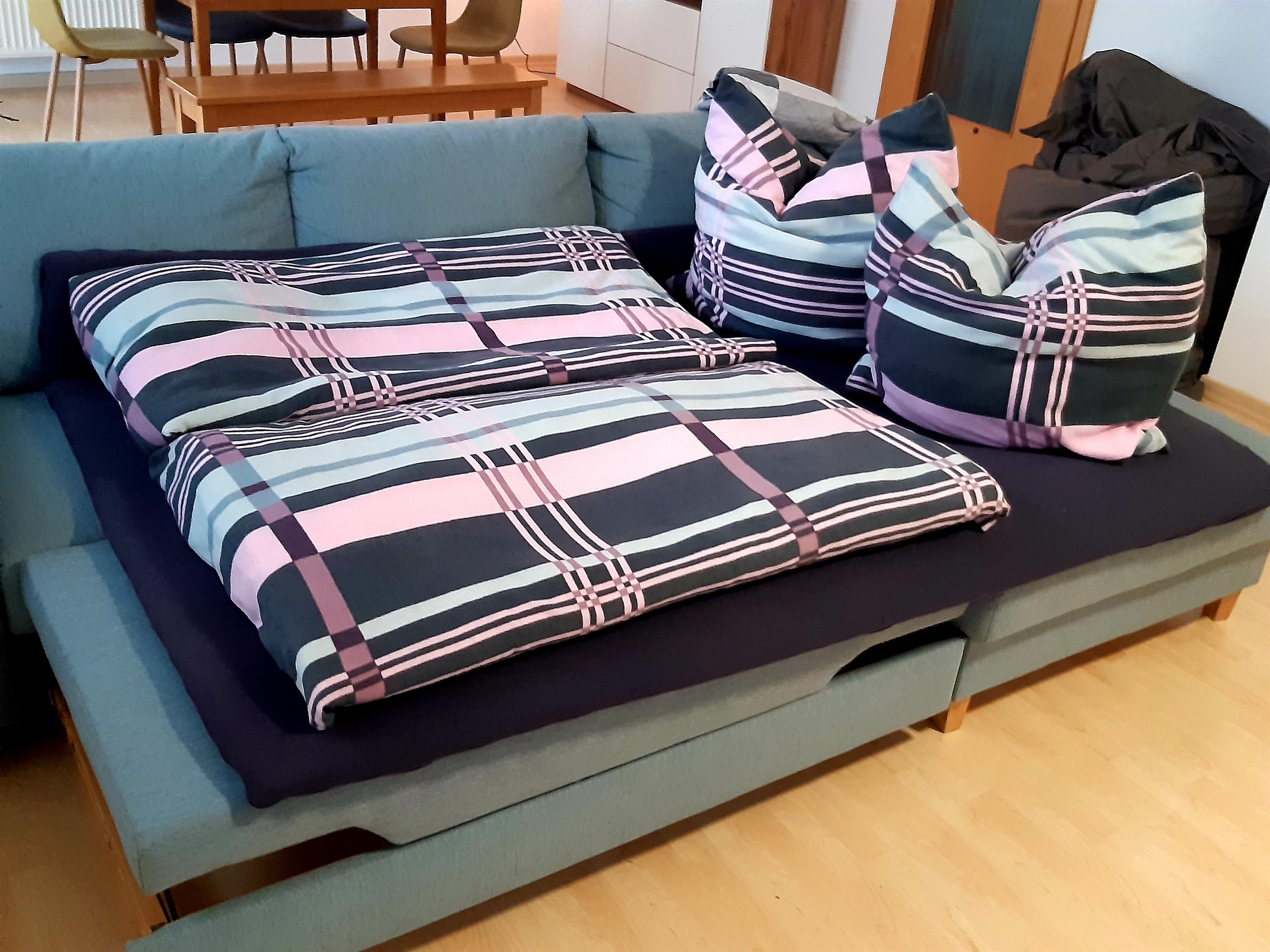 Die FeWo im Erdgeschoss ist für bis zu vier Personen ausgelegt. Hier haben wir ein Schlafzimmer mit Doppelbett und eine Queensize Schlafcouch, die dann im Wohn-/Esszimmer ausgezogen wird. Hier haben Sie direkten Zugang zur Sonnenterasse, der vollausgestatteten Küche und dem Badezimmer.