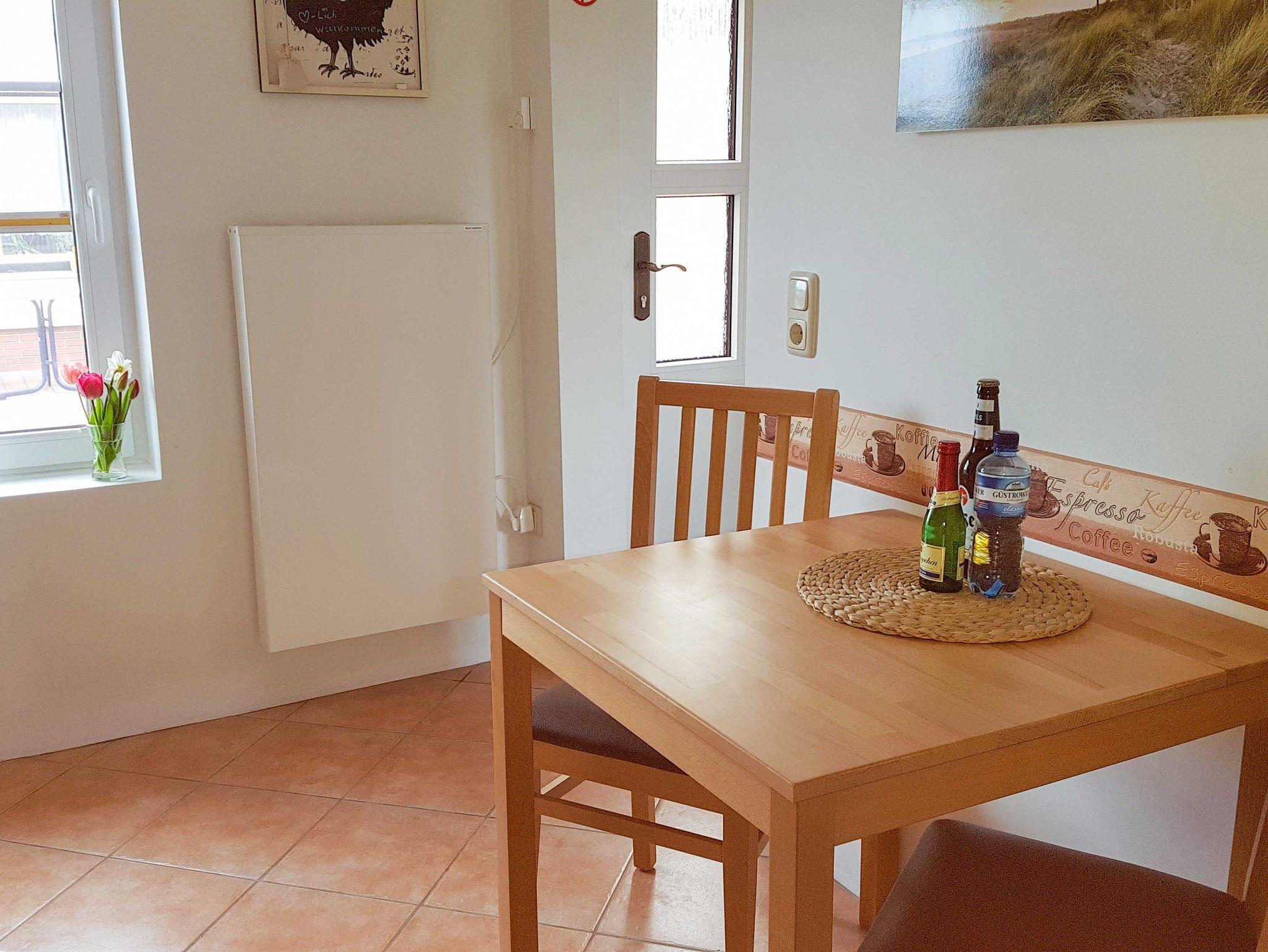 Die Ferienwohnung ist 45m² groß, ebenerdig und befindet im Anbau eines reetgedachten Hauses in Stahlbrode mit separatem Eingang. Die gemütlich und modern eingerichtete Ferienwohnung verfügt über ein Schlafzimmer, Wohnzimmer, Küche und einem Bad mit Dusche und WC. Im Schlafzimmer befindet sich ein Doppelbett (160x200) mit Nachtschränken, Kommode, Sitzbank und kleinem Kleiderschrank. Vom gemütlichen Wohnzimmer mit Ecksofa, Schwingsessel, Schreibtisch, Fernseher und Radio, haben Sie einen Blick über die Felder und im Frühjahr und Herbst sogar bis zum Wasser. Die Küche ist ausgestattet mit einer Küchenzeile, Herd mit Backofen, Kühlschrank mit Gefrierfach, Mikrowelle, Kaffeemaschine, Wasserkocher, Toaster, Eierkocher und einem Esstisch für zwei Personen. Der Garten sowie die Sitzecke und Grill können mitbenutzt werden. Vor dem Haus ist ein Pkw-Stellplatz vorhanden. In dieser Ferienwohnung wird Strom (auch Elektroheizung) vor Ort nach Verbrauch abgerechnet.