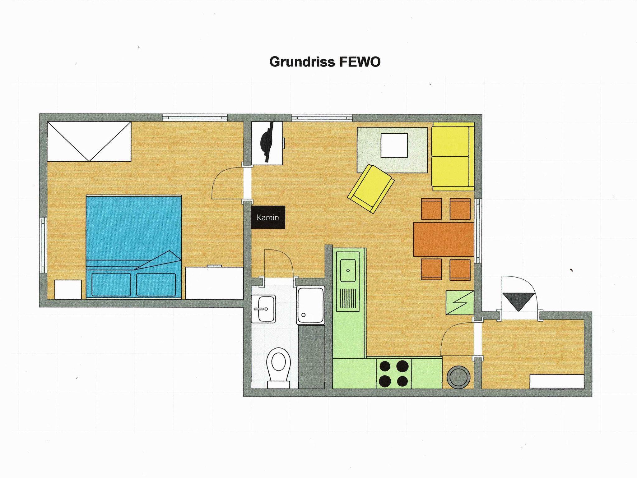 Die Ferienwohnung im Haupthaus hat ihren Eingang über eine großzügige Veranda. Sie ist für 2 bis 3 Personen geeignet. Die 45 m² große Wohnung verfügt über einen kleinen Flur, ein Wohnzimmer mit offener Küche, Essplatz und Kamin, ein Schlafzimmer und ein Bad mit Dusche/WC.