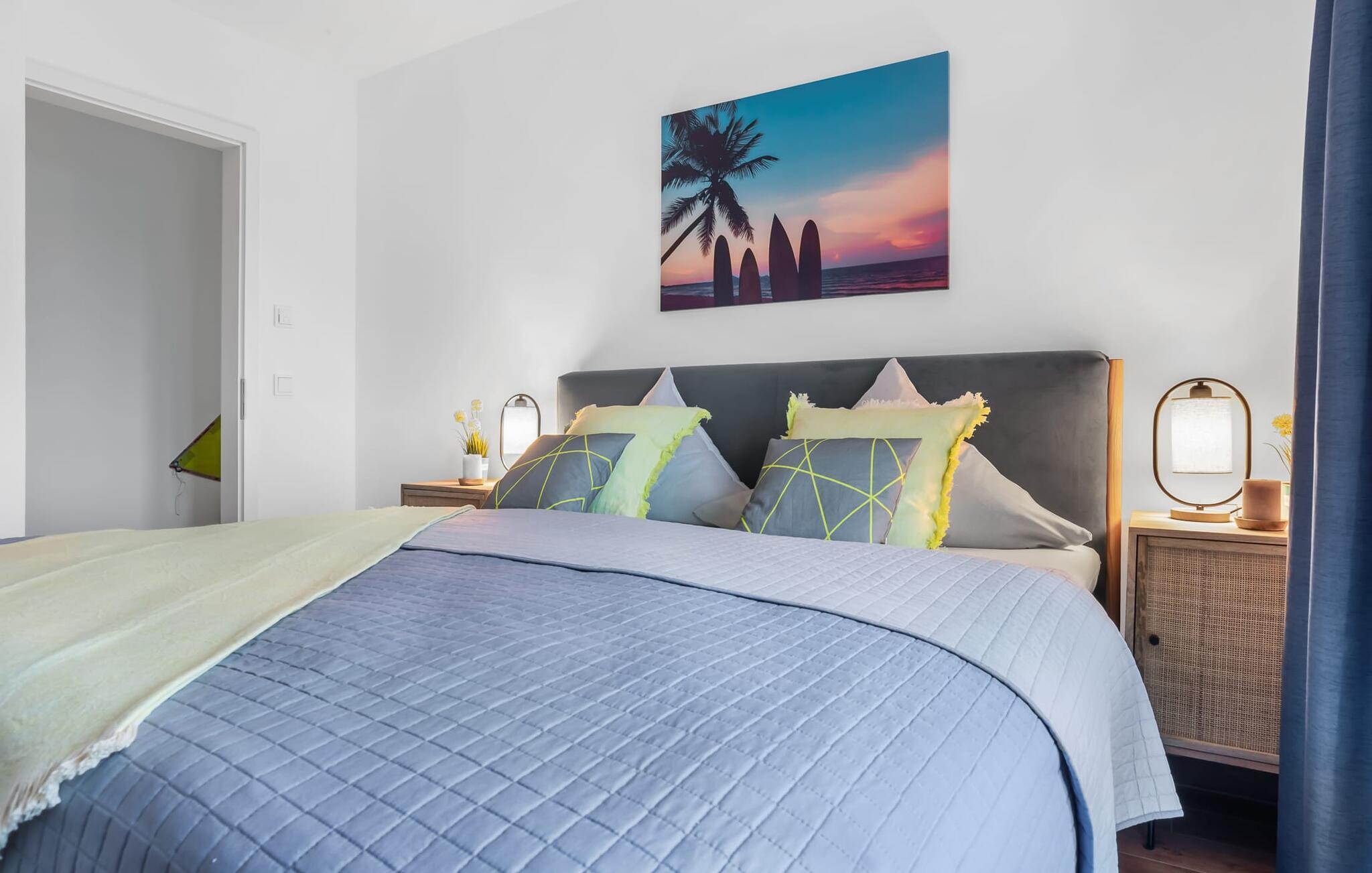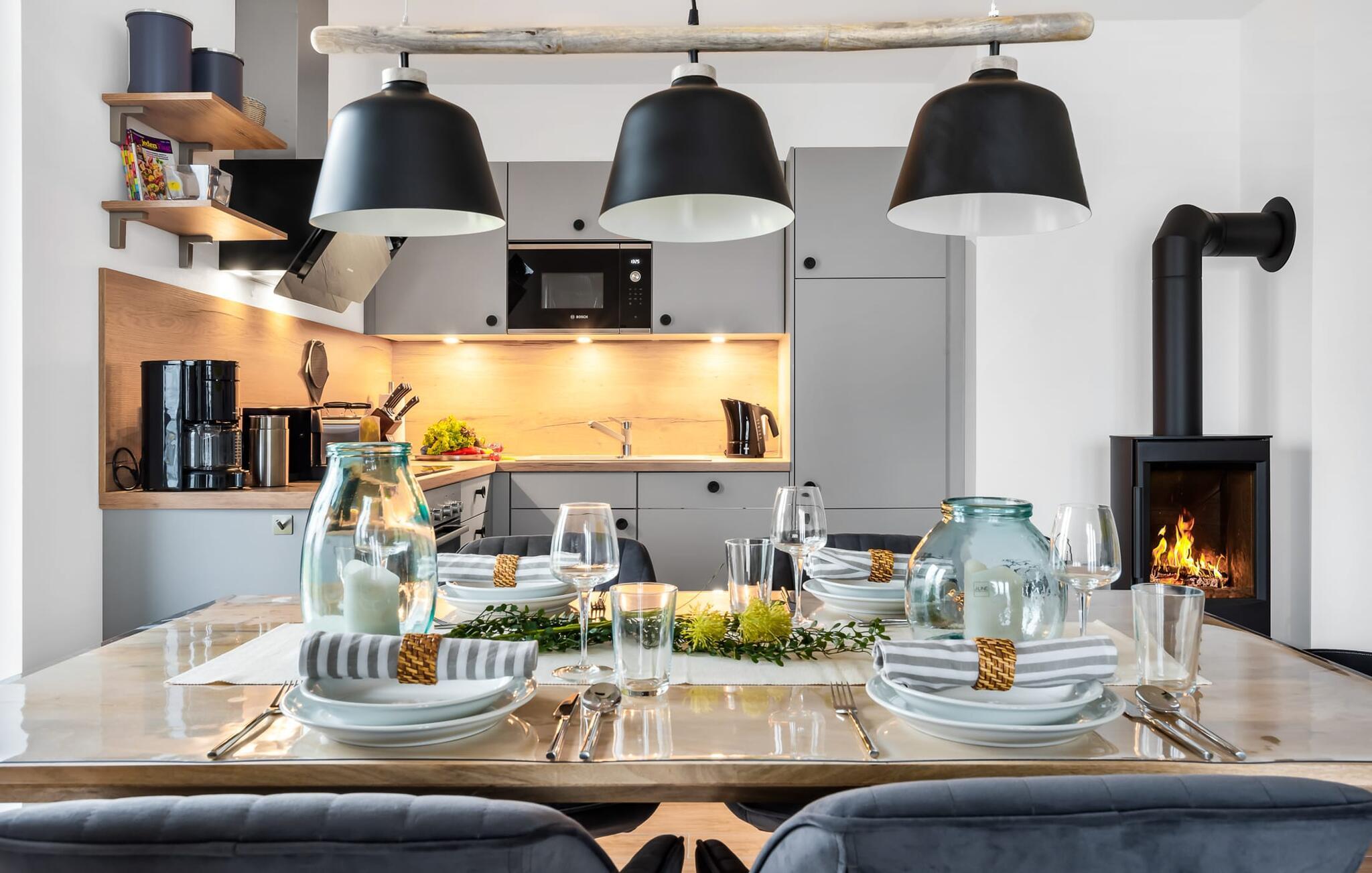 Im Wohnbereich dominiert die bequeme Wohnlandschaft mit Fernseher und Kaminofen, dem es gelingt, selbst Schmuddeltage in Kuscheltage zu verwandeln. Die Einrichtung der SURFERS LOUNGE ist nordisch gemütlich und wird mit frischen BoHo Akzenten unterstrichen.