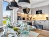 Der offene Wohn- und Essbereich mit integrierter Küche gestaltet sich aufgrund der bodentiefen Fensterfront lichtdurchflutet und die täglichen Sonnenaufgänge zu beobachten wird zu unvergesslichen Ferienerlebnissen. Von hier hat der Gast Zugang zur großen Terrasse. Der Blick auf Hafen, Wasser und Schiffe und die ferne Ostsee vermittelt das Gefühl für eine Weile Kapitän auf großer Fahrt zu sein. Die Terrasse erstreckt sich in verjüngender Form um die gesamte Wohnung und verstärkt das Gefühl an Deck zu sein. Stylische Outdoormöbel stehen bereit, um in dieser einmaligen Atmosphäre genussvoll zu dinieren oder einfach nur zu entspannen.