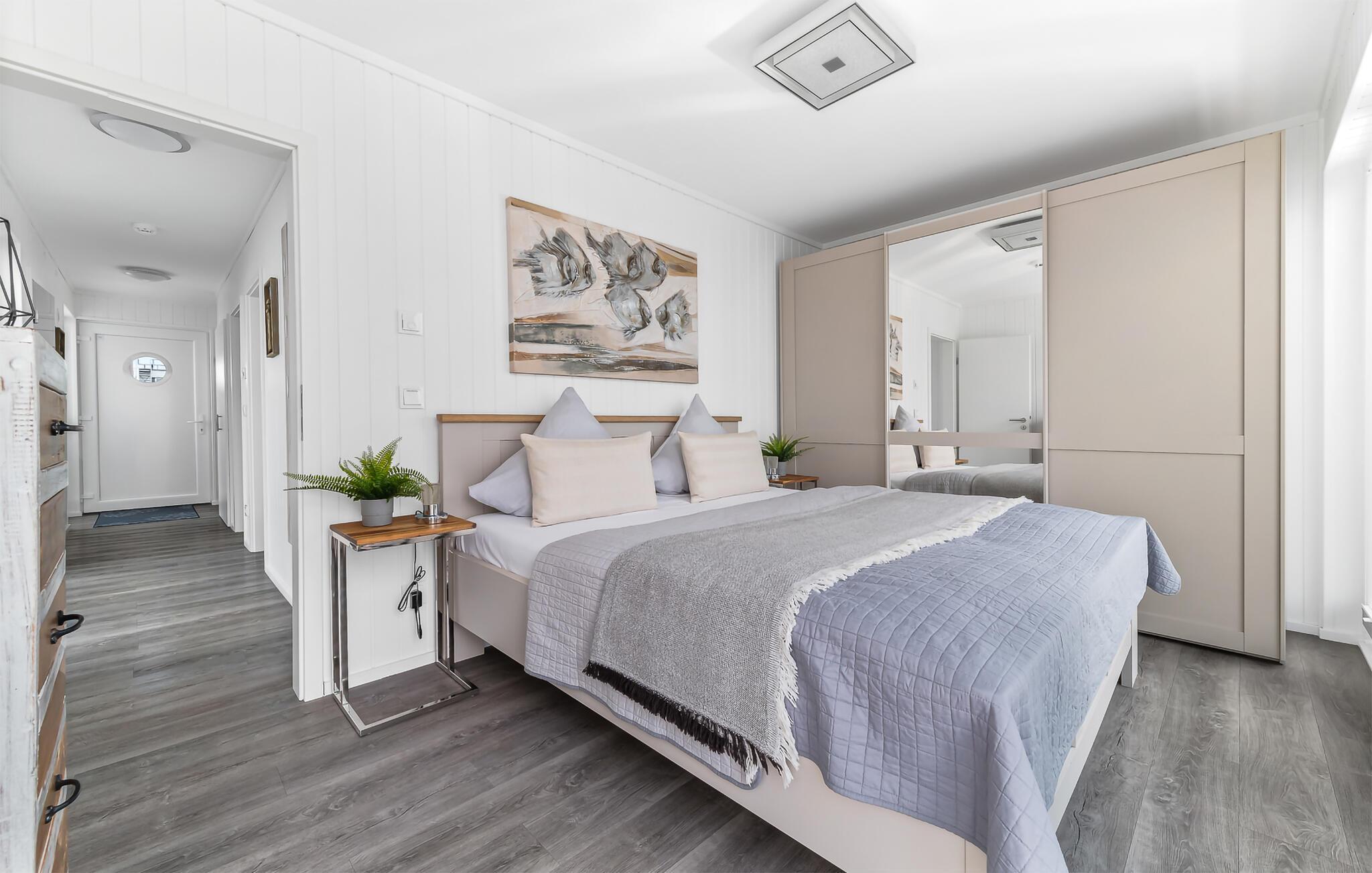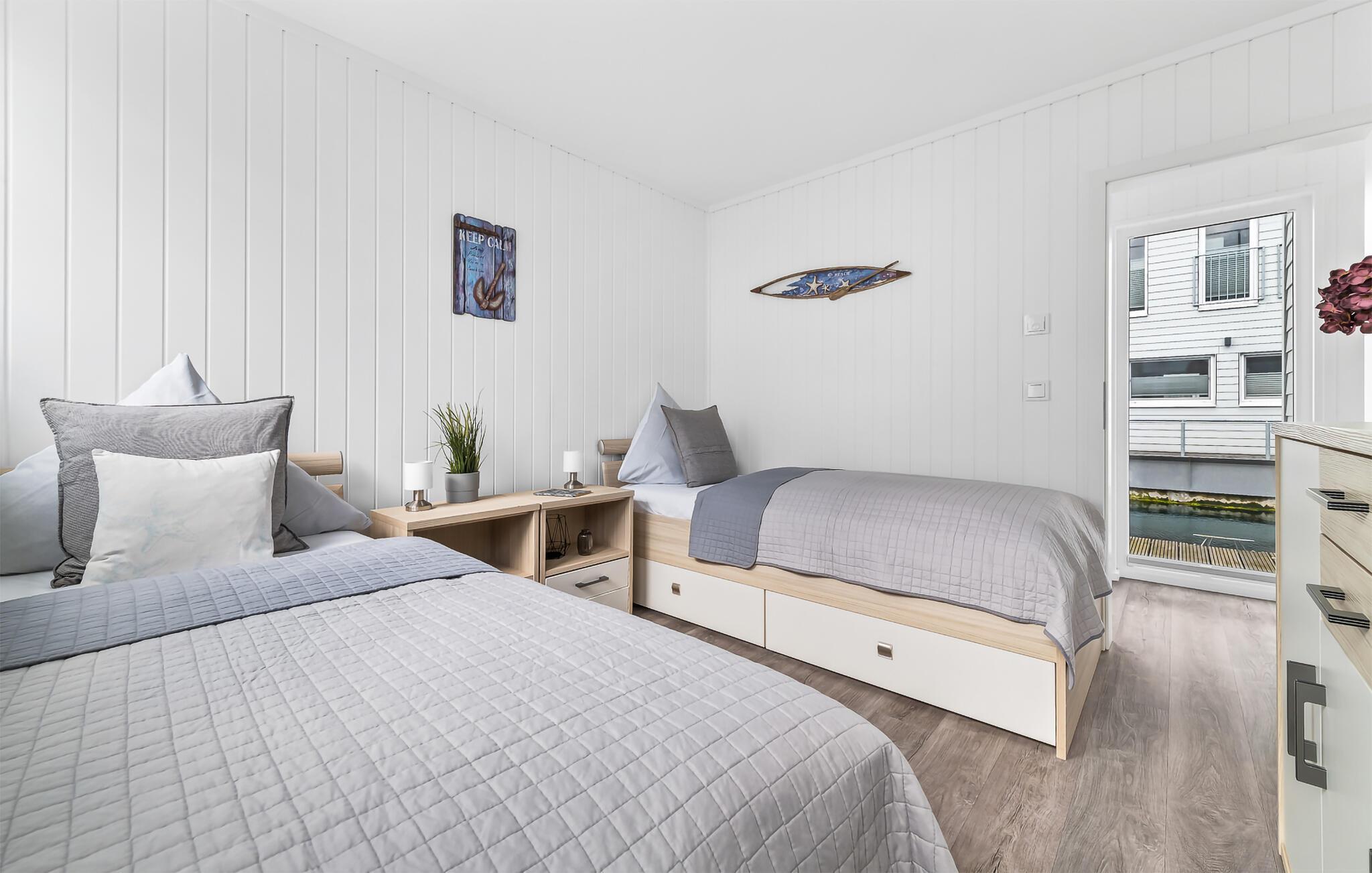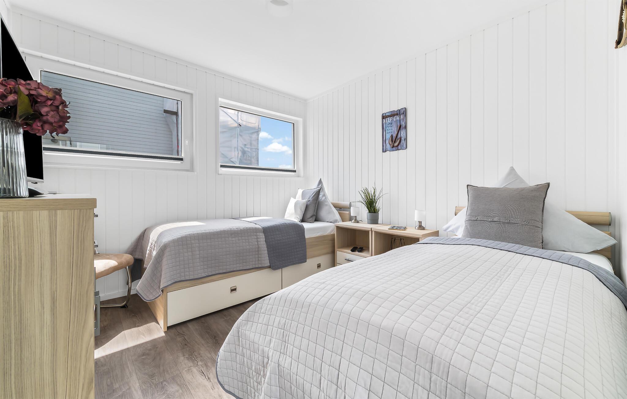 Die Ruheoase des Hauses befindet sich im Erdgeschoss mit zwei Schlafzimmern, einem Badezimmer und einer Sauna. Das Hauptschlafzimmer besticht durch bodentiefe Panoramafenster und eine umlaufende Terrasse, die einen faszinierenden Blick auf das Wasser bietet. Das zweite Schlafzimmer, ausgestattet mit zwei Einzelbetten und einem zusätzlichen TV, verspricht gemütliche Nächte und entspannte Stunden.