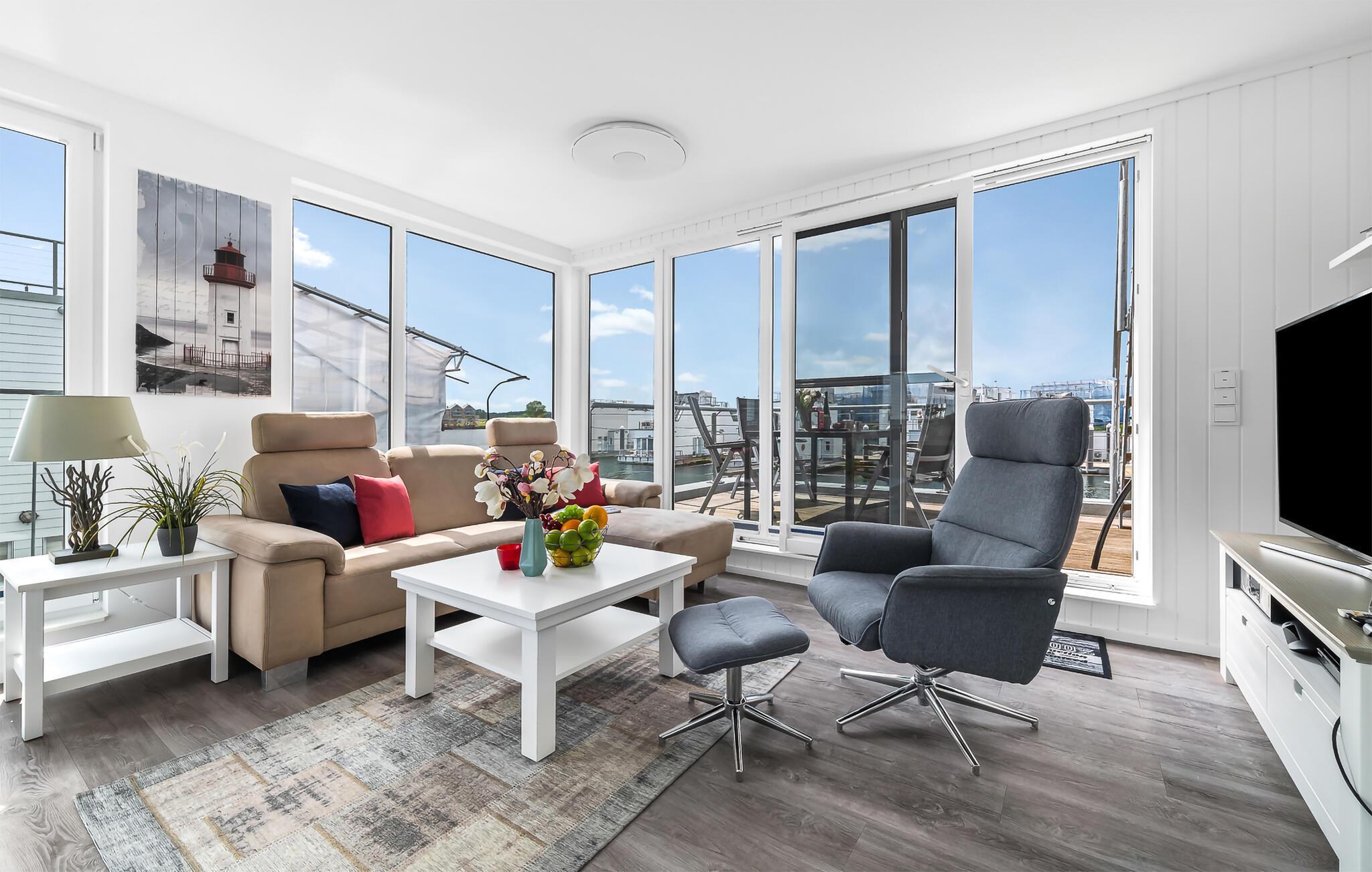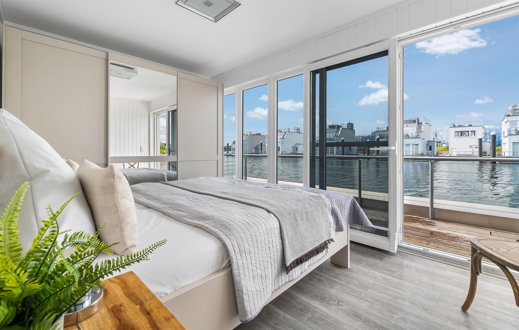 Erleben Sie Luxus und Entspannung in diesem einzigartigen schwimmenden Ferienhaus mit Panoramablick im OstseeResort Olpenitz.