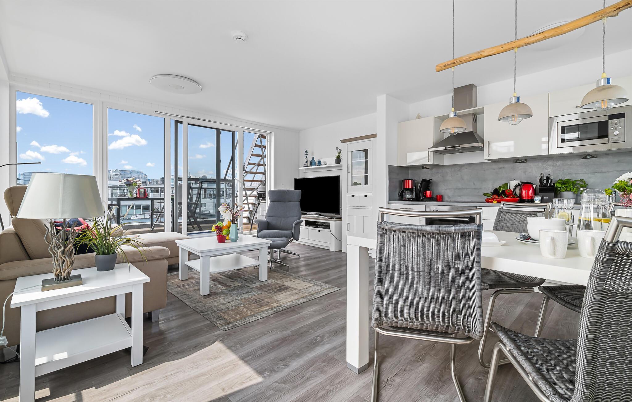 Dieses außergewöhnliche Urlaubserlebnis lädt euch dazu ein, die Langsamkeit des Lebens zu genießen, umgeben von der endlosen Weite des Meeres. Durch bodentiefe Panorama-Fensterfronten erstreckt sich vor euren Augen eine atemberaubende Kulisse, während die Dachterrasse mit 360-Grad-Blick auf Schlei, Ostsee und den Segel- und Sportboothafen spektakuläre Ausblicke verspricht.