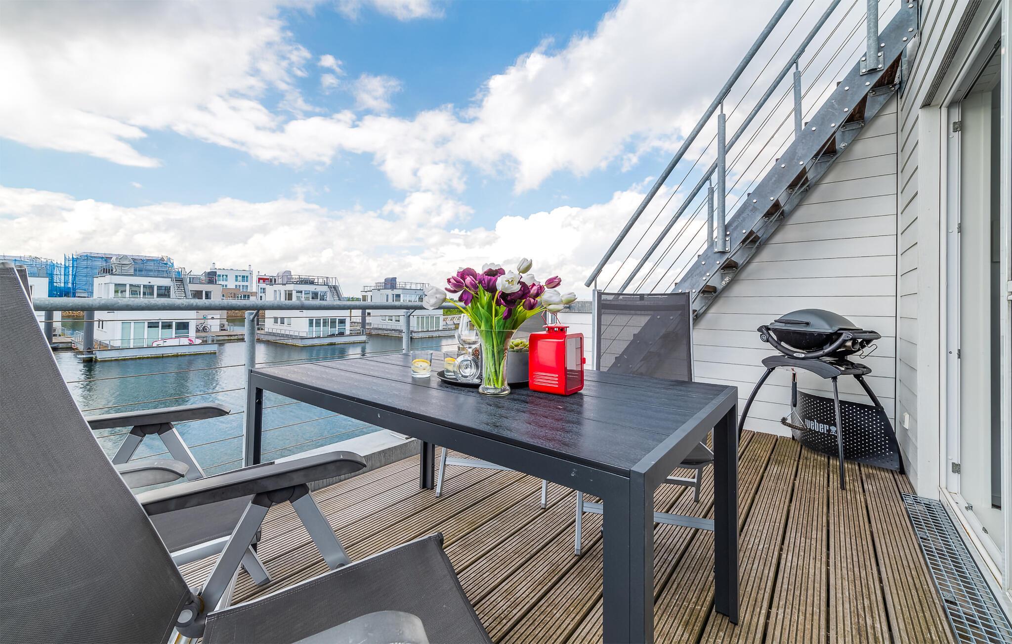 Das schwimmende Haus erstreckt sich über drei Ebenen, wobei das Obergeschoss mit einem offenen Wohn- und Essbereich punktet. Die voll ausgestattete Wohnküche und die angrenzende Terrasse bieten nicht nur kulinarische Freuden, sondern auch einen beeindruckenden Wasserblick. Von hier aus führt der Weg zur spektakulären Dachterrasse, ausgestattet mit hochwertigen Möbeln und einem Weber Elektrogrill, der ideale Ort, um das Urlaubsgefühl zu zelebrieren und atemberaubende Sonnenuntergänge zu erleben.