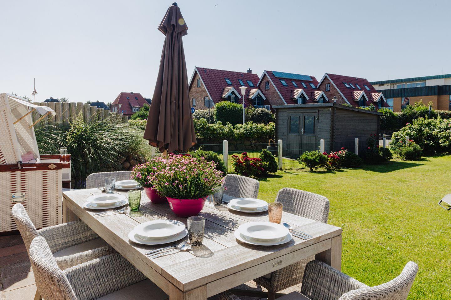 Genießen Sie sonnige Stunden auf Ihrer Südterrasse oder entspannen Sie im idyllischen Garten mit Gartenmöbeln und einem privaten Strandkorb.