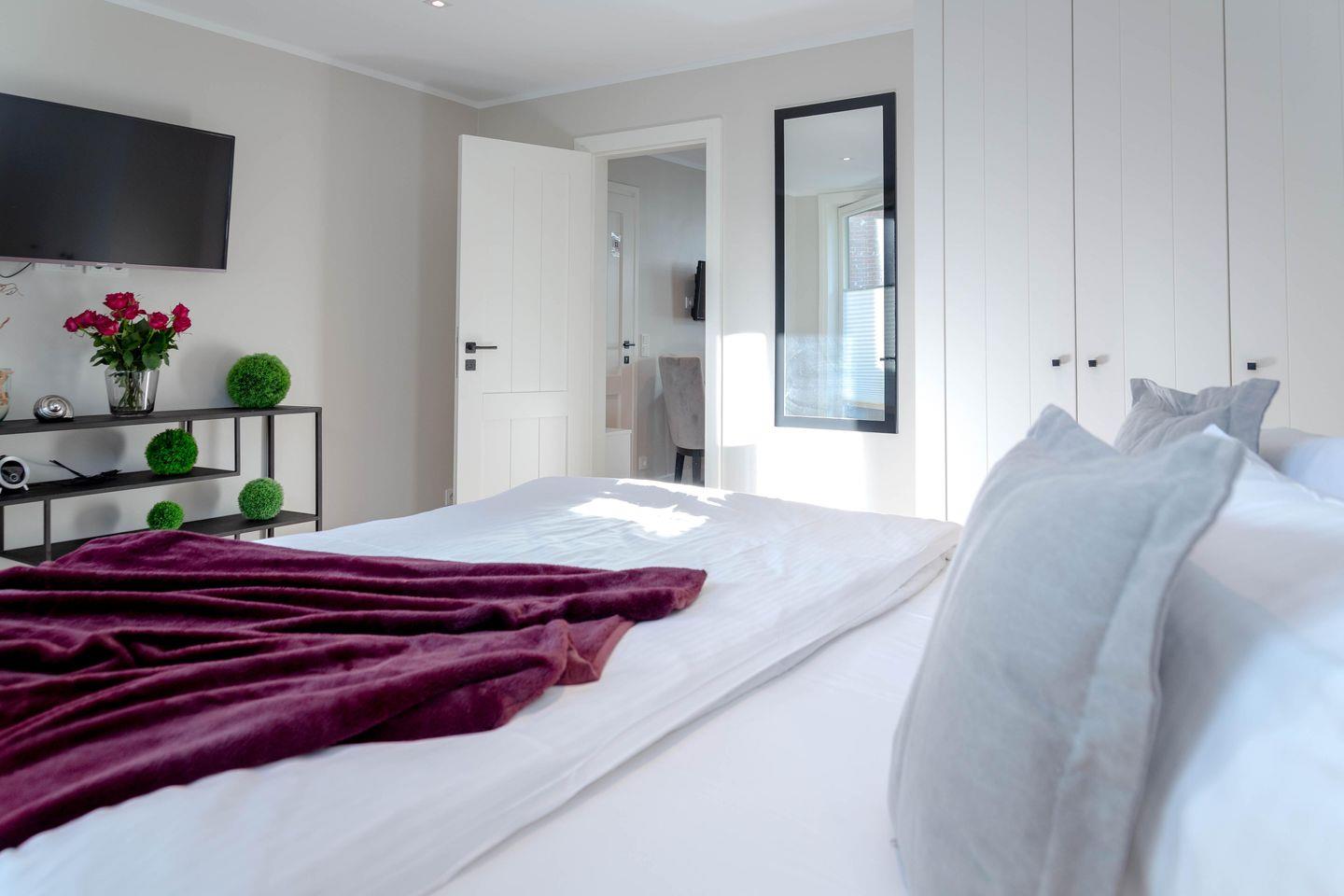 Im separaten Schlafzimmer finden Sie erholsamen Schlaf in einem komfortablen Boxspringbett und ausreichend Stauraum in großzügigen Einbauschränken. Das stilvolle Natursteinbad verfügt über eine moderne, bodentiefe Dusche – ein Ort der Ruhe und Entspannung.