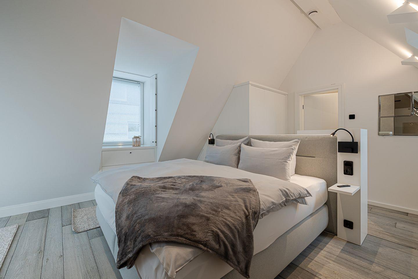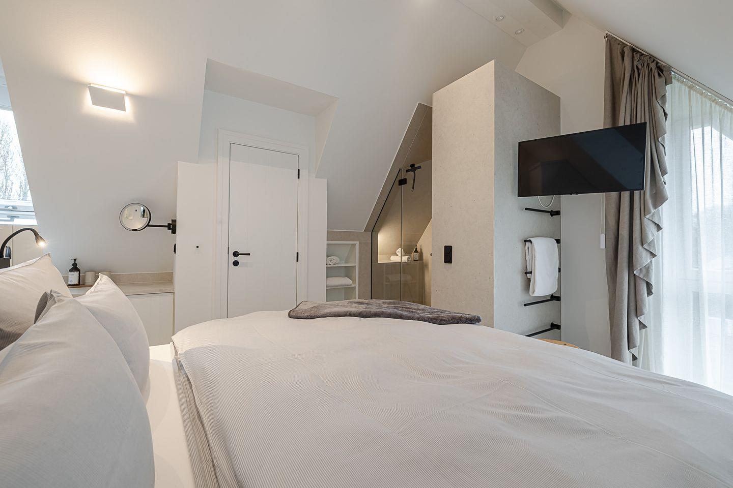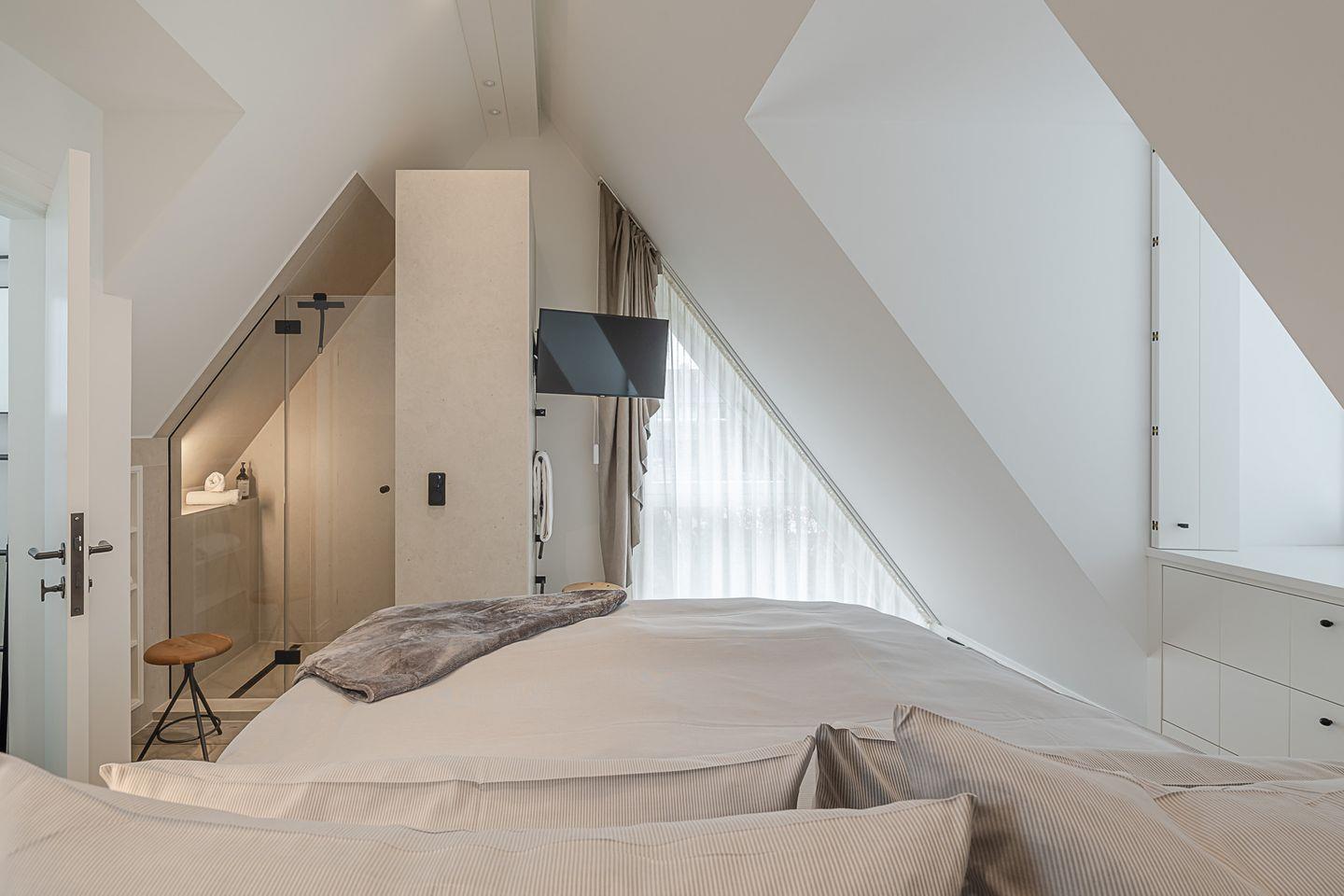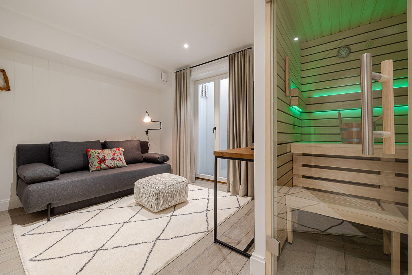 Im oberen Bereich des Hauses finden Sie zwei elegante Schlafzimmer. Das eine, mit einem großzügigen Boxspringbett (1,80 x 2,00 m) und einem luxuriösen Bad en Suite, bietet Ihnen absolute Privatsphäre und Komfort. Das andere Schlafzimmer, ebenso mit einem hochwertigen Boxspringbett (1,80 x 2,00 m), verwöhnt Sie mit einem Hauch von Exklusivität und ebenfalls einem eigenen TV. Im Souterrain erwartet Sie ein zusätzliches Schlafzimmer mit Schlafcouch – ideal für Gäste oder kleine Auszeiten. Hier befindet sich auch ein modernes Bad mit Dusche sowie eine private Sauna für die besonderen Momente der Entspannung.