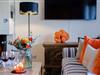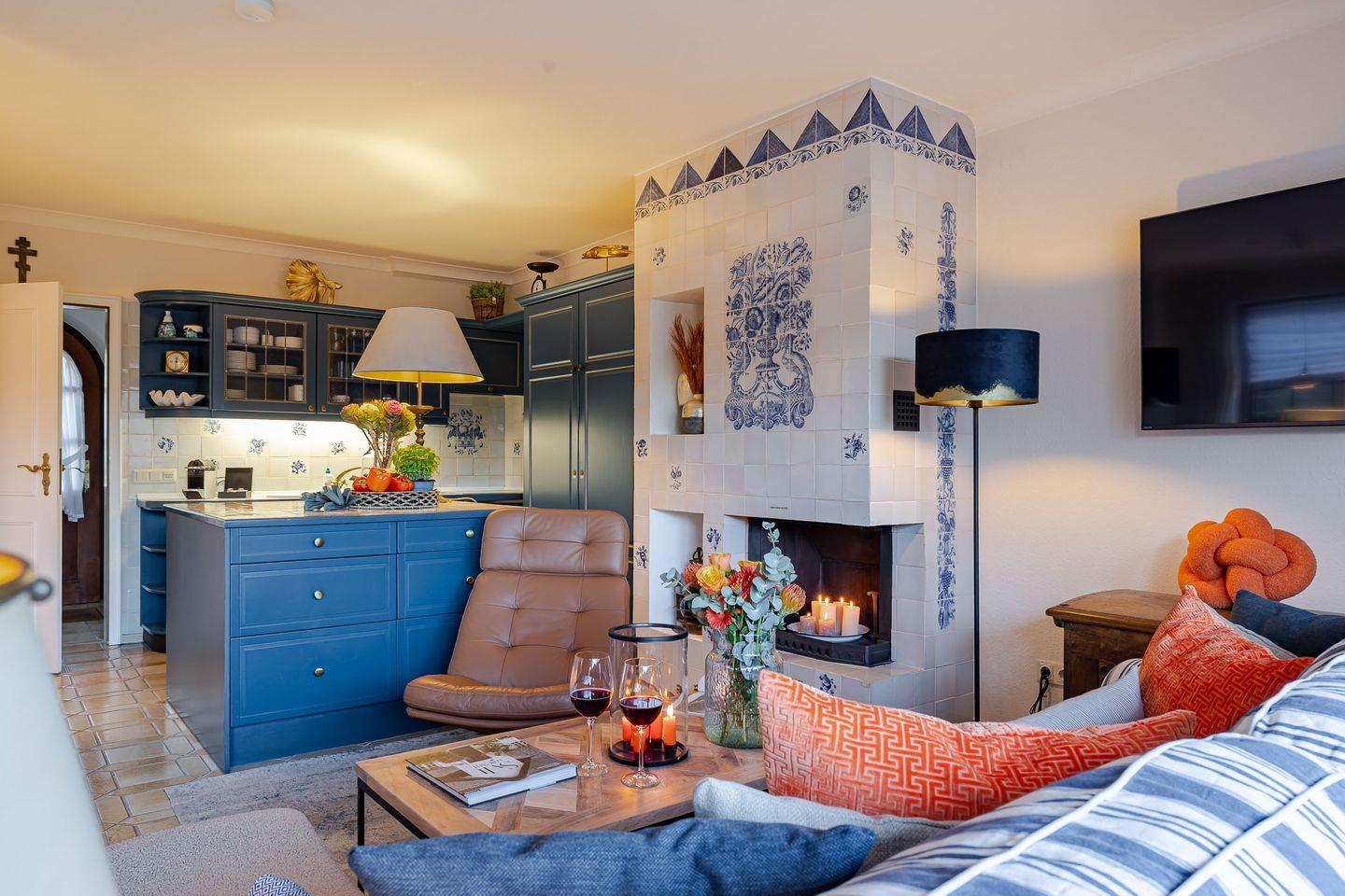 Die wunderschöne Landhausküche in Ozeanblau, die gemütliche Sofaecke und die warmen Farben schaffen innen ein Gefühl von Geborgenheit. Der Kamin ist dekorativ, zaubert aber mit seinen Kerzenlichtern eine stimmungsvolle Atmosphäre – besonders an kühleren Tagen. Auf dieser Ebene befinden sich zudem ein Vollbad sowie ein praktischer Waschraum, ideal für längere Aufenthalte, Strandtage und Reisen mit Kindern oder Hund.