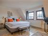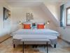 Unter dem Dach eröffnet sich ein weiterer, lichtdurchfluteter Rückzugsort: ein Schlafzimmer mit charmanten Schrägen, ebenfalls mit einem 160x200 cm Bett, viel Stauraum und einem kleinen Arbeitsplatz direkt am Dachfenster, der den Blick in den Himmel freigibt. Ein eigenes Badezimmer mit Badewanne verleiht diesem Bereich eine wohltuend private Note.