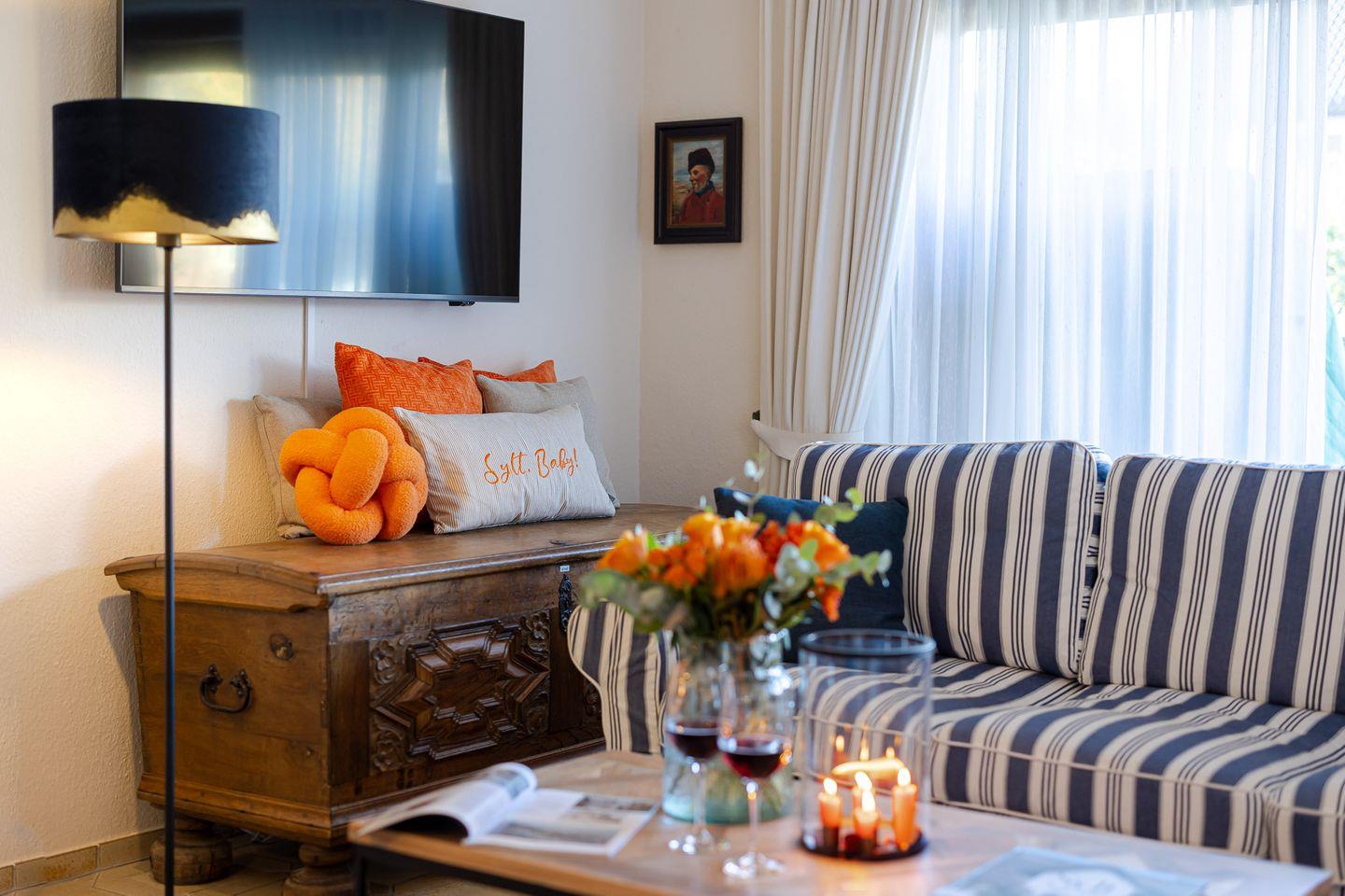 Auf der oberen Etage liegen die Schlafräume, die mit viel Liebe zum Detail gestaltet wurden. Das großzügige Hauptschlafzimmer überzeugt mit seiner freundlichen Ausstrahlung, viel Platz und einem komfortablen Boxspringbett in 180x200 cm, das für erholsame Nächte sorgt. Gleich daneben befindet sich ein kleineres, besonders gemütliches Schlafzimmer mit einem 160x200 cm Bett, maritimen Akzenten und warmen Stoffen – perfekt für Paare, Freunde oder ältere Kinder.