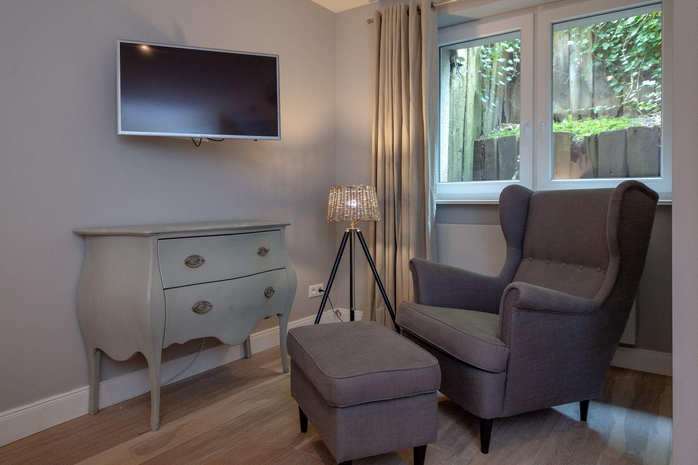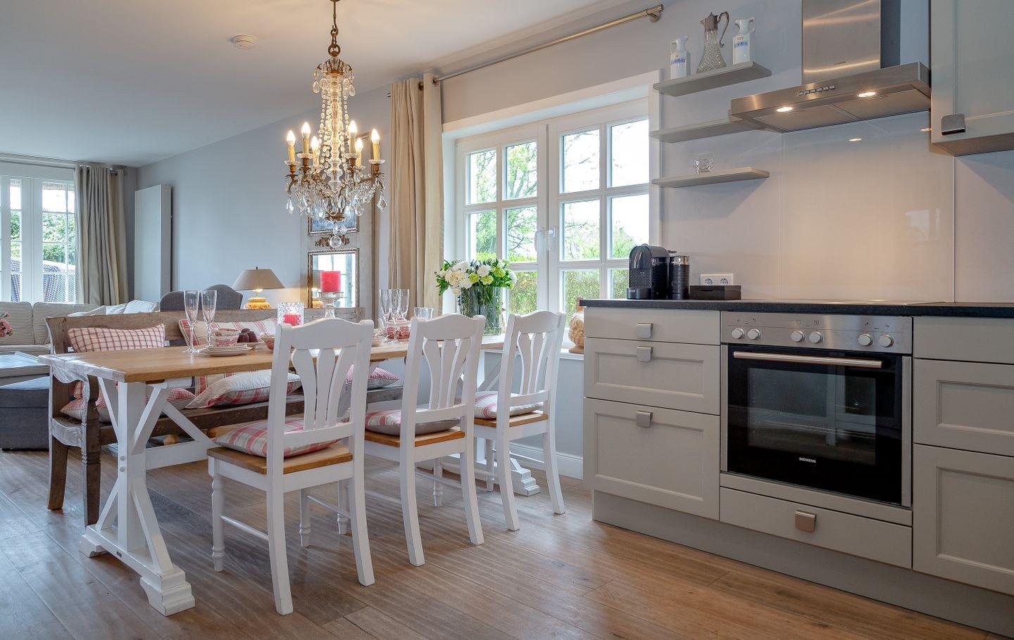 Der offene, stilvolle Essbereich und die angrenzende hochwertige Küche inklusive Filterkaffeemaschine sind ideal für gesellige Momente. Ihre Terrasse ist von einem idyllischen, eingewachsenen Garten umgeben und bietet mit Gartenmöbeln und einem gemütlichen Strandkorb den perfekten Platz für erholsame Stunden an der frischen Luft.